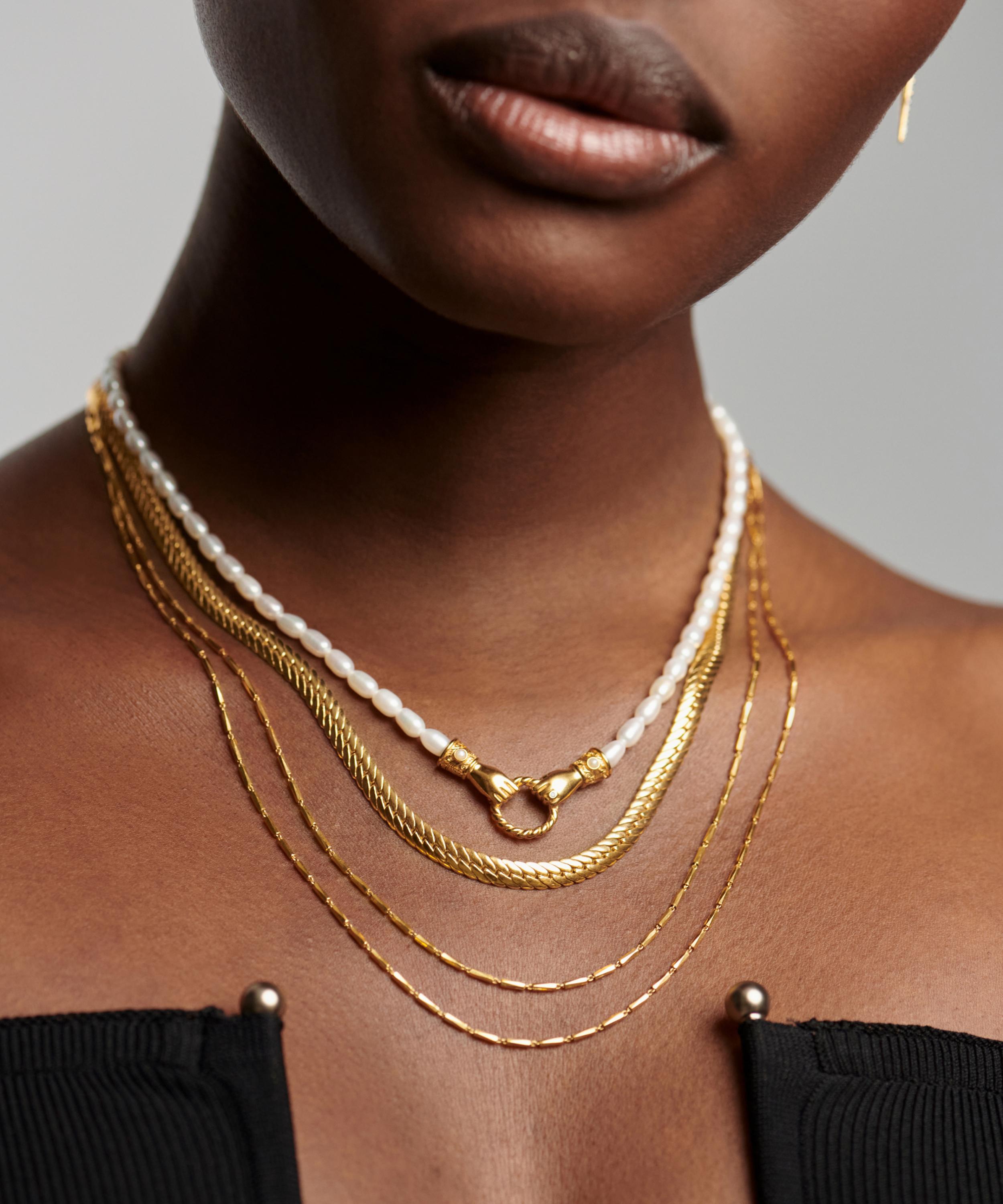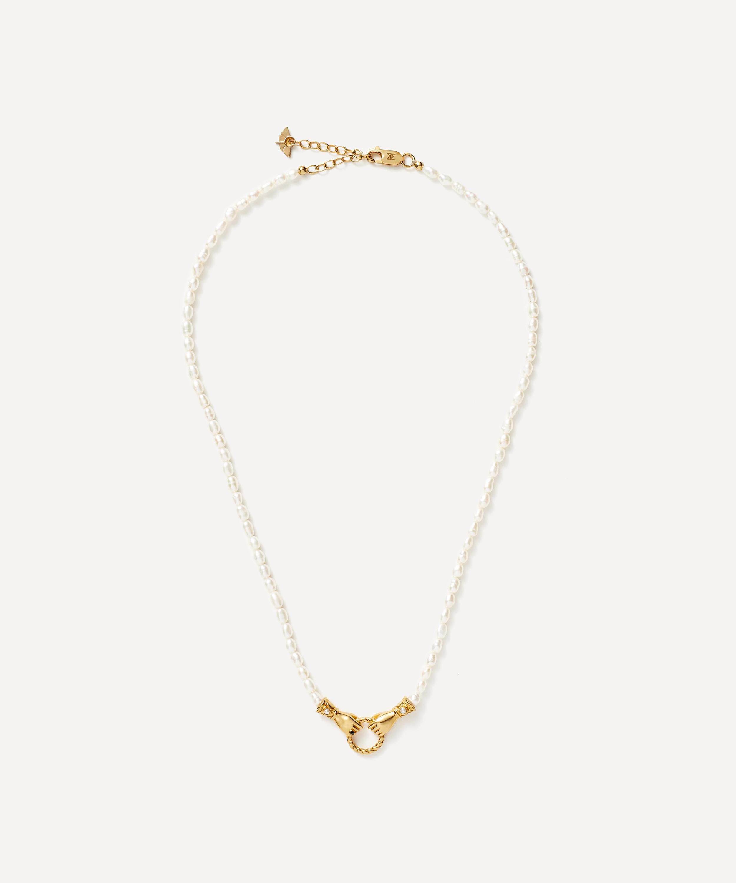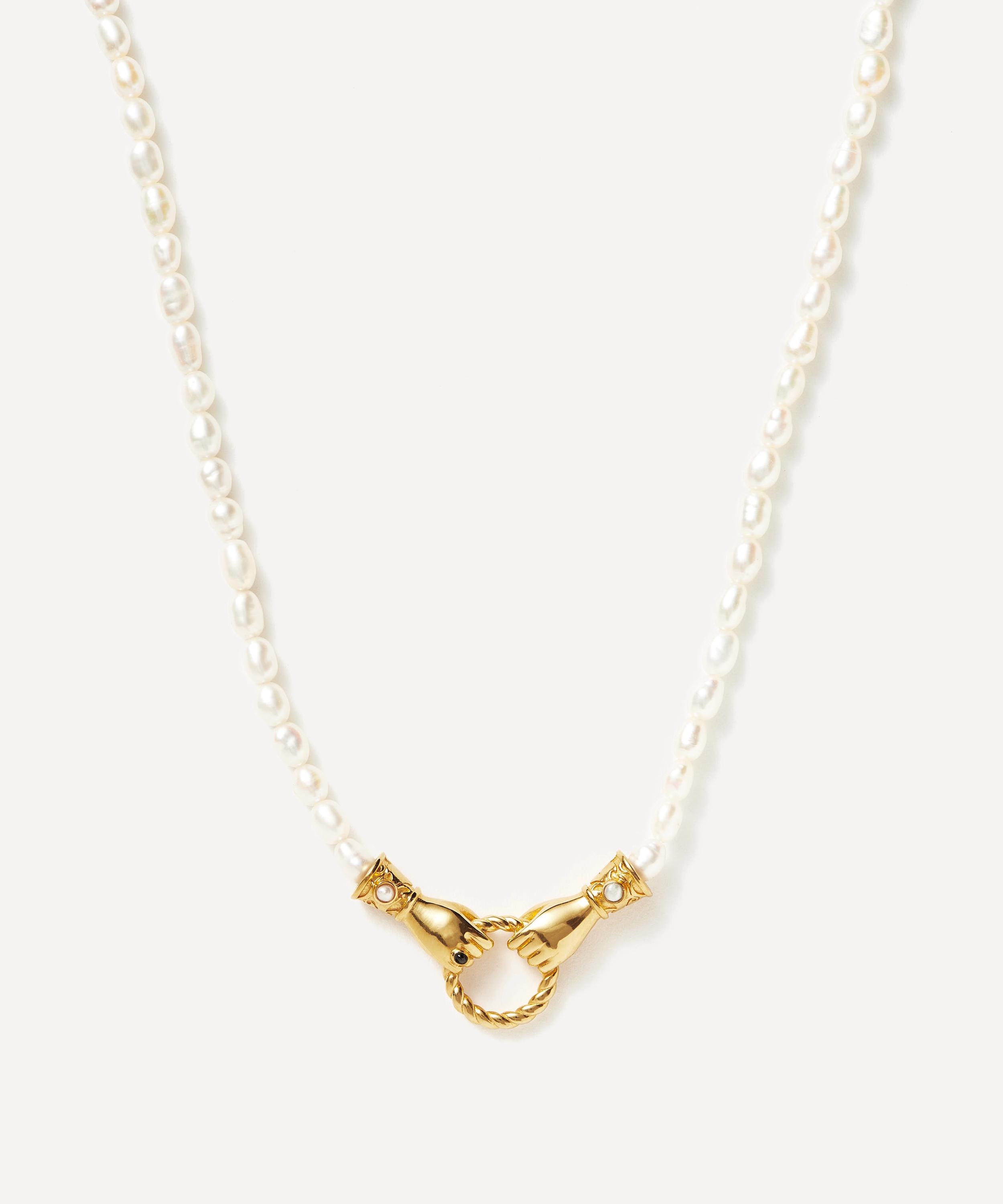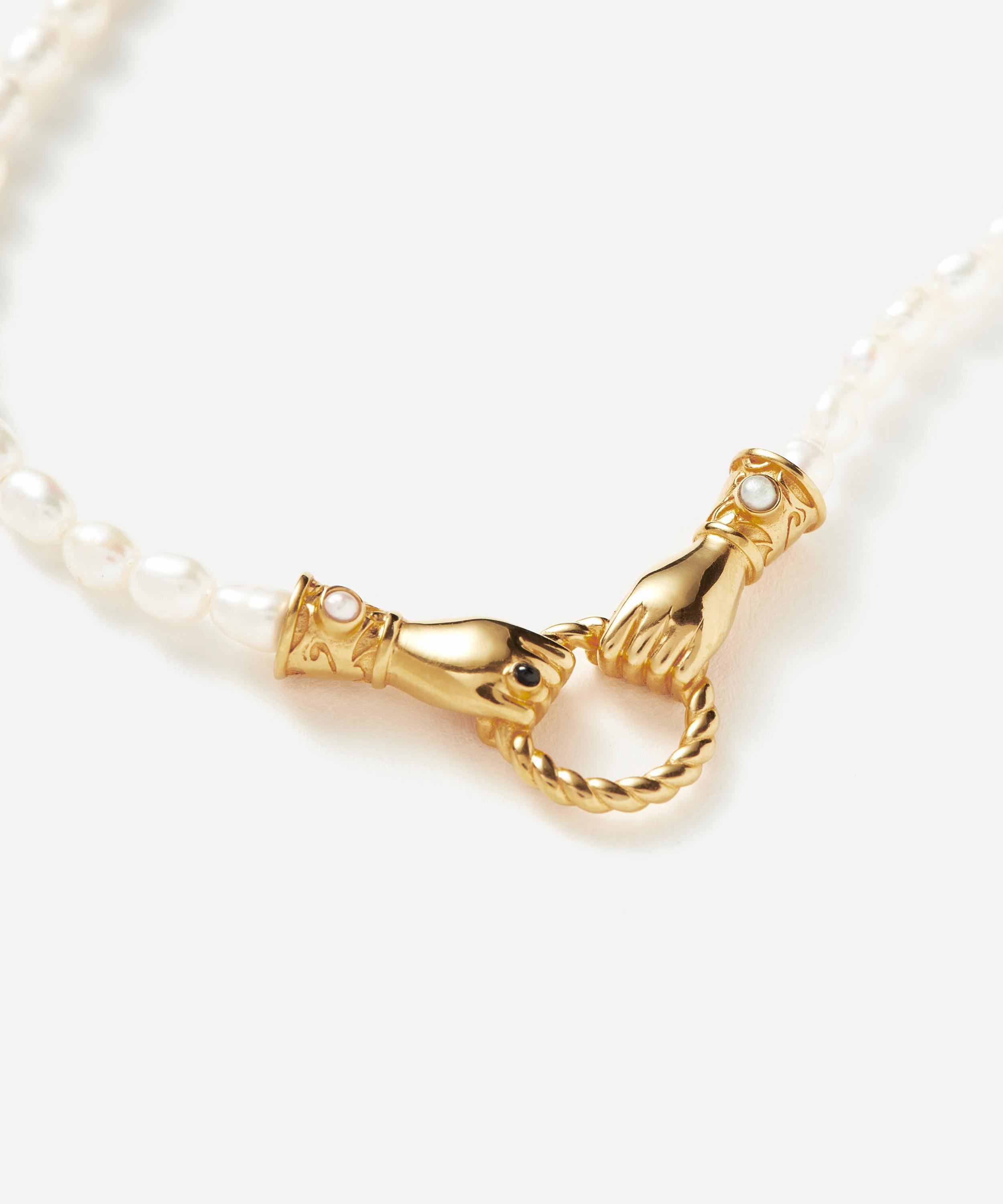 Embrace your individuality with the In Good Hands necklace from the Harris Reed x Missoma collaboration collection. Crafted from 18ct gold-plated brass, it features an opulent string of white seed pearls, accented by two Georgian-inspired hands, each holding a twisted ring and detailed with a cabochon pearl set cuff. Wear it alone or with other edgy necklaces for a curation that speaks to your unique sense of style.