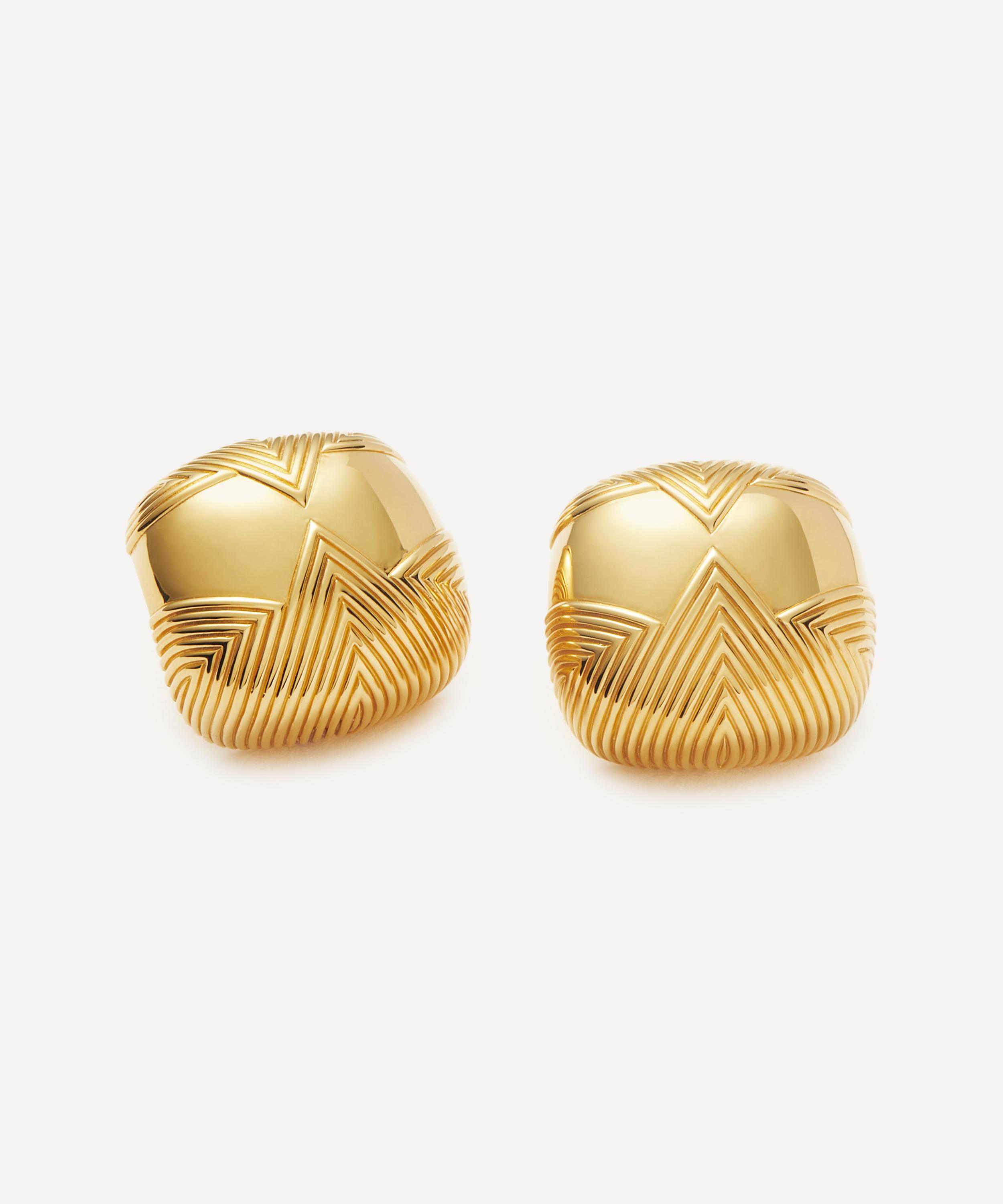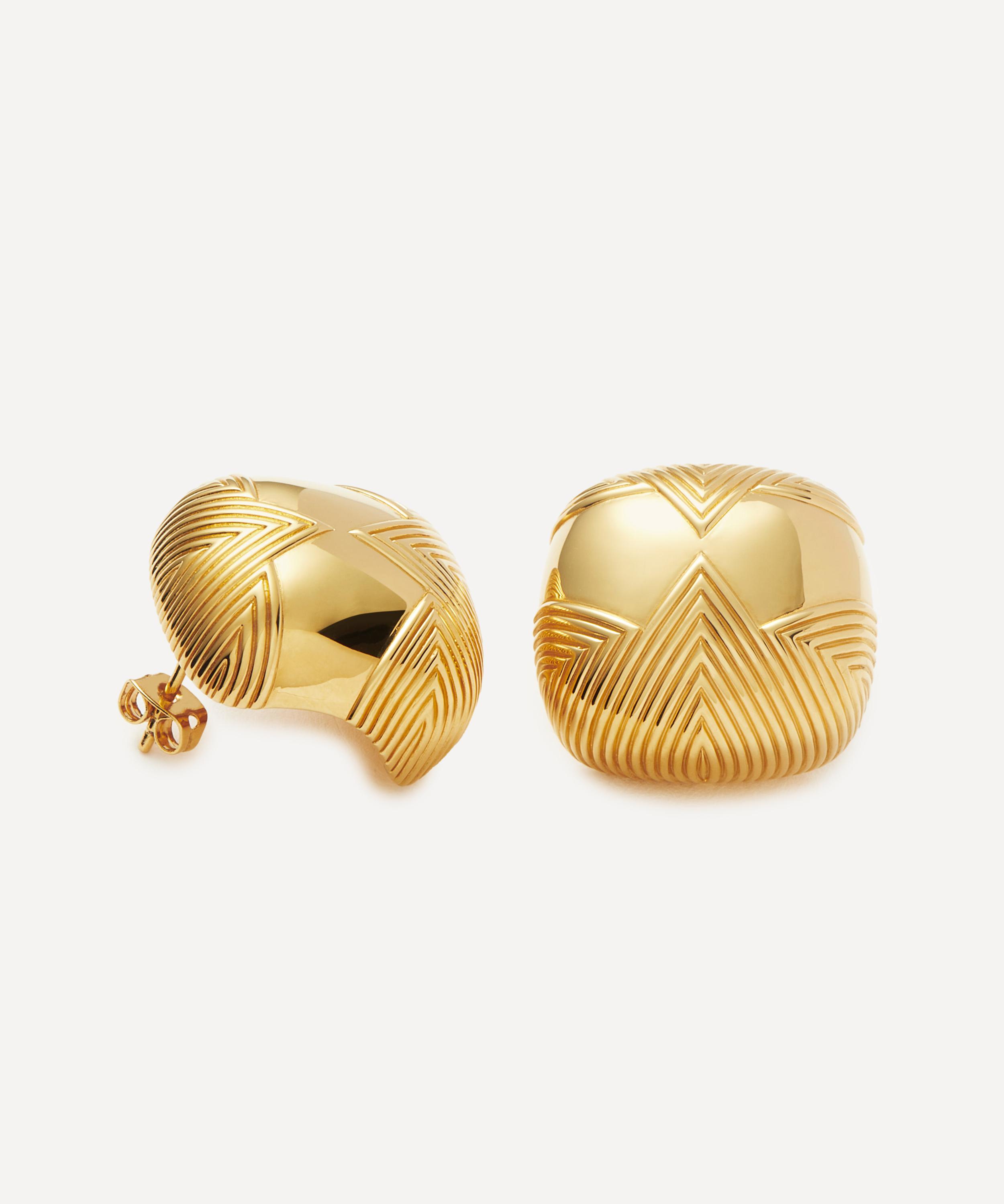 Crafted from 18ct gold-plated brass, each earring features a large domed silhouette with geometric ridge detailing across the surface, and is complete with a high-polished finish. Style solo, or try layering them with a cluster of studs for an on-trend curation.