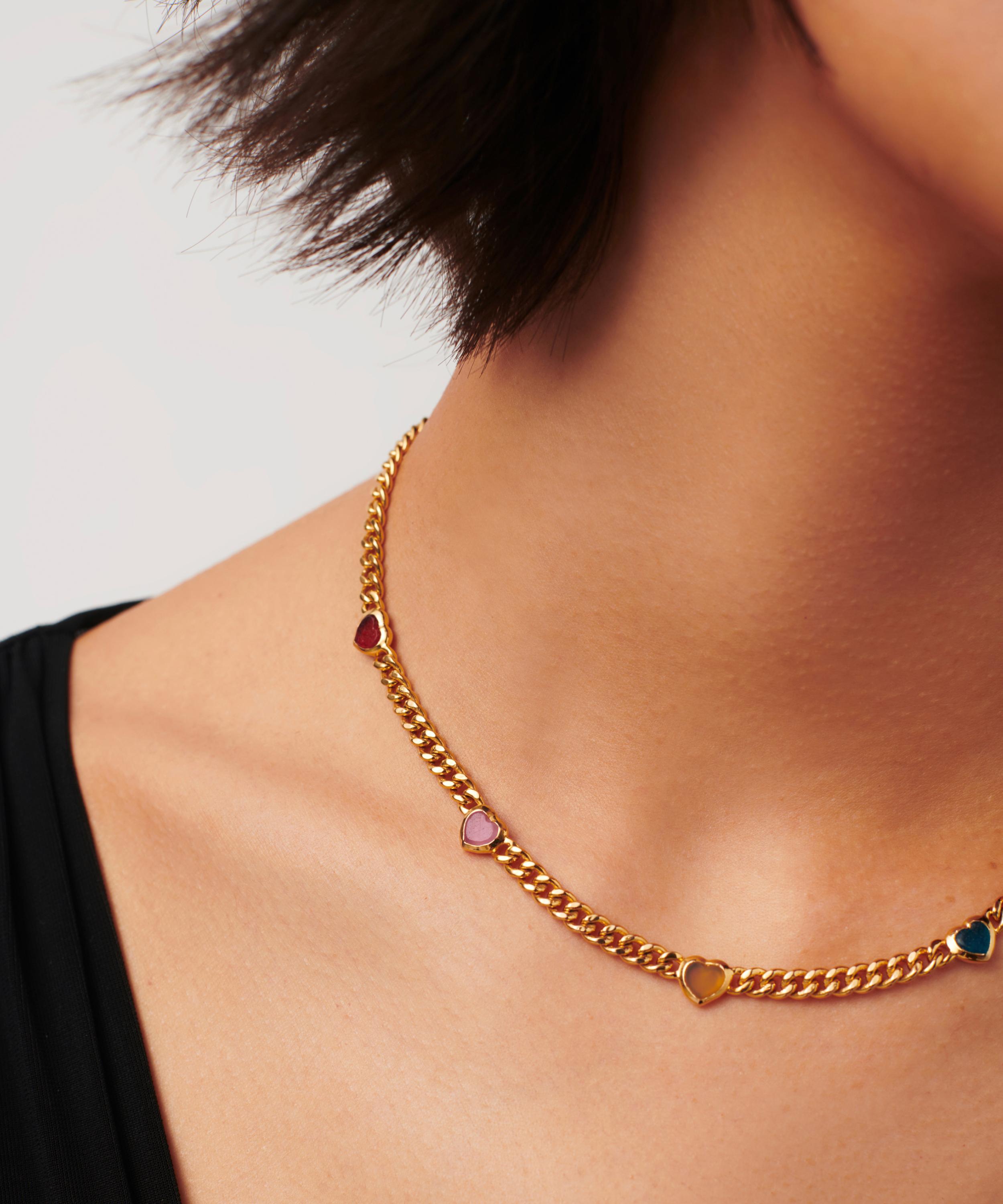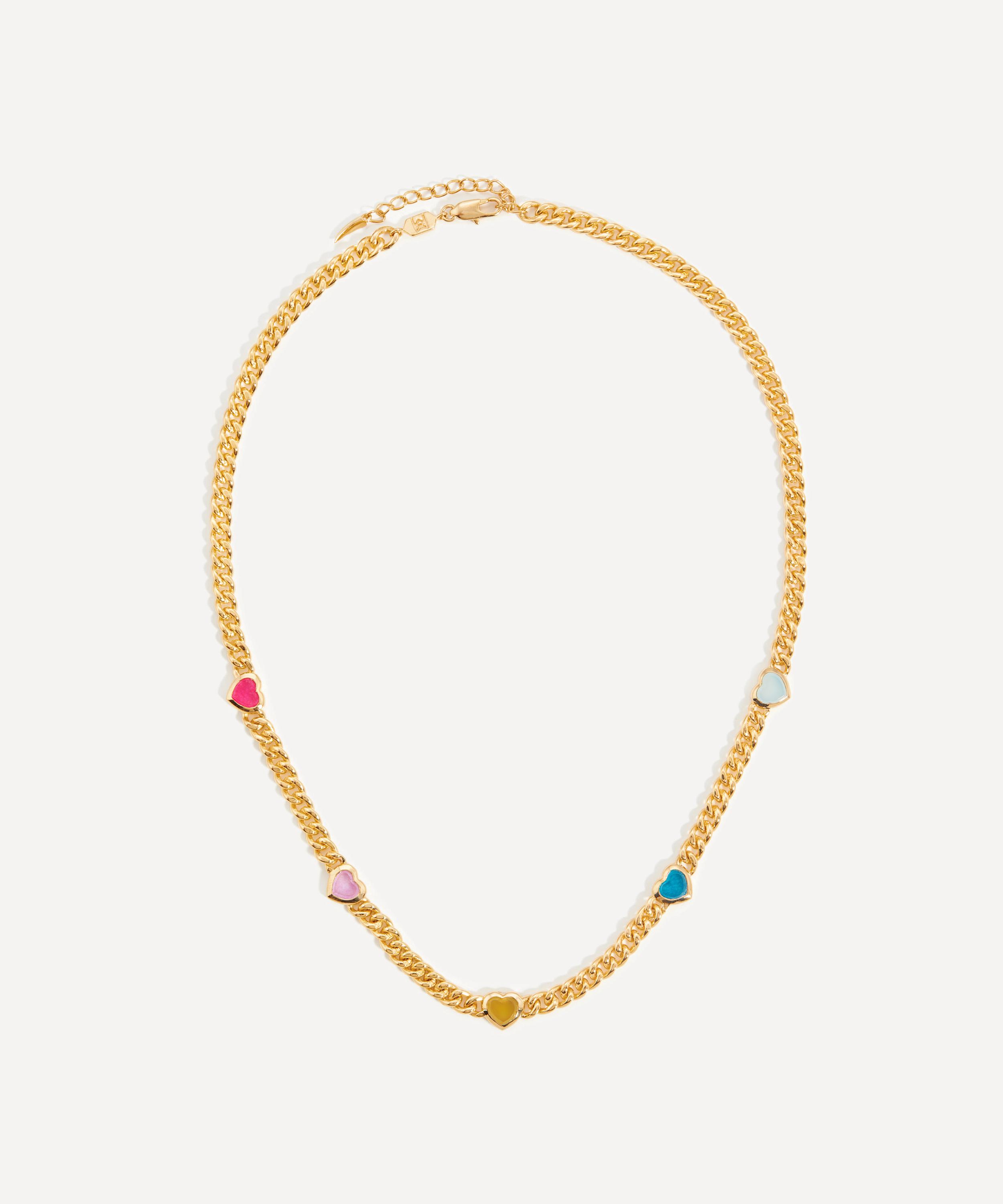 Perfect for layering, this retro-inspired charm necklace from Missoma will instantly elevate your stack with its colourful hue. Crafted from 18ct gold-plated brass, this necklace features a thick curb chain, adorned with five jelly heart charms, inlaid with semi-precious gemstones in a vibrant assortment of colours. Complete with a classic lobster clasp, stack it with other chains, wear it solo, or team it with the matching bracelet.