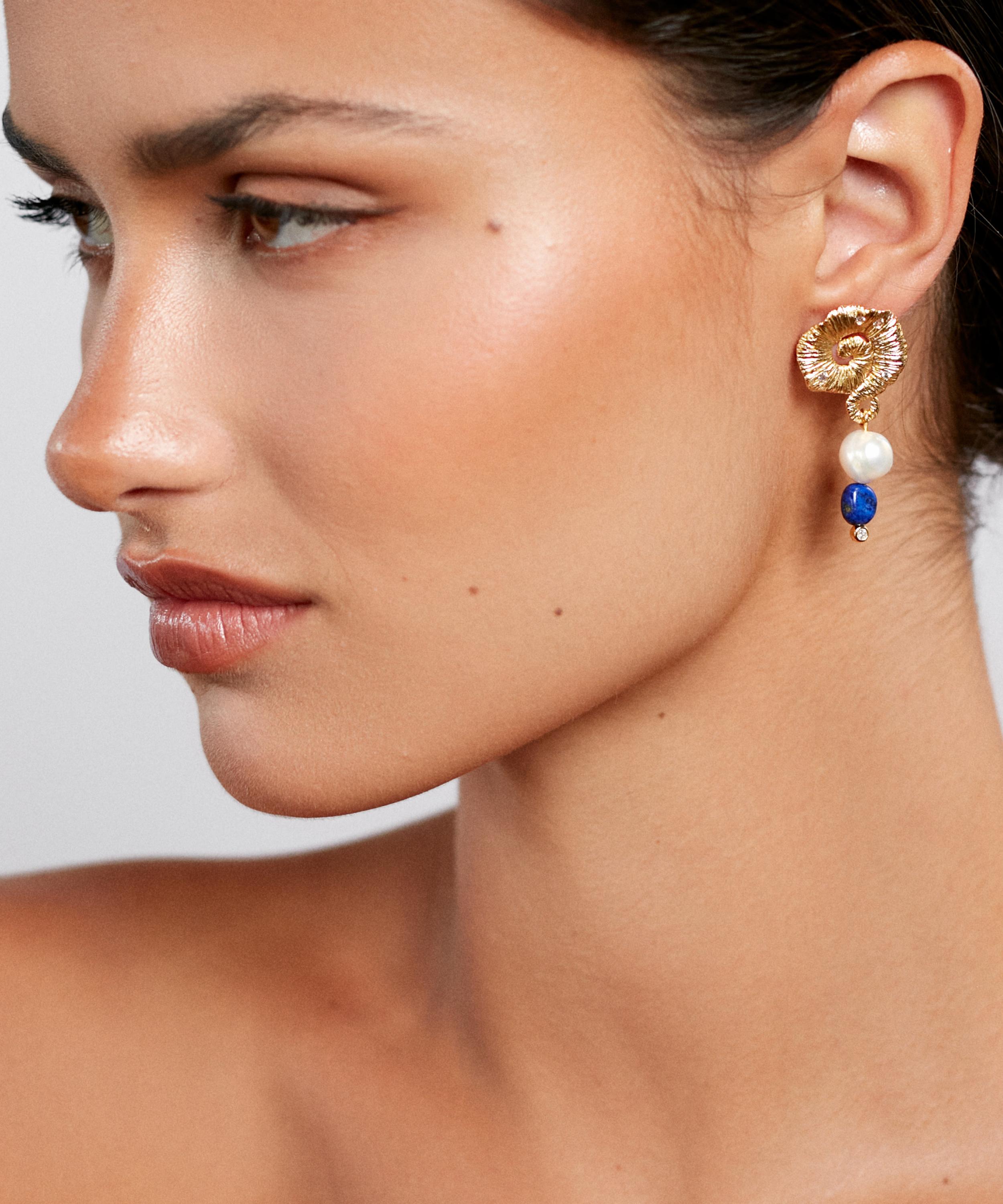 Add a touch of boho glamour to your look with the Jetset Gems Drop Earrings from Anni Lu. Meticulously handcrafted from 18ct gold-plated brass, each earring features a deep-blue lapis lazuli and a cultured freshwater pearl dangling from an ammonite-inspired silhouette, embellished with cubic zirconia. Capturing the designer’s penchant for playful colour palettes and free-spirited aesthetic, these tropical earrings are perfect for mixing and matching with a range of stackable designs – let them stand out against a soft, subdued ensemble for statement appeal, or amplify their impact with a maximalist blend of intricate patterns and richly clashing textures.