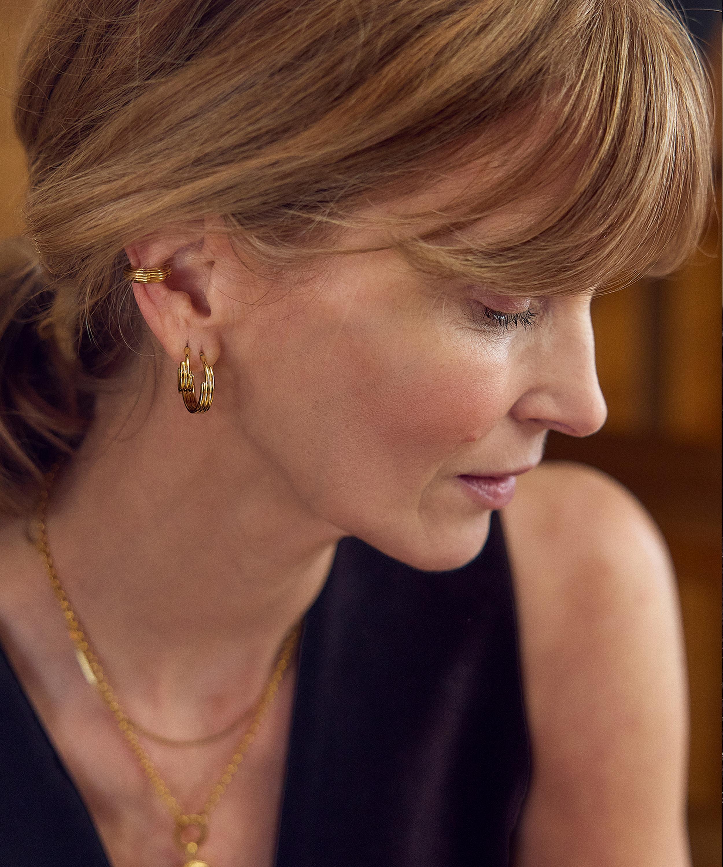 Created to honour the journey of being a woman, this exquisite pair is expertly handcrafted from 18ct gold-plated silver, inspired by French sculptor Bernar Venet and feature smooth Art-Deco-inspired curves – a representation of resilience, beauty and coming full circle. Style yours solo, add them to a curated ear stack or team with matching pieces from the collection for a co-ordinating look.