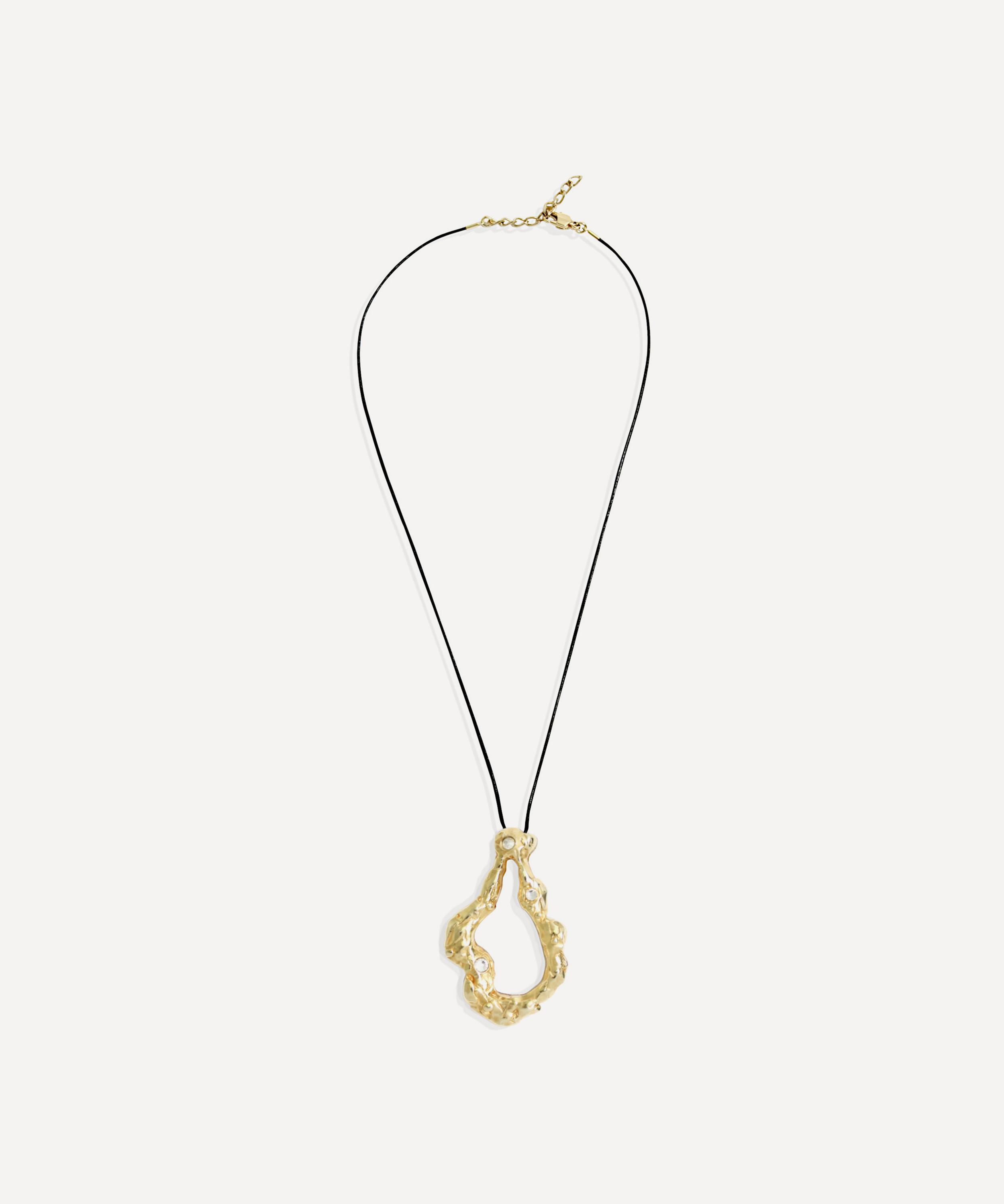 Thoughtfully crafted in London from 18ct gold-plated brass, this distinctive and enduring heirloom features a thin black leather cord and an irregular pendant with organic texture and cubic zirconia crystals – offering a timeless yet modern aesthetic with vintage sensibilities. Whether worn as a personal talisman or a statement of confidence, it invites you to embrace your identity with elegance and intention. Style it with the matching Rena Earrings for a co-ordinating look, or pair it with other pieces from the brand.