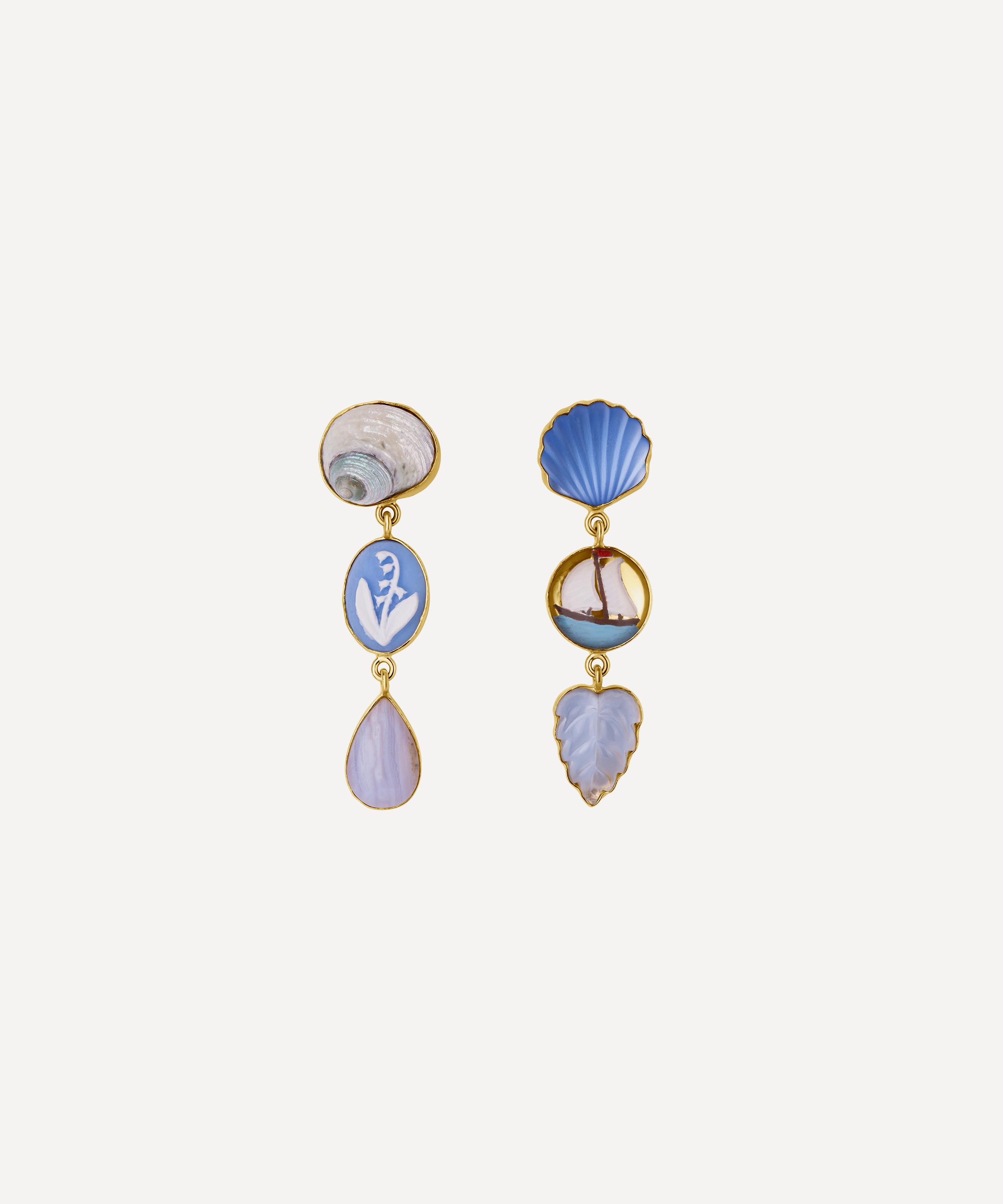 A signature style from Grainne Morton, these drop earrings offer a whimsical, dreamy addition to your daily line-up. Handmade in Edinburgh from 18ct gold-plated silver, each earring is composed of three mini charms made from blue lace agate, cameo, shell and vintage glass. Finished with a classic post fastening, they boast an unexpected juxtaposition of vintage and contemporary styles - perfect for adding visual interest to everyday looks.