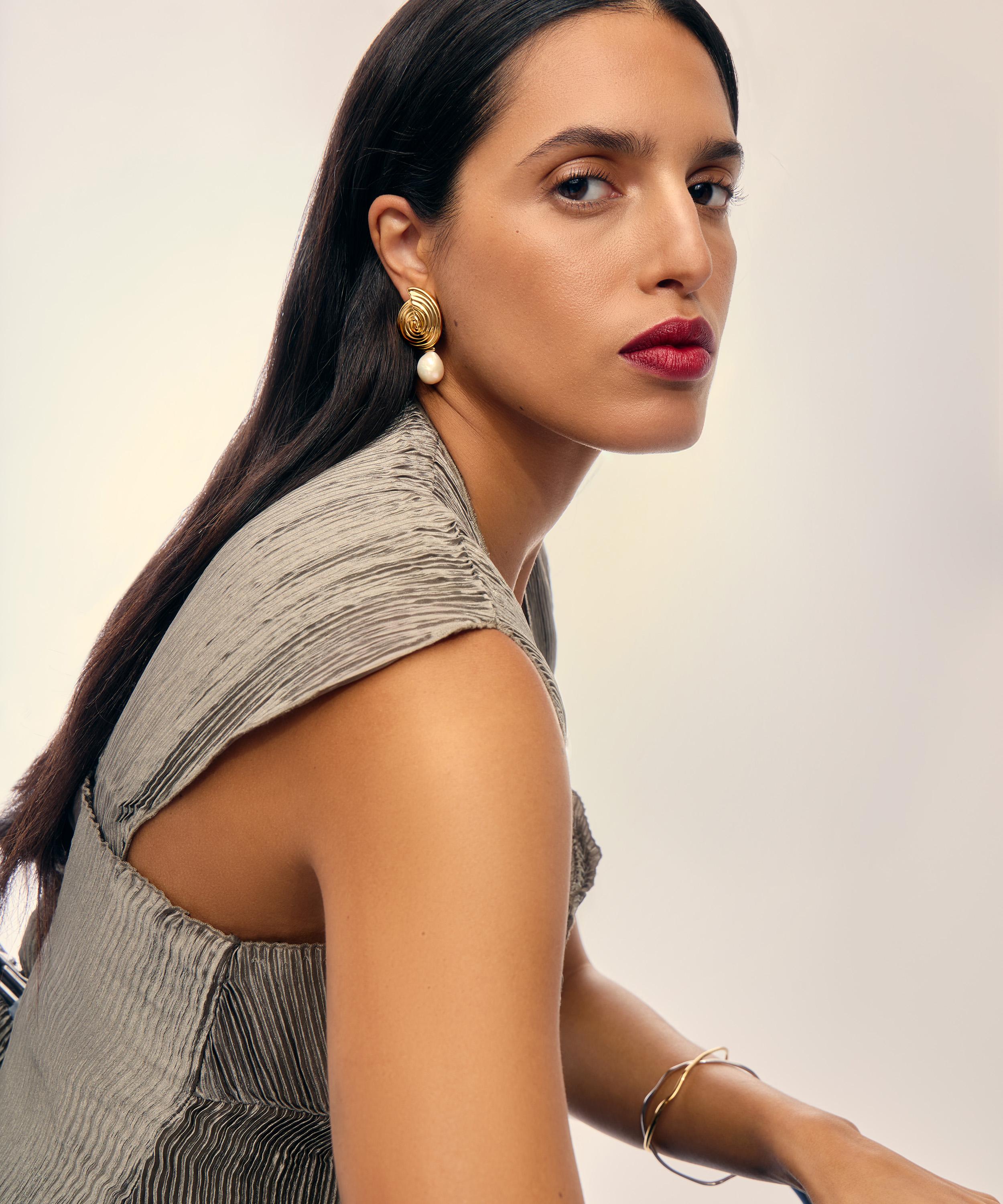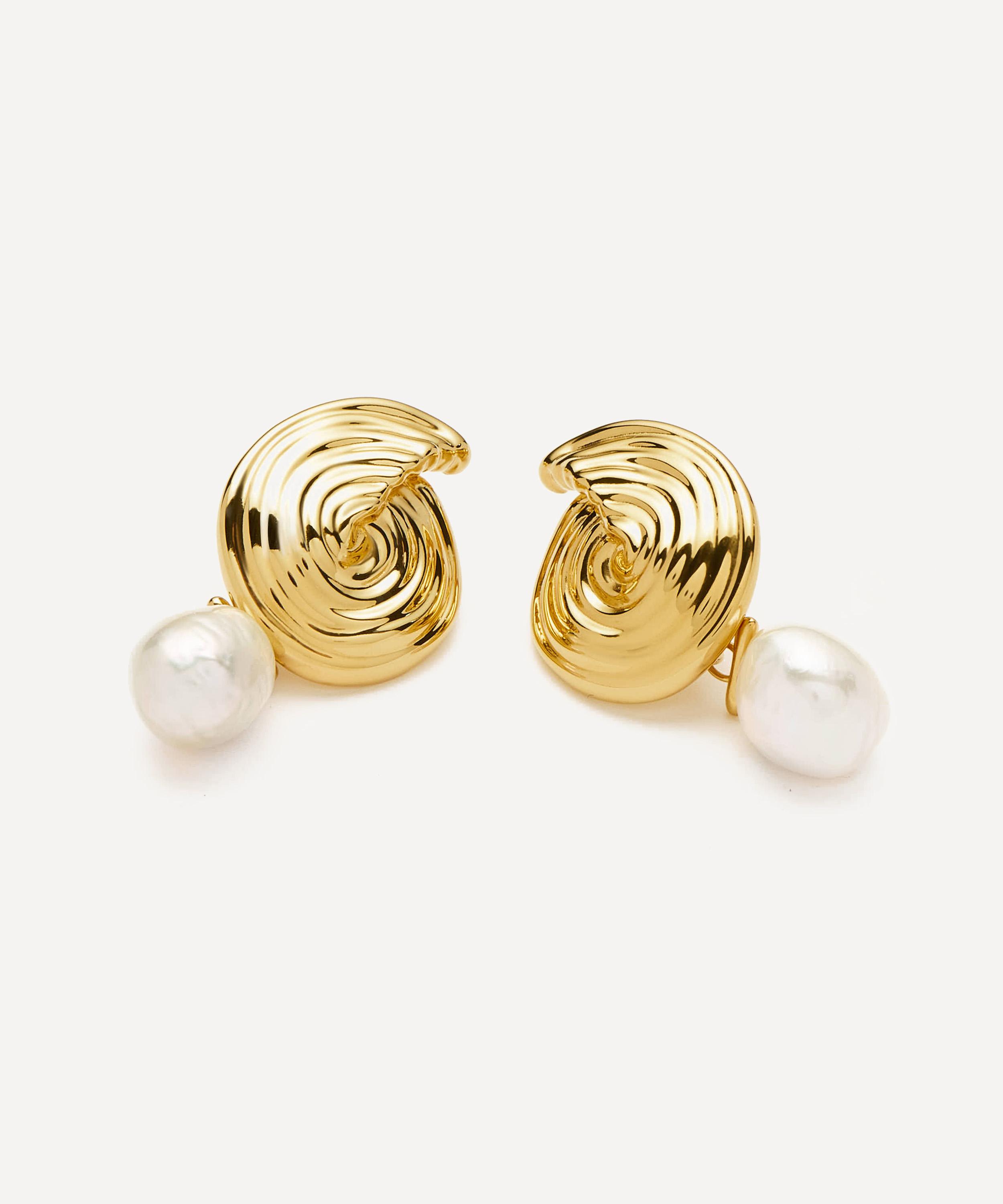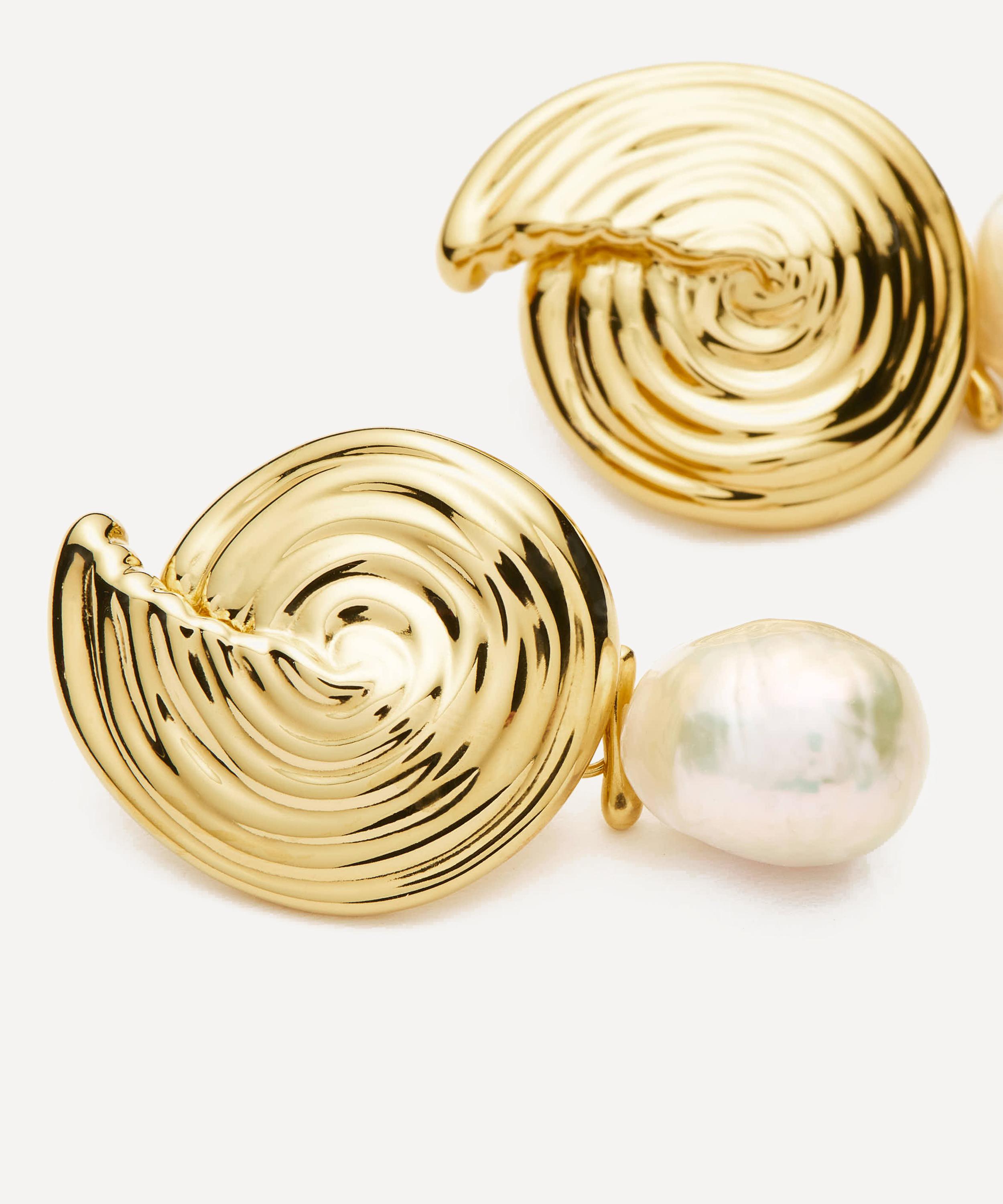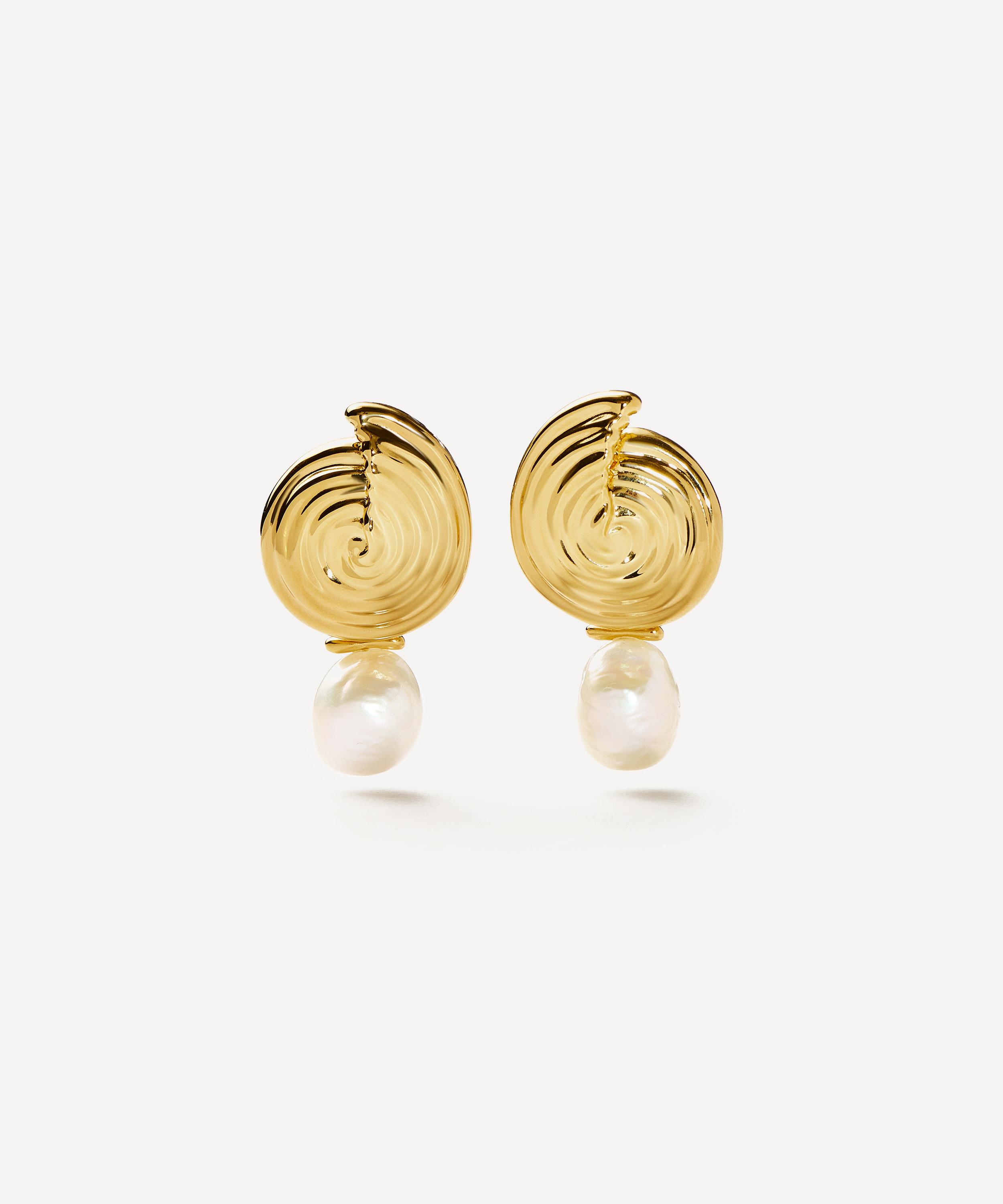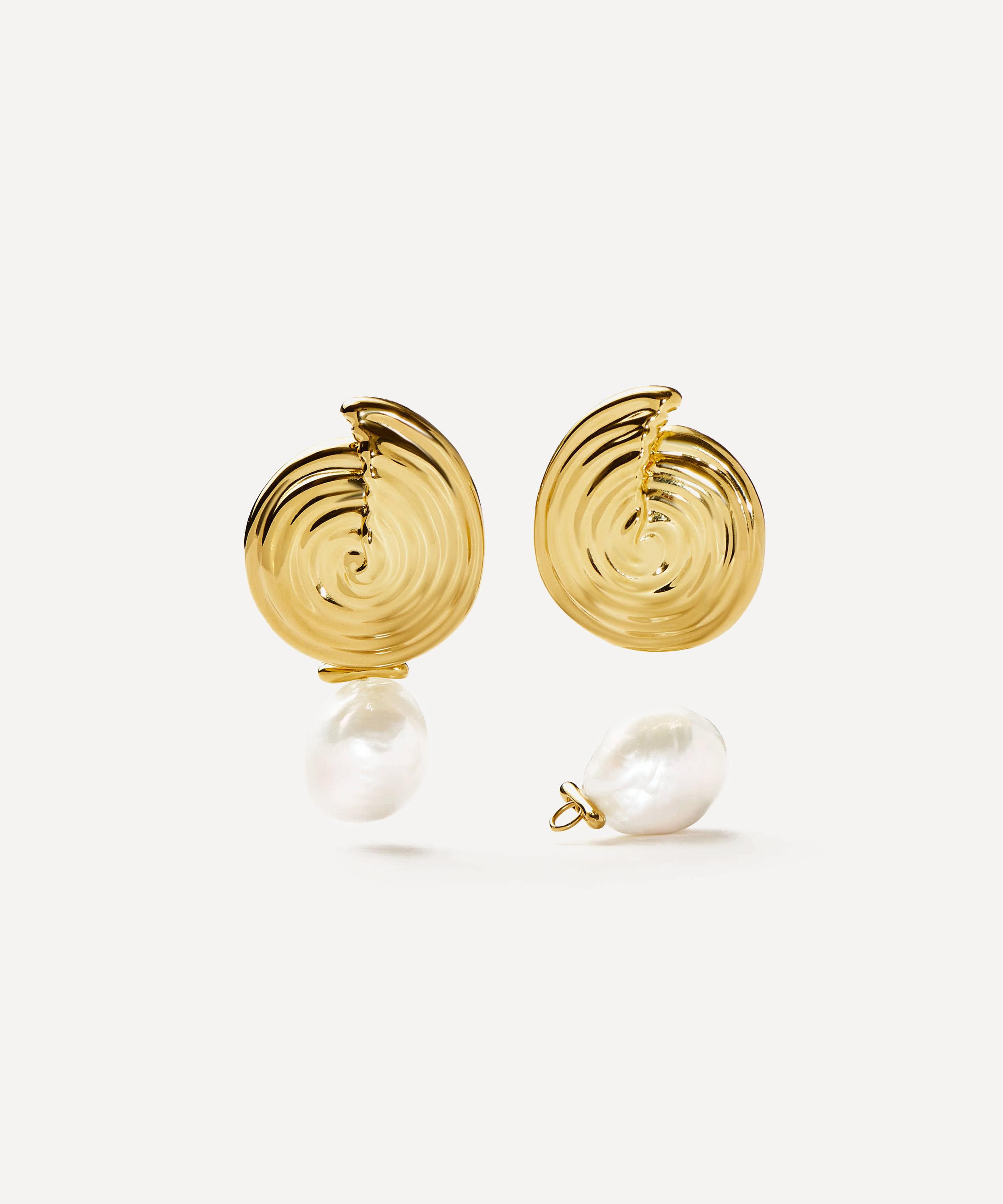 Drawing on elevated costal shapes, each earring features a removable pearl drop suspended from a large spiral stud in 18ct gold-plated brass. Perfect for the summer season and beyond, the pearl can be detached and worn as a pendant drop, statement studs or mismatched earrings.
