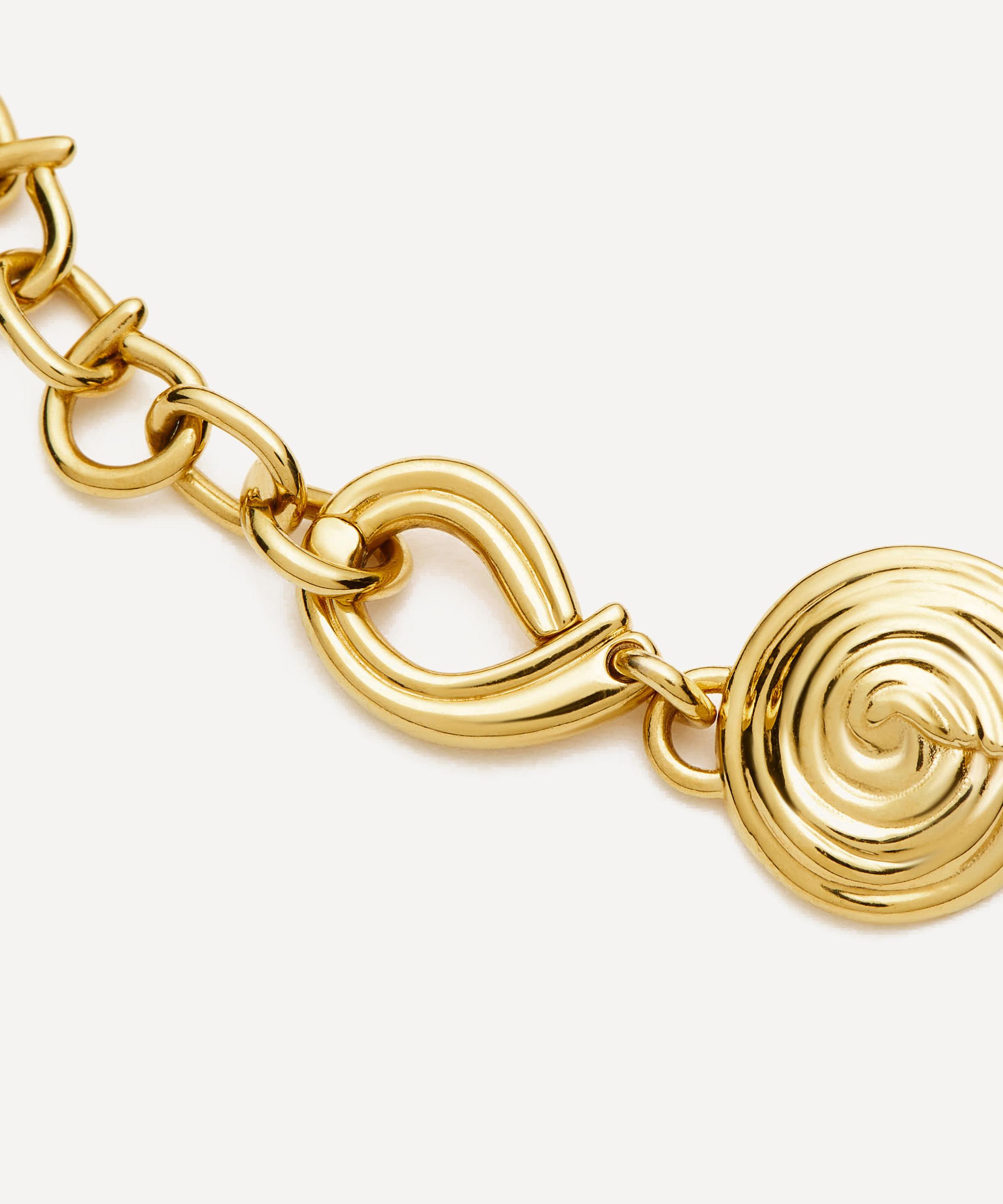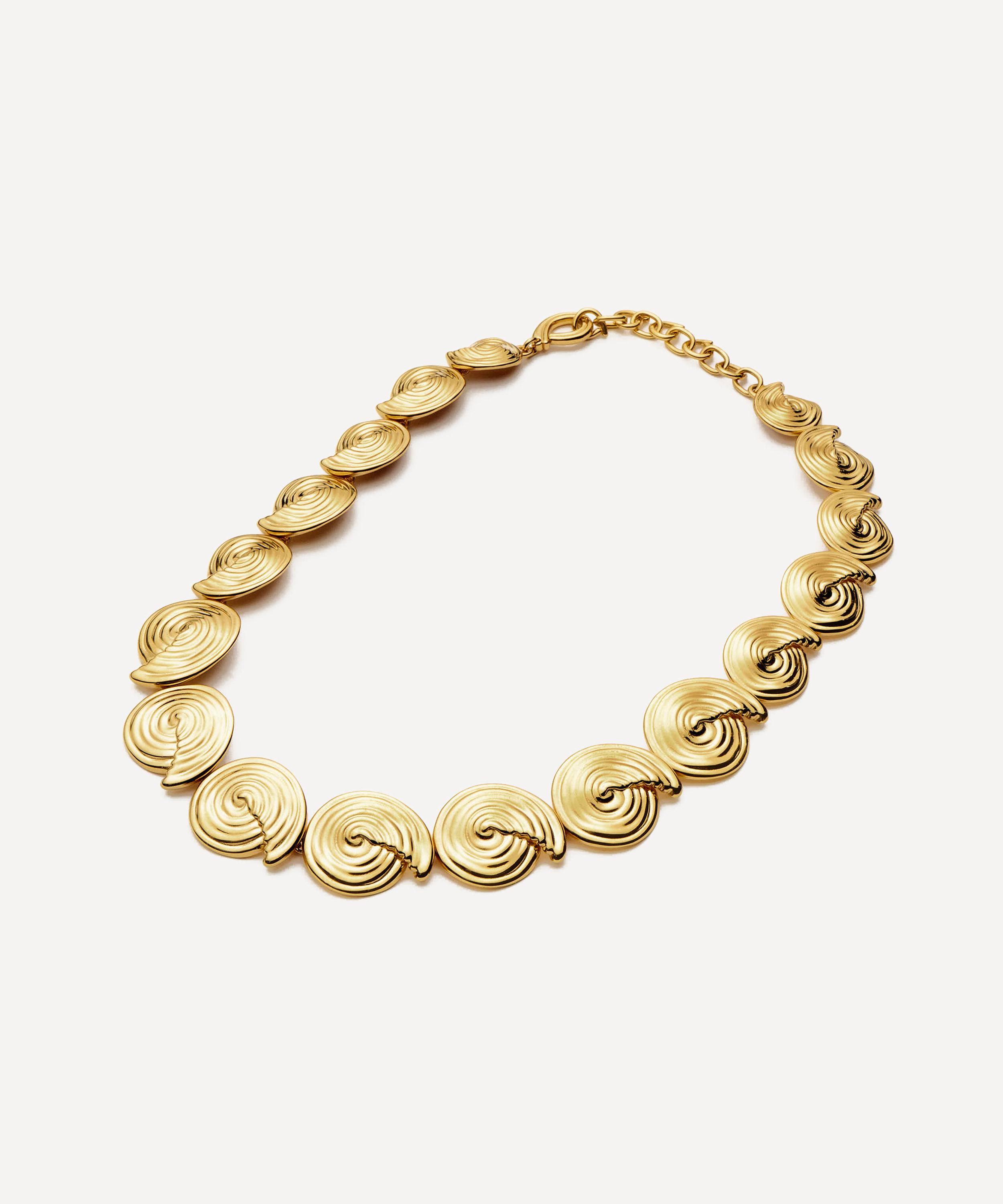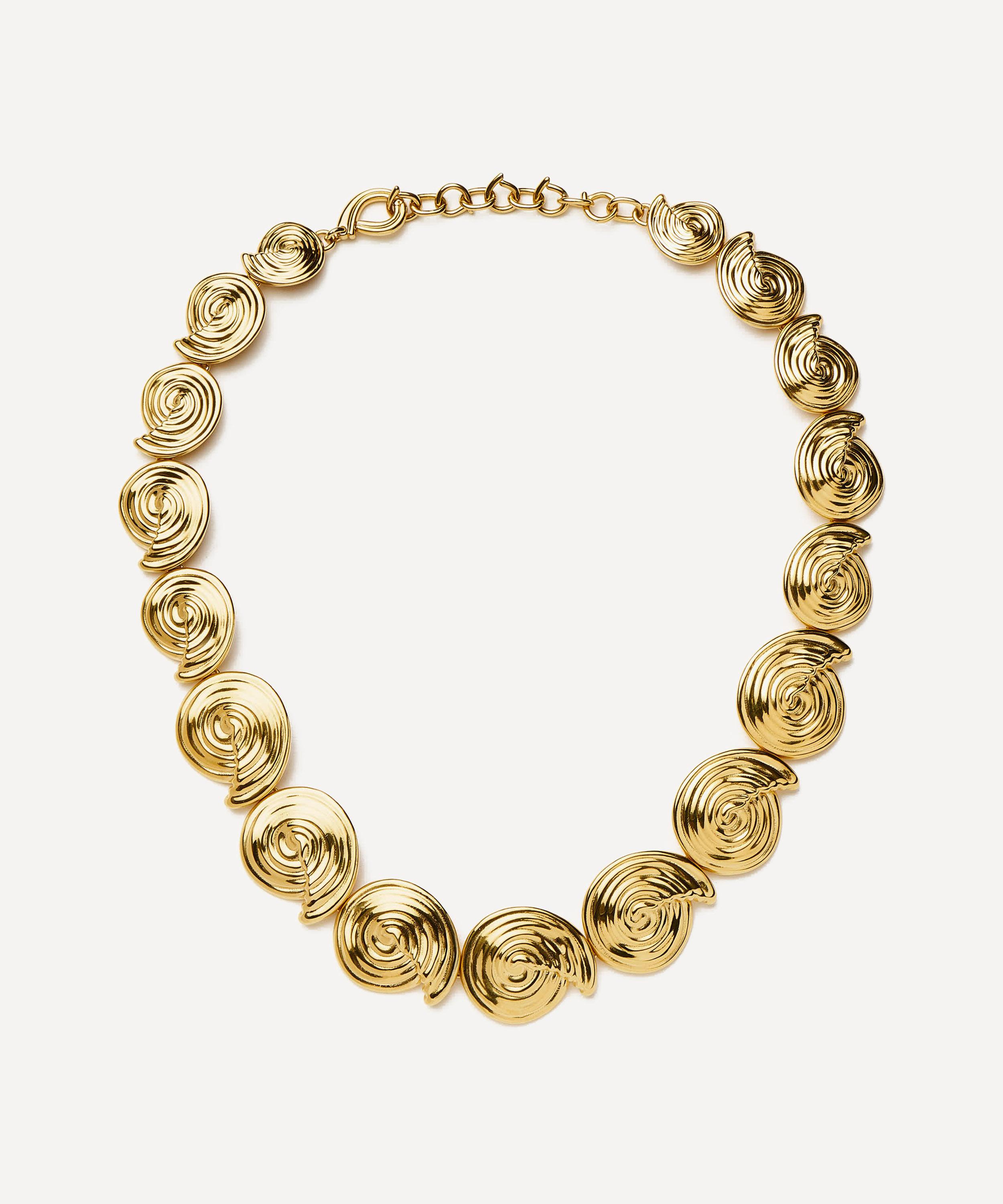 Drawing on elevated costal shapes, it features round, graduating links embellished with spiral elements in 18ct gold-plated brass. Perfect for the summer season and beyond, it can be worn as a solo piece or complimented with a pair of bold earrings.