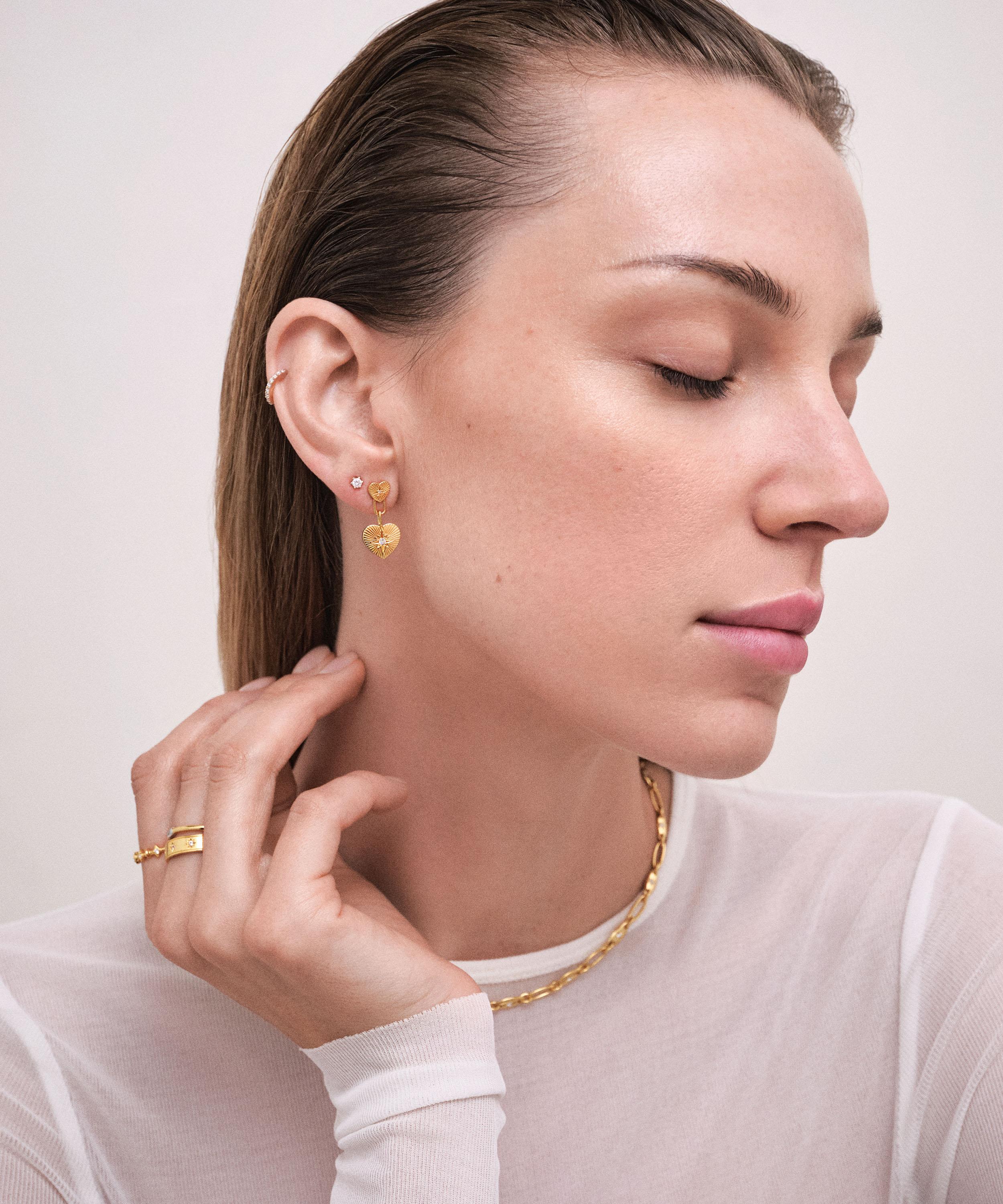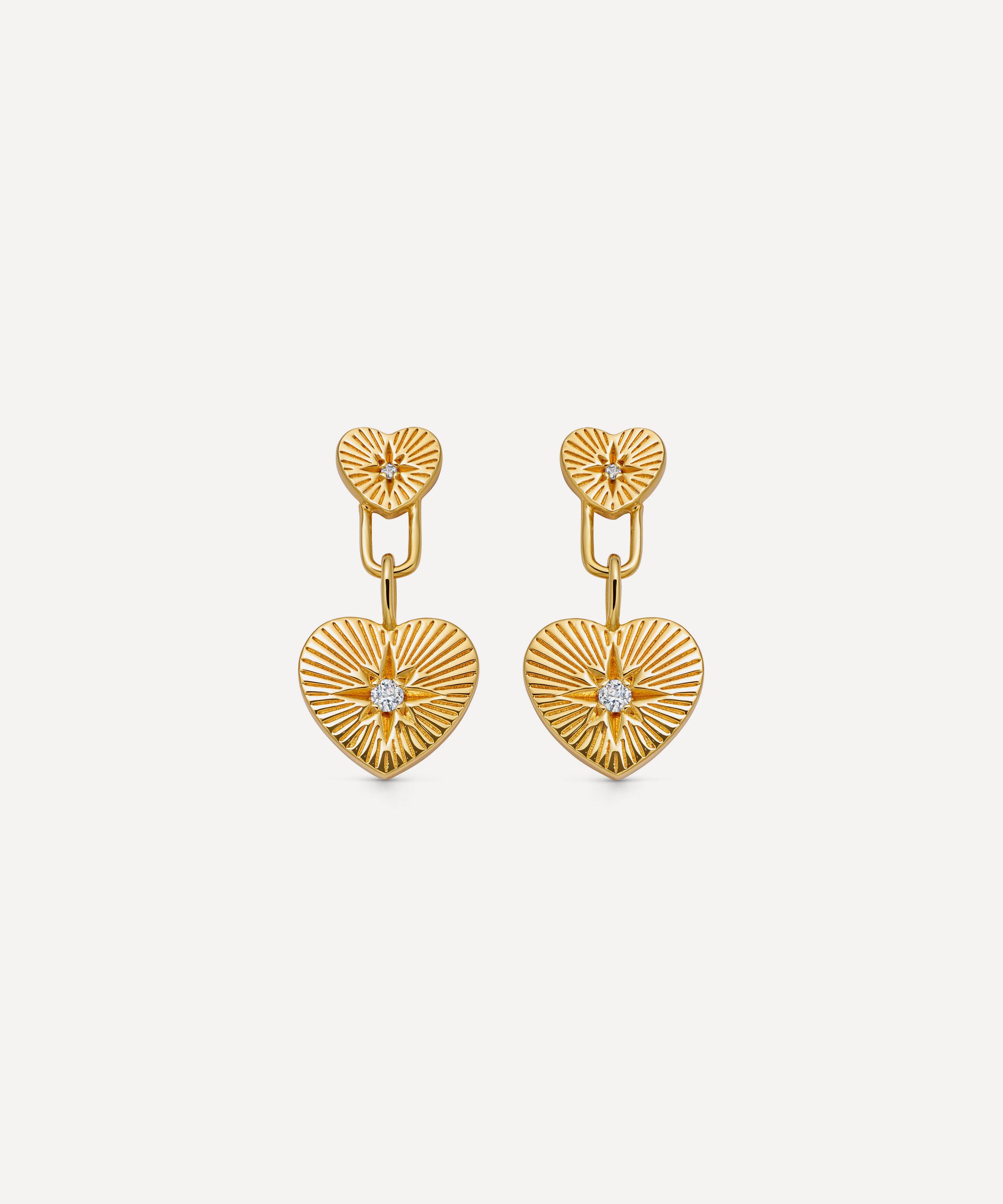 Crafted from sterling silver plated in 18ct gold vermeil, each earring features a graduated, double heart drop beautifully embellished with star set white sapphires and scored, sunburst detailing. Style them solo, incorporate into an ear stack or team them with the matching Heart Pendant Necklace from the collection.