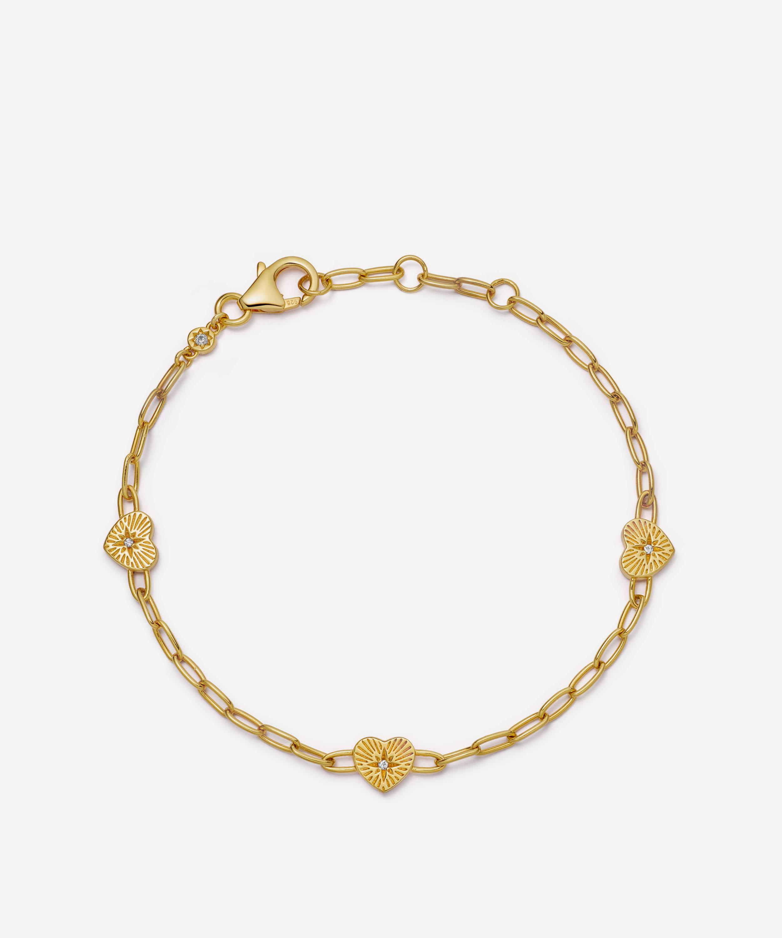 Crafted from sterling silver plated in 18ct gold vermeil, it features a paperclip chain adorned with three heart-shaped station charms, each beautifully embellished with a star set white sapphire and scored, sunburst detailing. Style it solo, incorporate into a wrist stack or team it with the matching Heart Pendant Necklace from the collection.