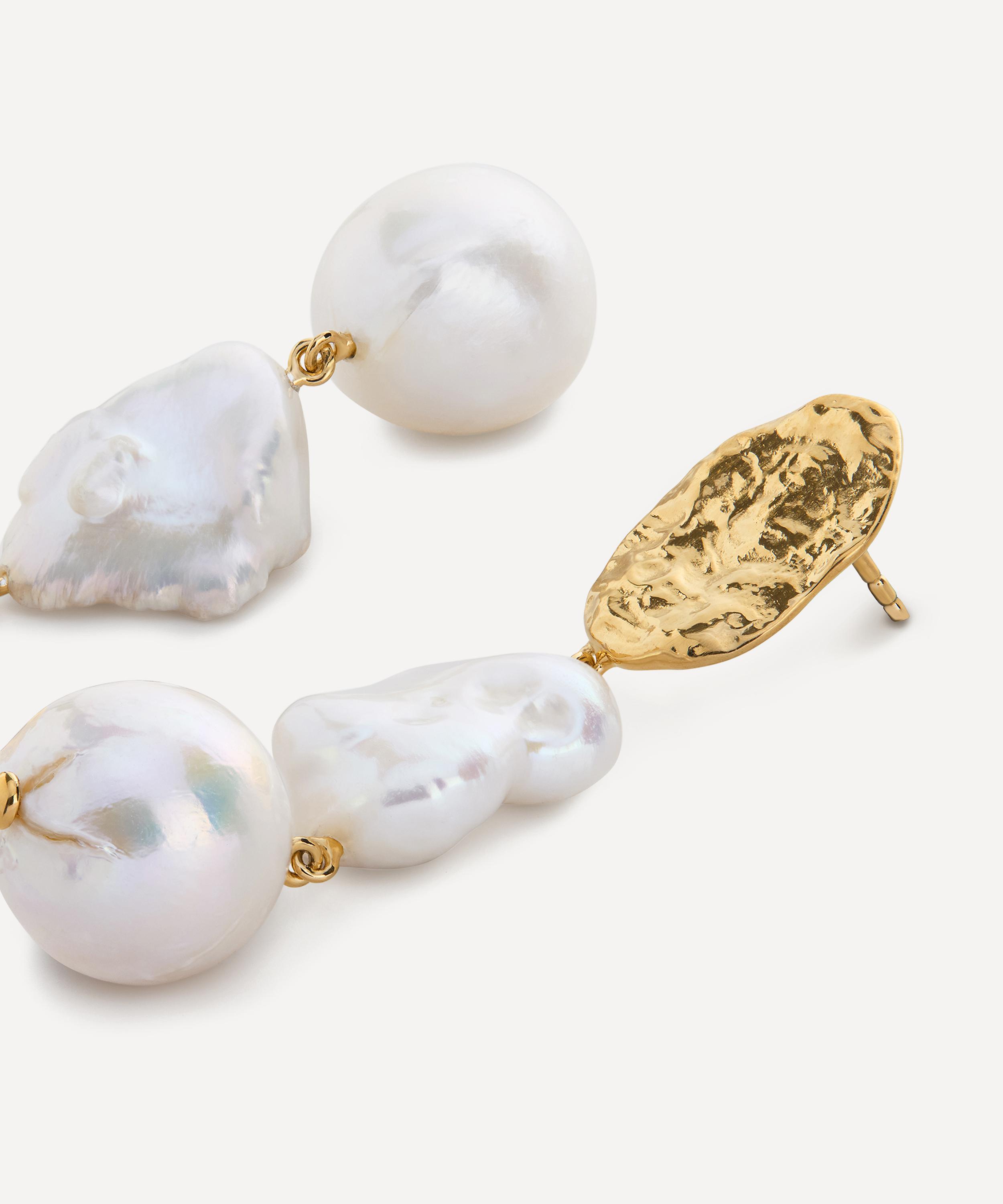 Crafted from sterling silver plated in 18ct gold vermeil, each earring features a rugged, textured disc top, elevated by an opulent Keshi and baroque pearl - inspired by deep-sea treasures. Style them solo for a statement look or team with other earrings to build and eye-catching ear stack.