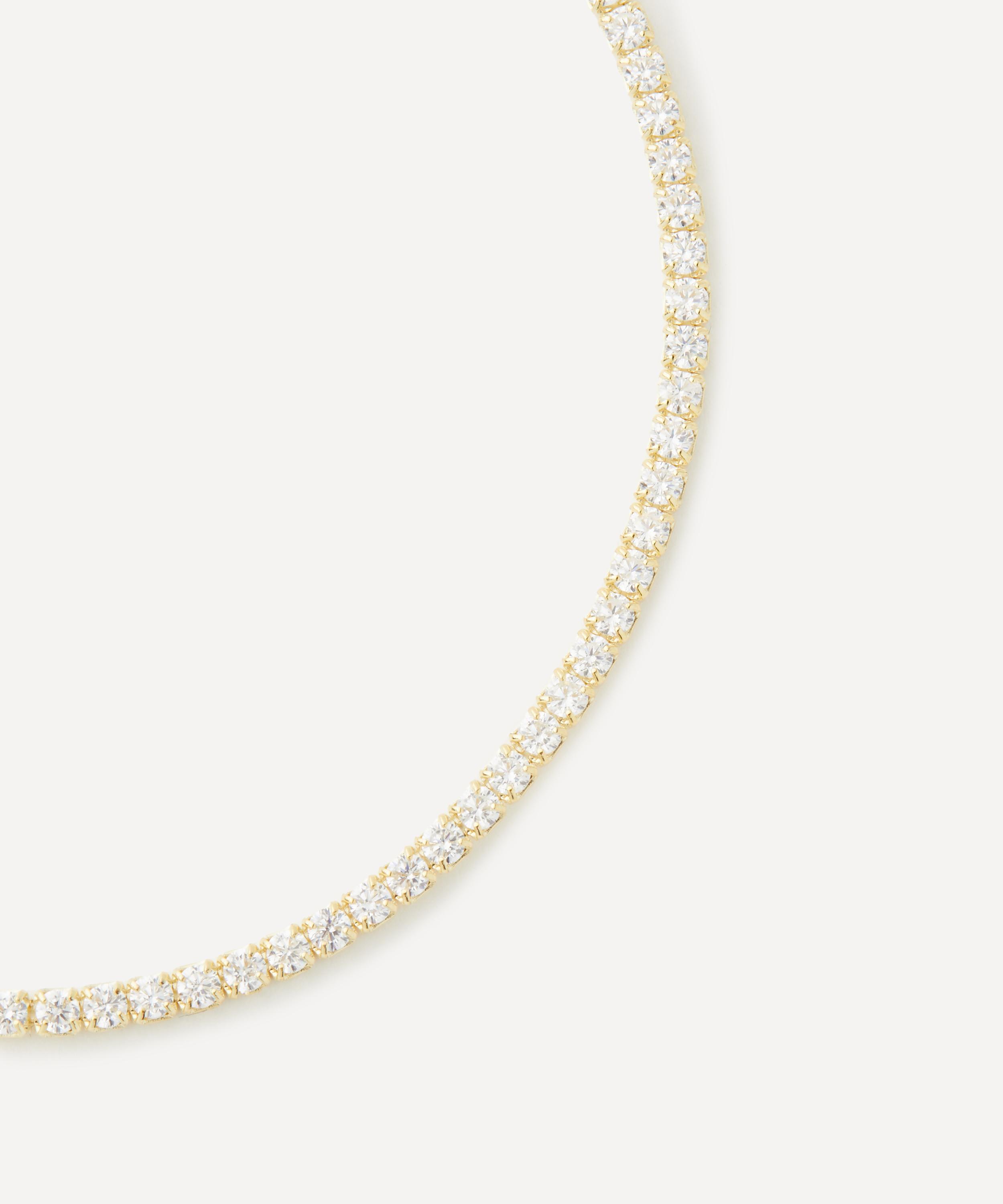 Liven up your look with this diamond tennis bracelet from SHASHI. Crafted from sterling silver plated in 18ct gold vermeil, its stunning silhouette features a classic box chain and sparkling cubic zirconia stones. Complete with an adjustable slider fastening, it’s perfect for day and night, solo or stacked.