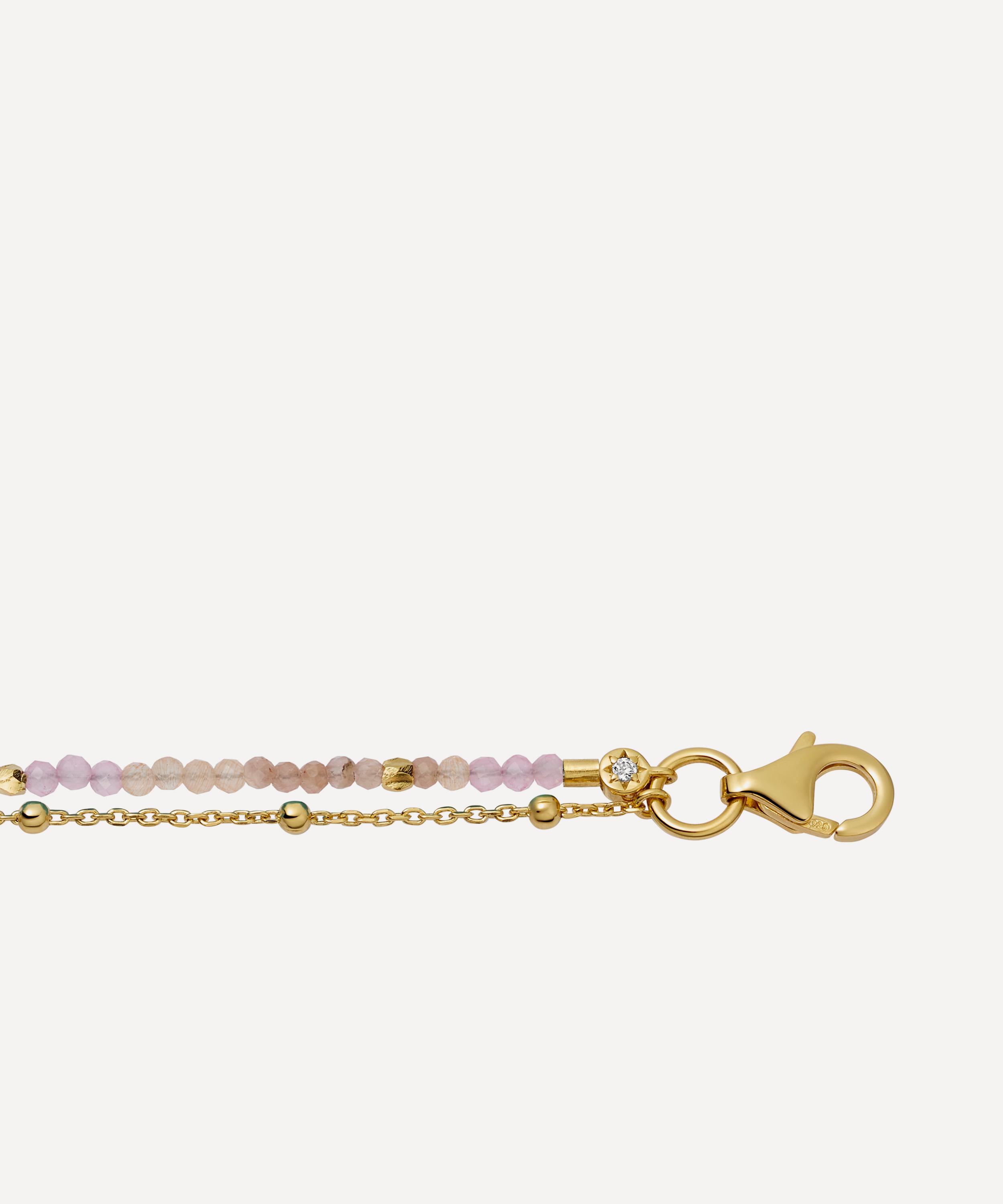 Crafted from sterling silver plated in 18ct gold vermeil, this bracelet features the collection’s signature double-layered chain, composed of a beaded trace chain and a string of hand-cut Chalcedony and rhodochrosite interspersed with golden nuggets. Stack this talismanic piece with several other Biography styles for a contemporary alternative to the traditional woven friendship bracelet.