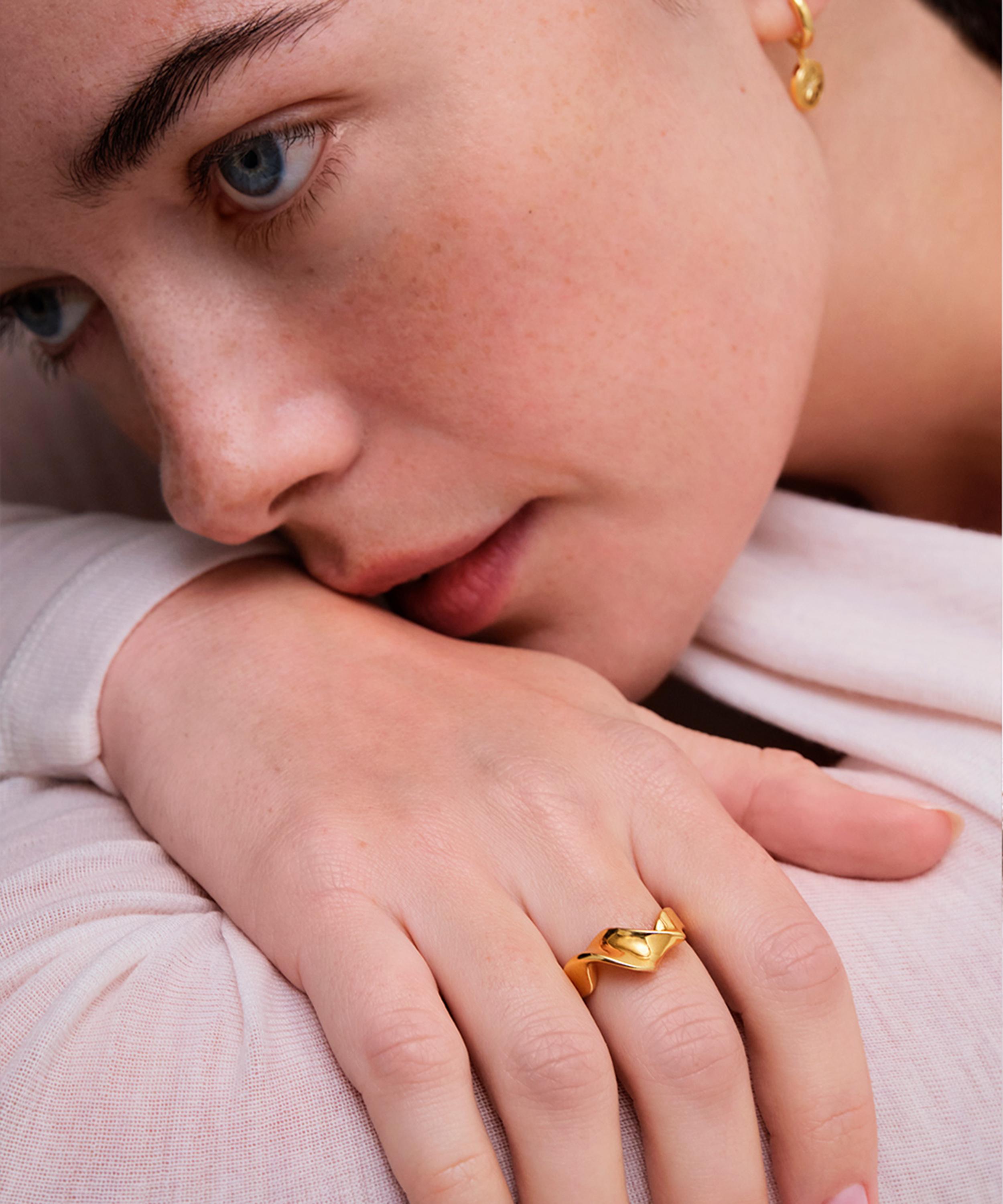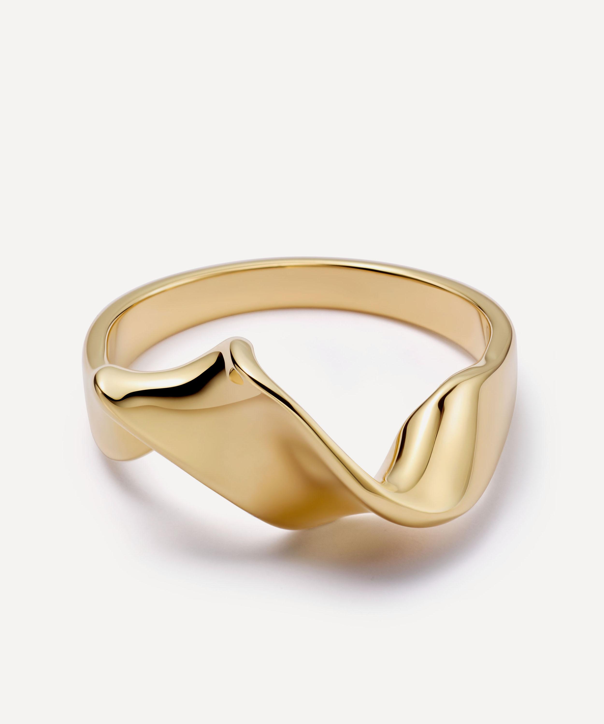 Crafted from sterling silver plated in 18ct gold vermeil, it features a sculptural silhouette, inspired by the smooth fluidity and organic spiral formation of ribbons. Style it alone, stack it with another gold ring or team it with the matching Fluid Hoop Earrings.