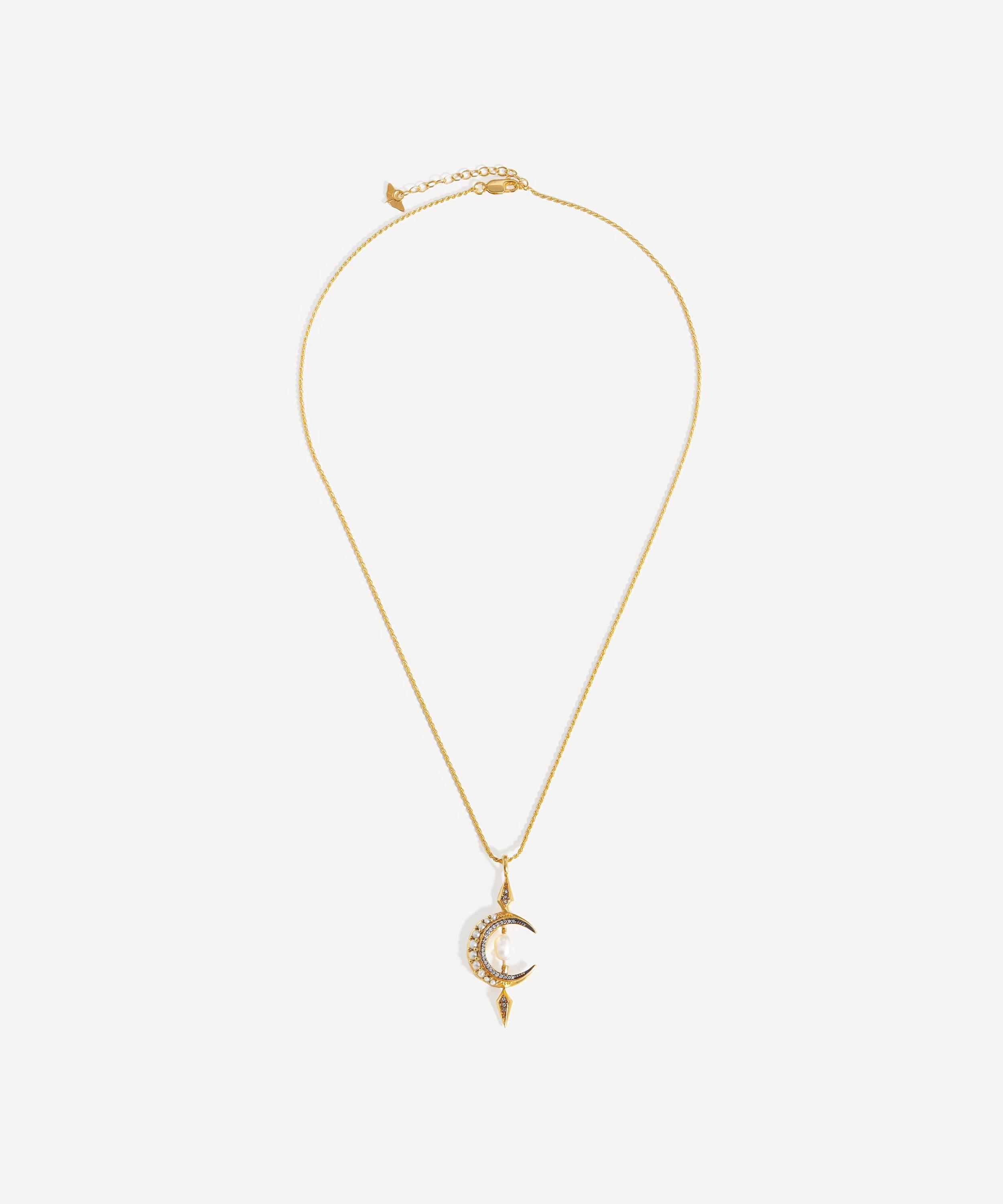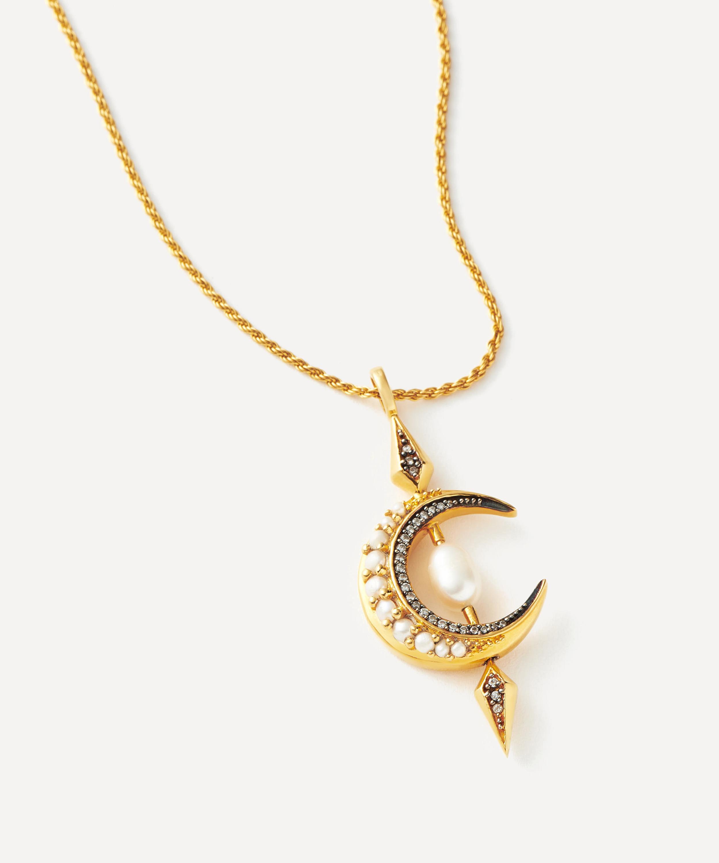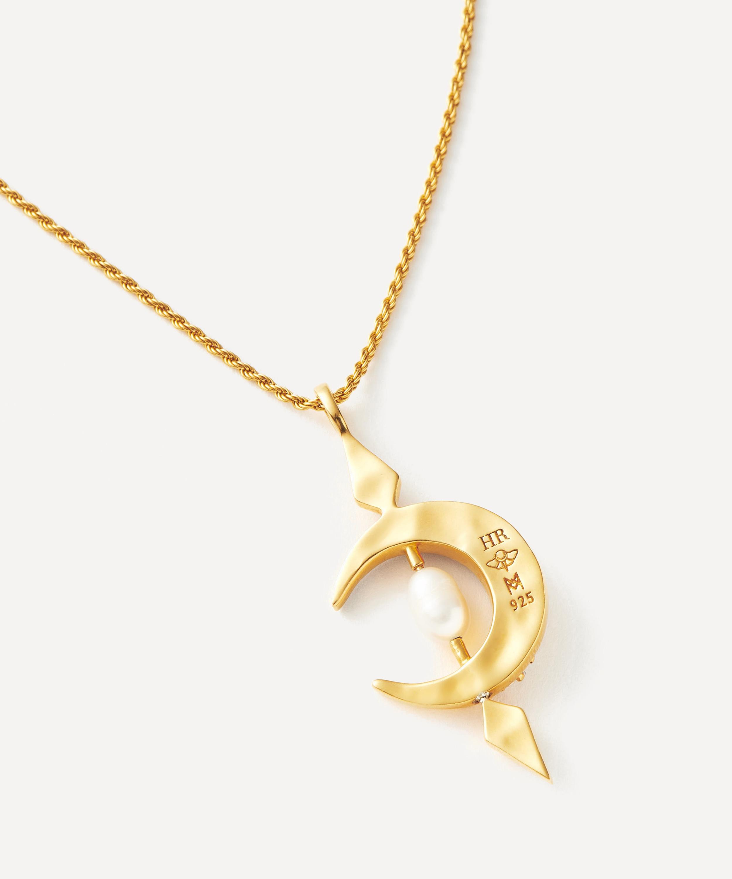 Embrace your individuality with the Crescent Moon Pearl pendant necklace from the Harris Reed x Missoma collaboration collection. Crafted from sterling silver plated in 18ct gold vermeil, it features an elegant rope chain and arrow pierced crescent moon pendant, lined with white pearls on the outer edge and white cubic zirconia on black rhodium to the inner. Complete with a rotating oval pearl at the centre, wear it alone or with other edgy necklaces for a curation that speaks to your unique sense of style.