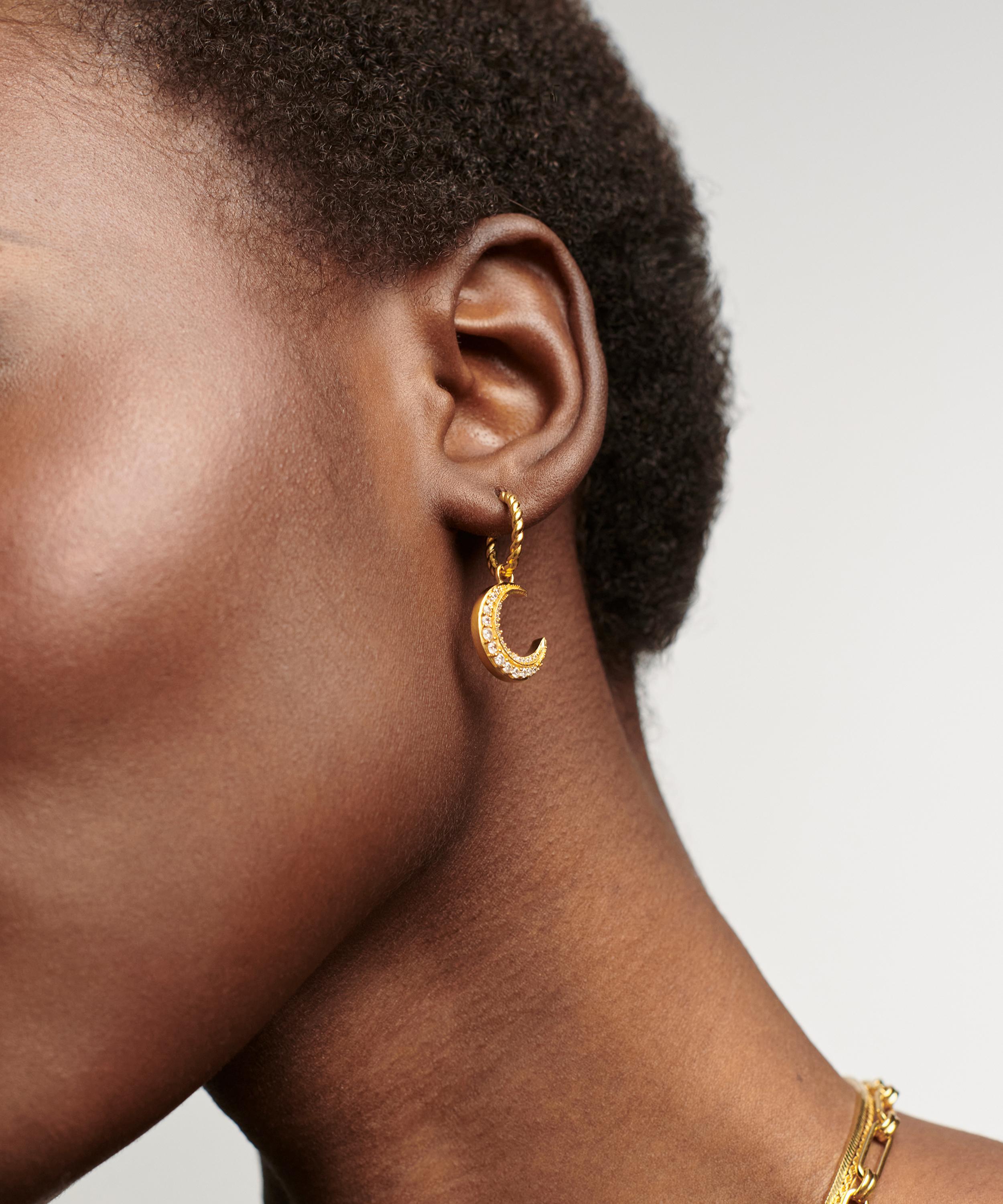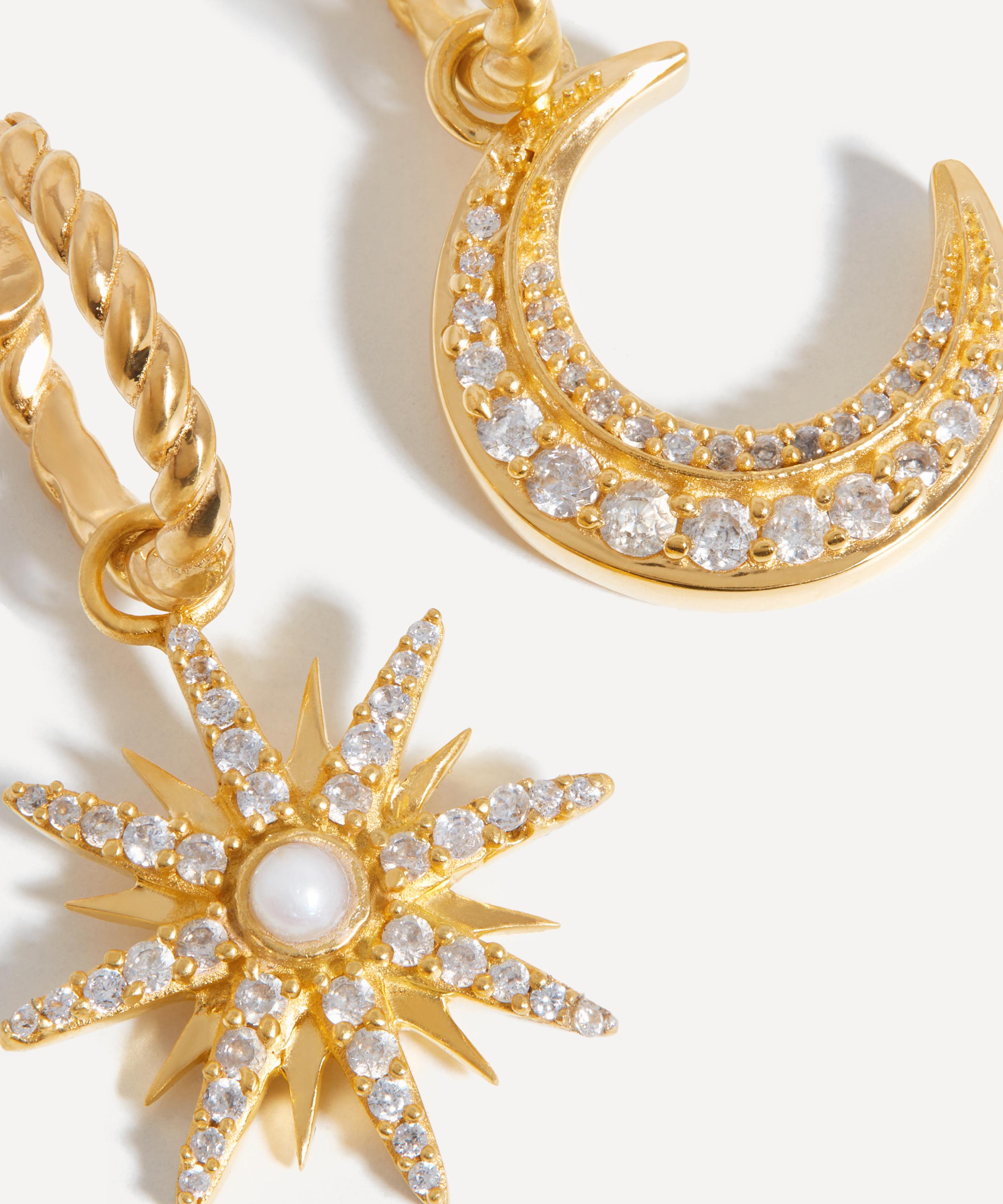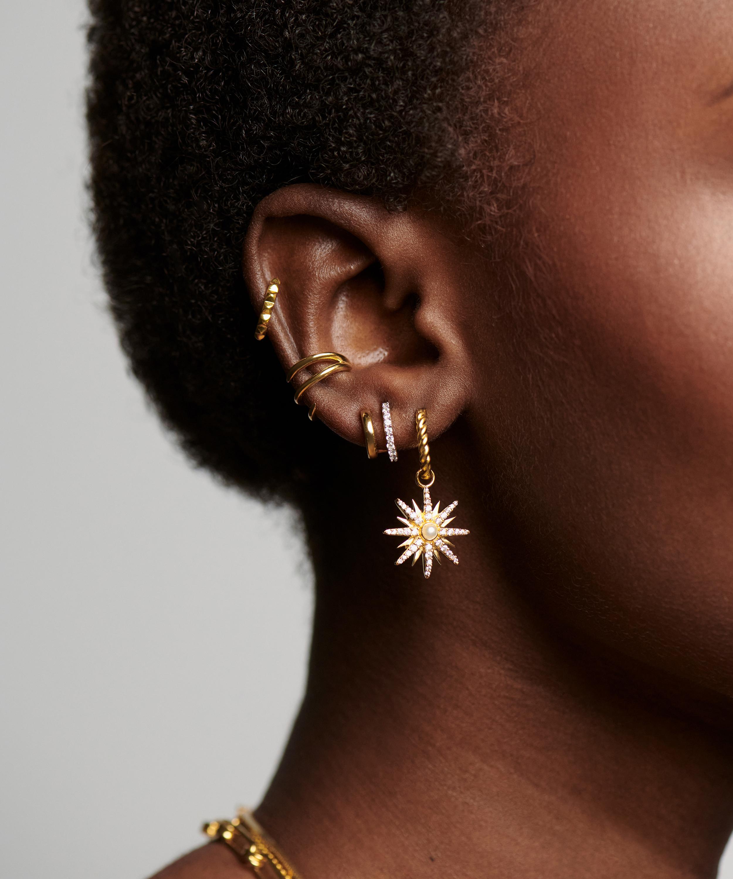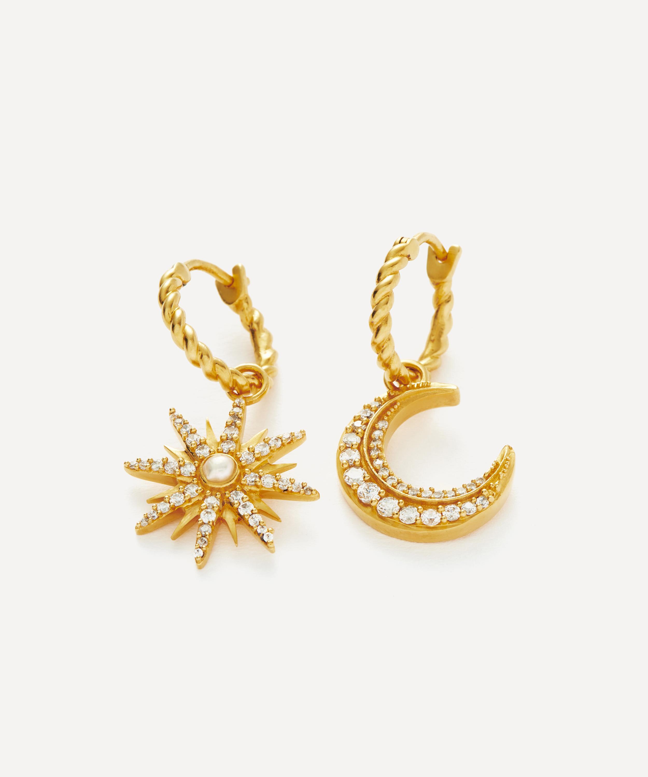 Embrace your individuality with the Moonlight Pearl hoop earrings from the Harris Reed x Missoma collaboration collection. Crafted from sterling silver plated in 18ct gold vermeil, this mismatched pair features twisted rope hoops, one characterised by a crescent moon drop, and the other by an intricate star drop adorned with a cabochon pearl – both charms are encrusted with sparkling pavé cubic zirconia.