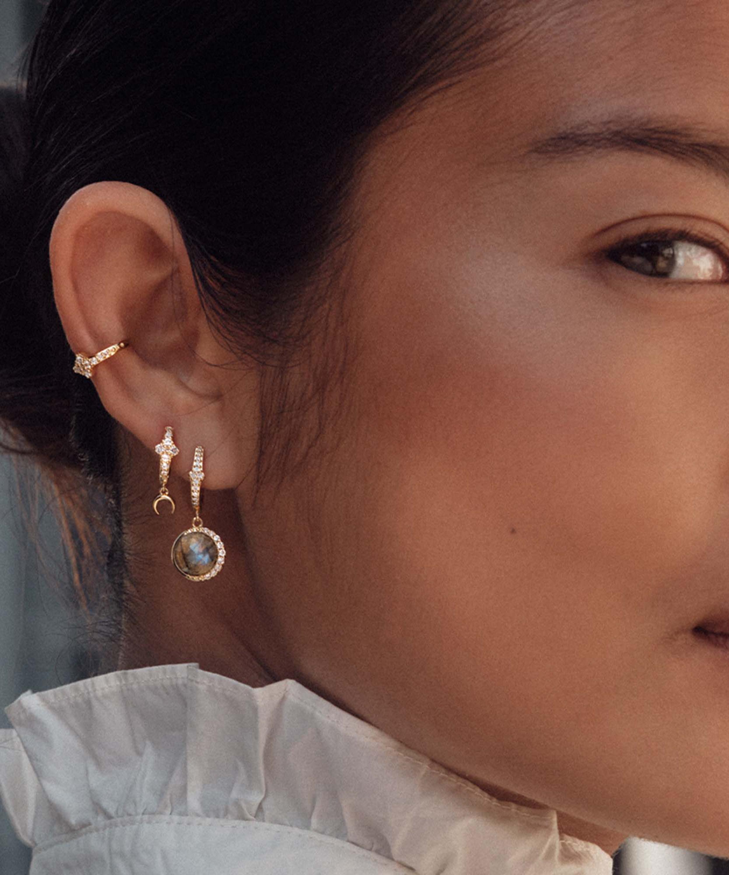 Crafted from sterling silver plated in 18ct gold vermeil, each earring features a white sapphire encrusted hoop and round labradorite drop – a symbol of transformation, embellished with white sapphire accents forming a crescent moon around the outer edge of the stone. Offering endless styling options, wear yours on their own, layer with studs, or pair it with the matching pendant necklace for a coordinated look.