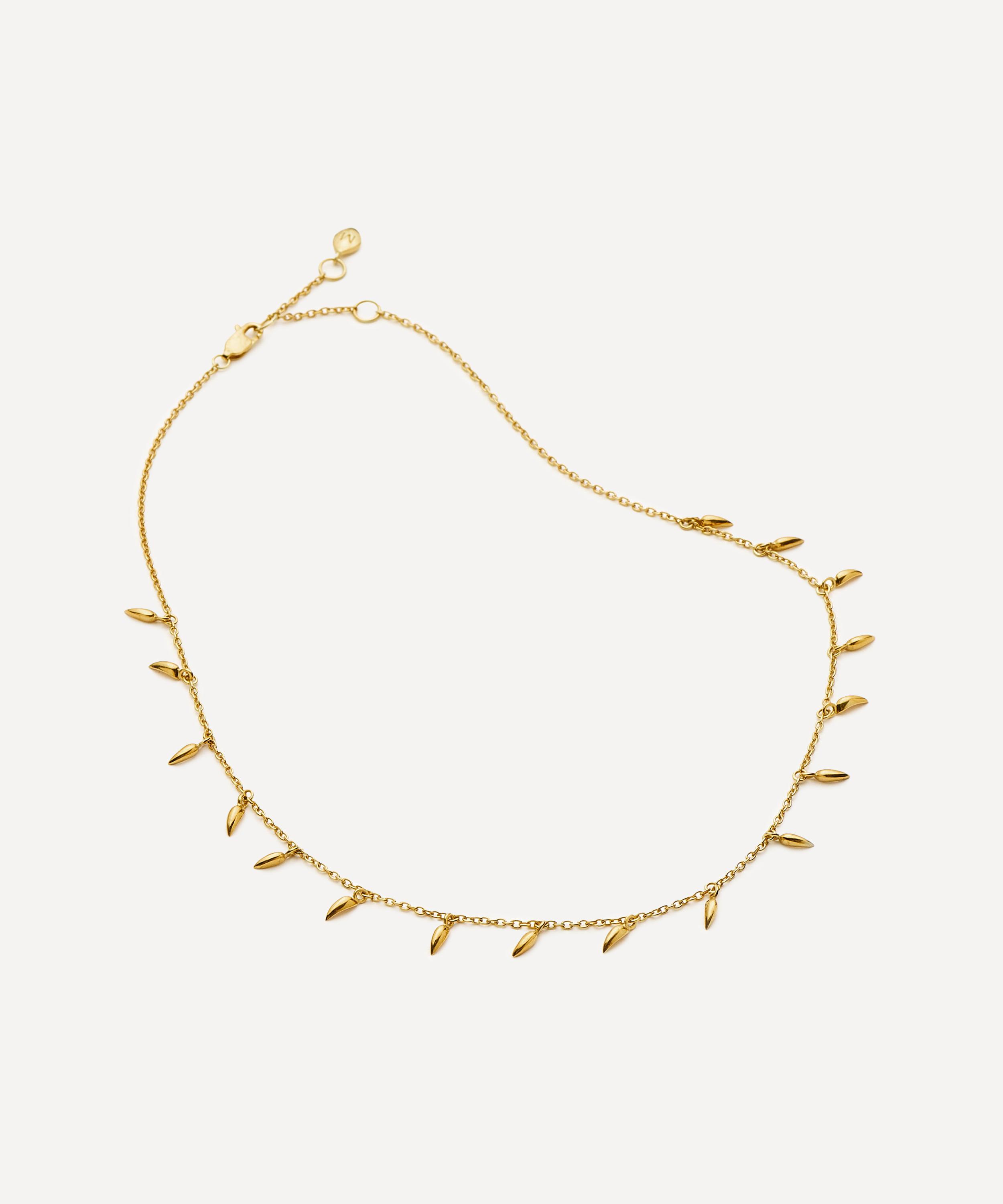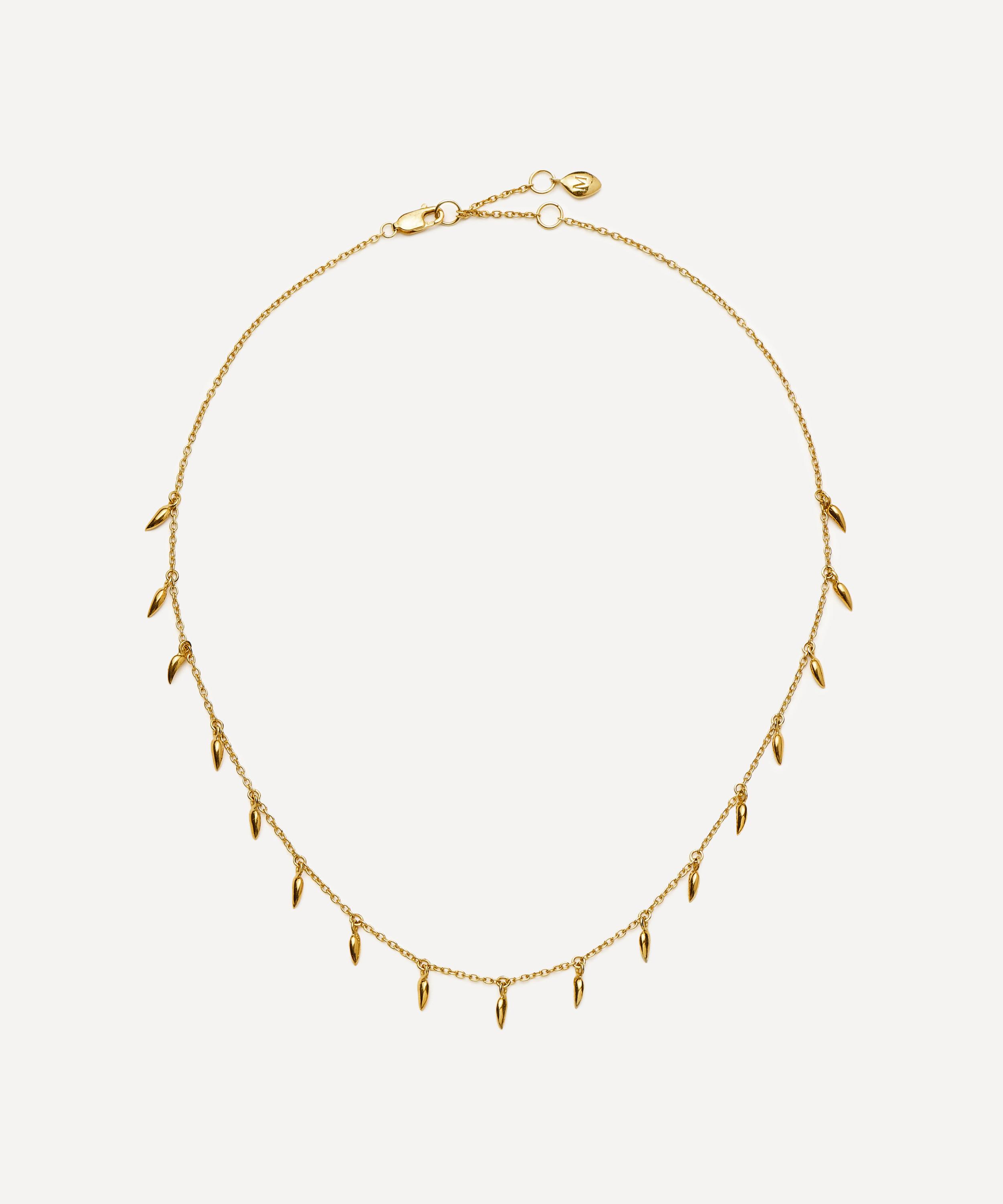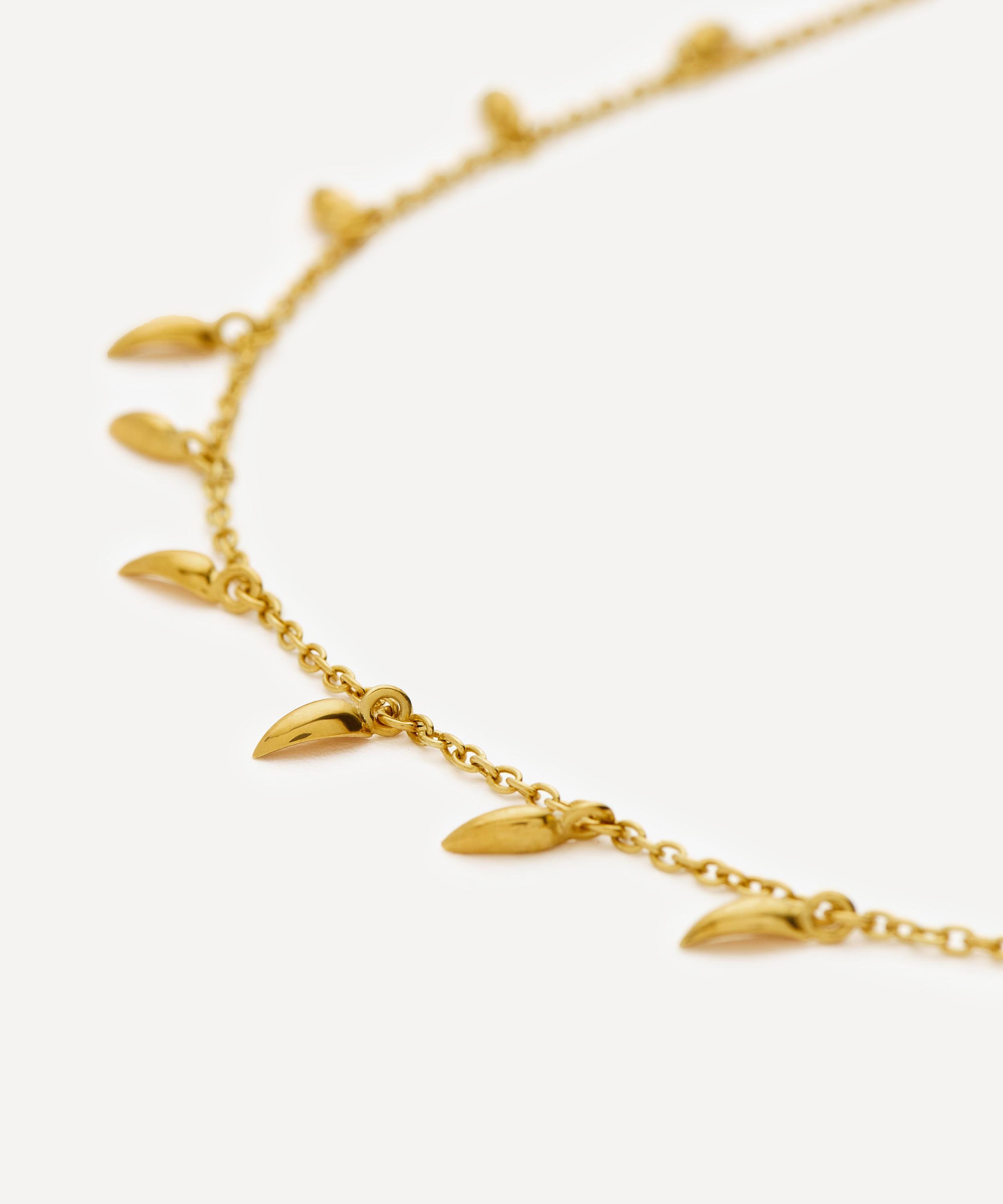 Crafted from sterling silver plated in 18ct gold vermeil, it features a delicate chain adorned with a multitude of mini fang charms, evenly spaced throughout. Style it solo, or incorporate it into a layered stack with additional chains and pendant necklaces for an on-trend look.