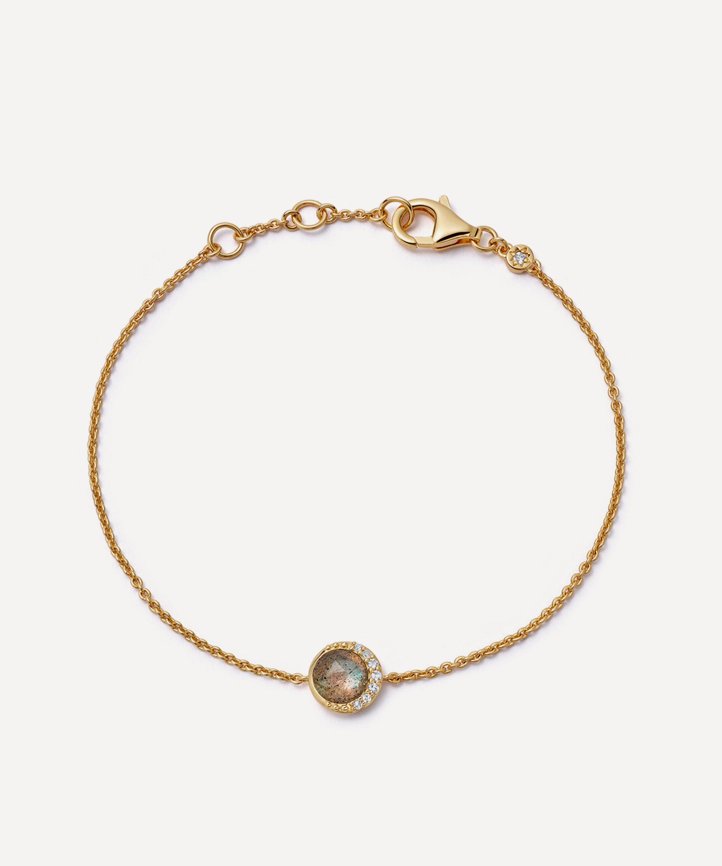 Crafted from sterling silver plated in 18ct gold vermeil, it features a round labradorite charm – a symbol of transformation, embellished with white sapphire accents forming a crescent moon around the outer edge of the stone. Offering endless styling options, wear yours on its own, layer with multiple bracelets, or pair it with the matching necklace and earrings for a coordinated look.