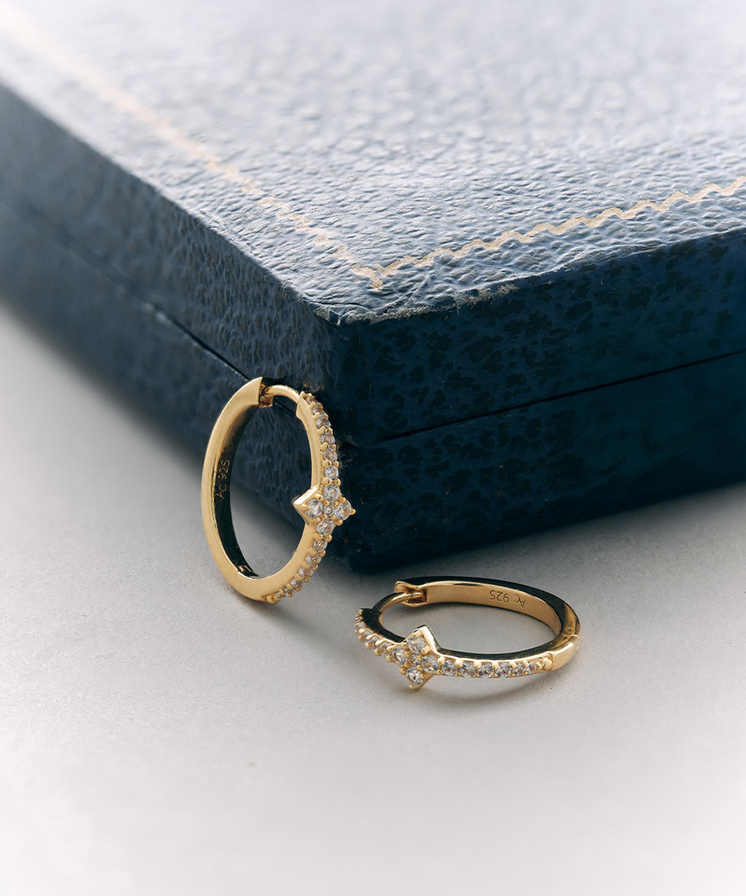 Crafted from sterling silver plated in 18ct gold vermeil, each earring features a timeless and classic design adorned with a flash of white sapphires to the front. Perfect for stacking, style this pair with other gold hoops and gold earrings, or pair with matching pieces from the collection.