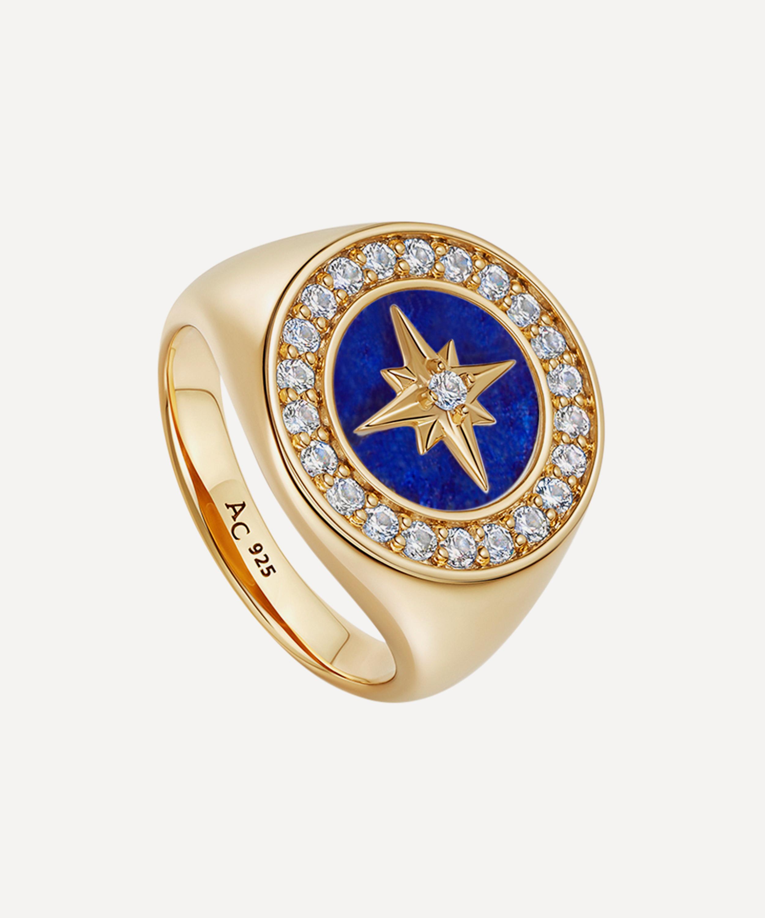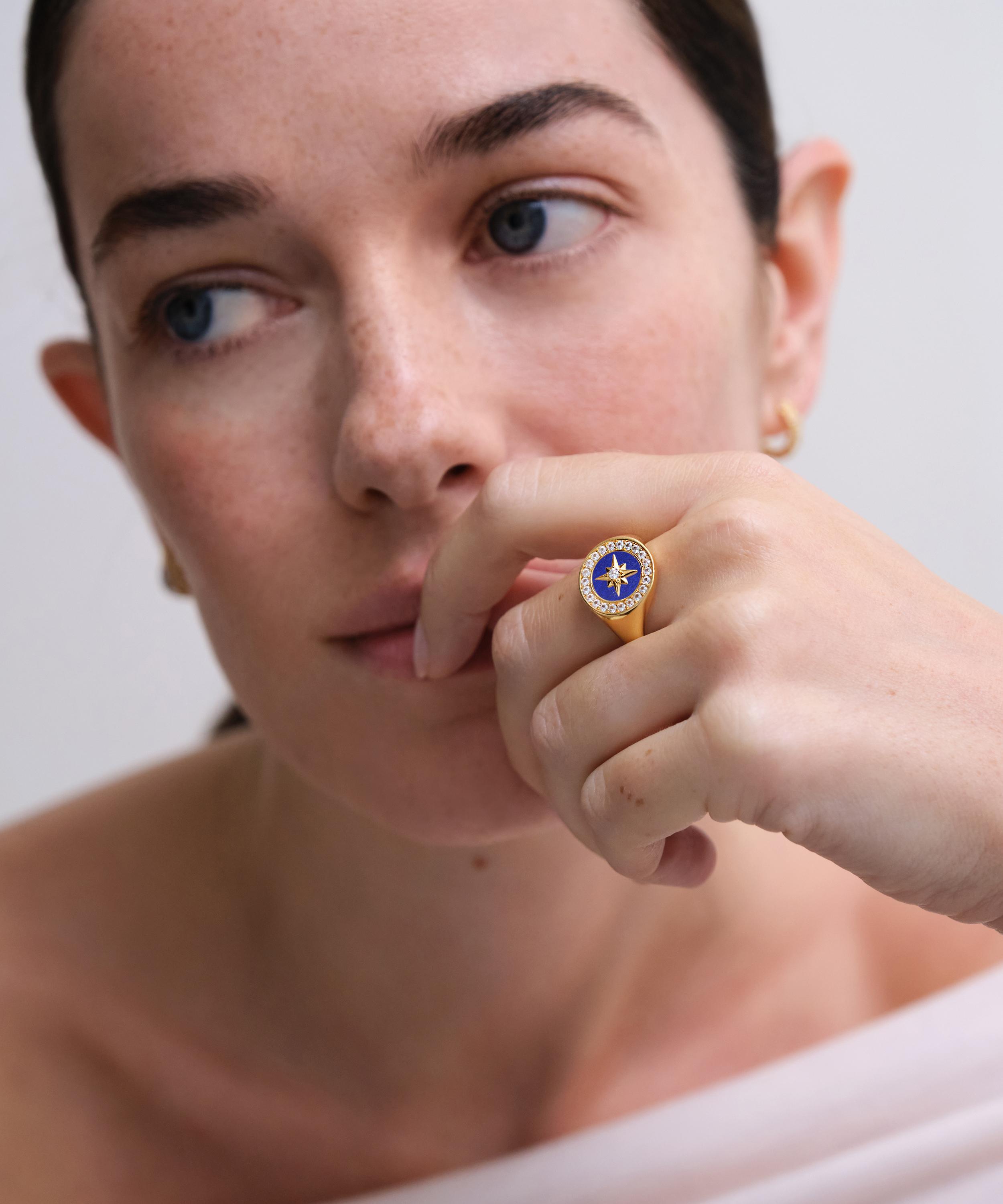 Inspired by the guiding light and beauty of the North Star, this ring is crafted from sterling silver plated in 18ct gold vermeil, featuring the brand’s signature North Star motif set in lapis lazuli encircled by studded white sapphires. Wear it solo, team it with another gold ring and several co-ordinating pieces from the collection, or gift it to a loved one.