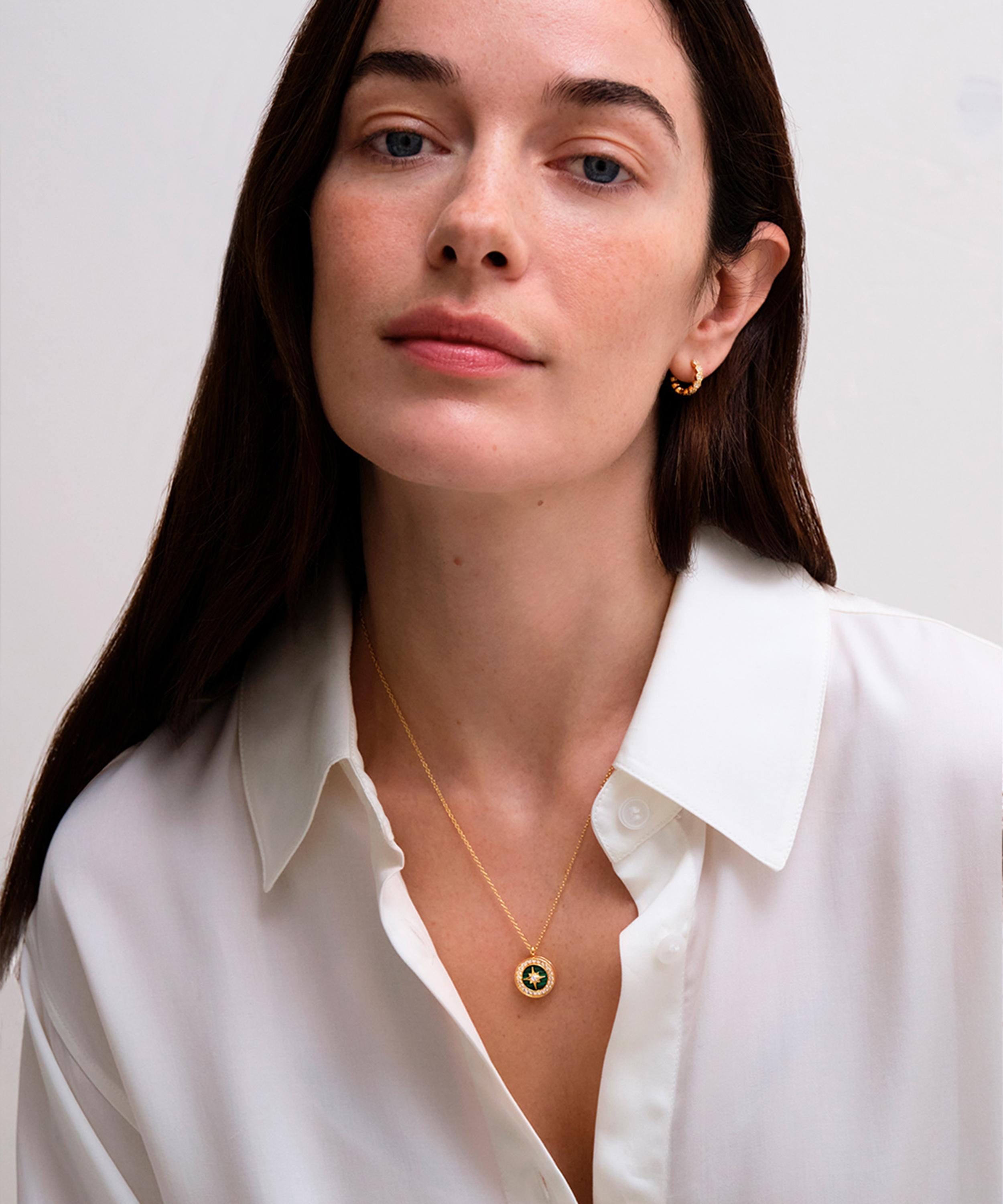 Inspired by the guiding light and beauty of the North Star, this necklace is crafted from sterling silver plated in 18ct gold vermeil, featuring the brand’s signature North Star motif set in green malachite encircled by studded white sapphires. Complete with a fine cable chain, wear it solo, team it with another gold necklace and several co-ordinating pieces from the collection, or gift it to a loved one.