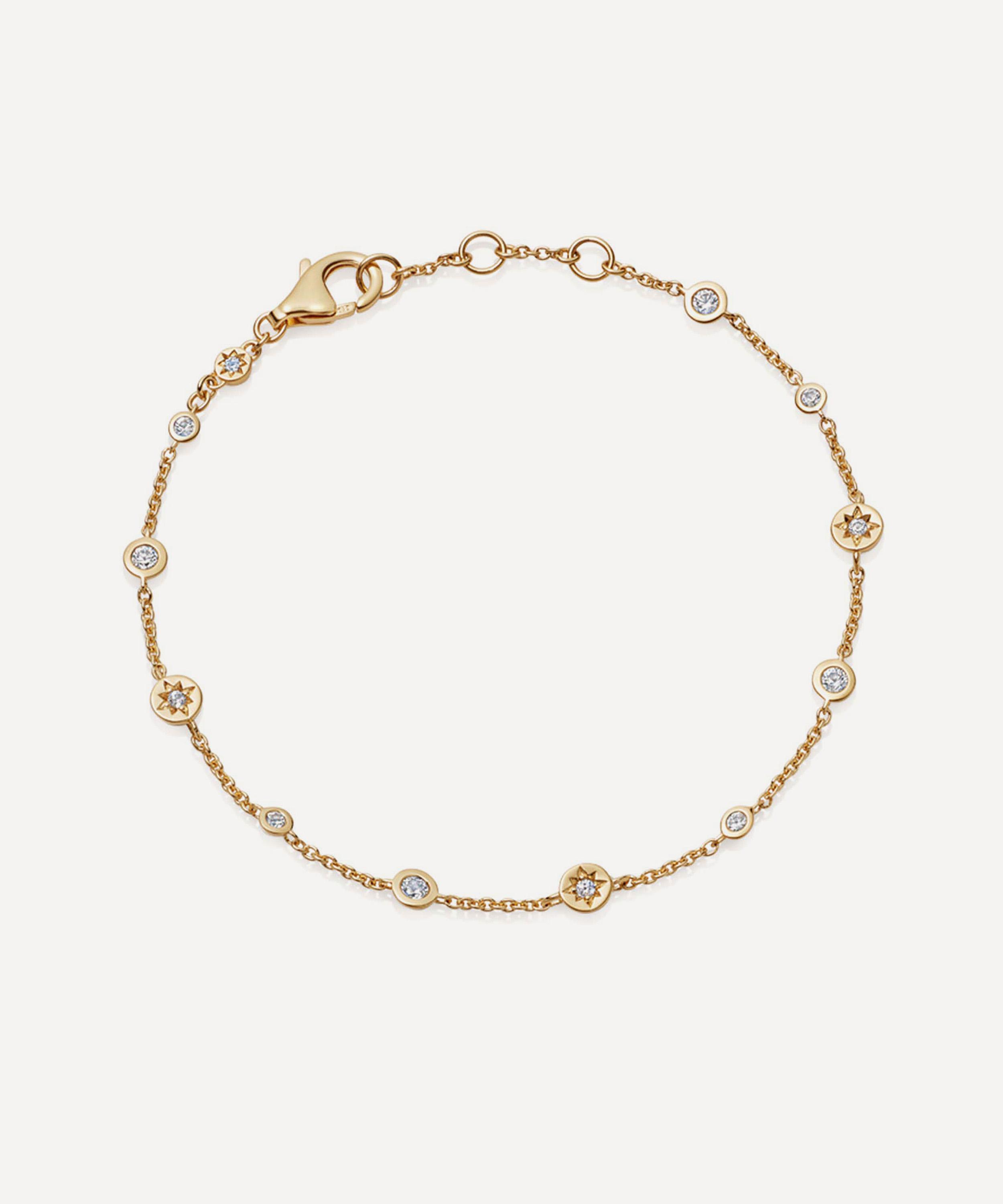 Inspired by the beauty of the North Star, this bracelet features a delicate trace chain, adorned with smooth, round discs set with white sapphires and intricate, engraved star motifs. Perfect for gifting or adding to your own jewellery line-up, it can be worn alone, stacked with other bracelets or styled with several coordinating pieces from the collection for a bold, contemporary take on a classic celestial motif.