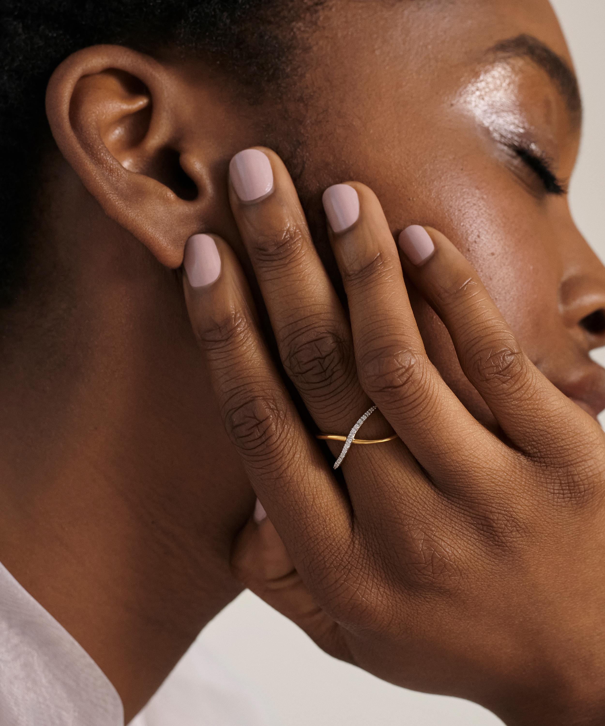 Give your jewellery collection a sparkling update with the Riva Diamond Kiss ring from Monica Vinader. This enchanting ring features an organic, two-band crossover design adorned with streak of handset pave’ diamonds – offering a romantic, glistening hue.