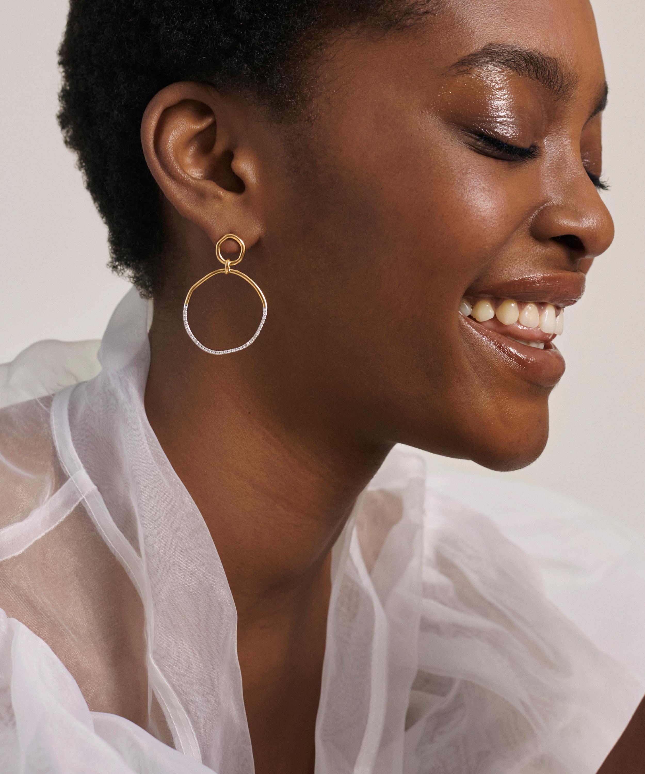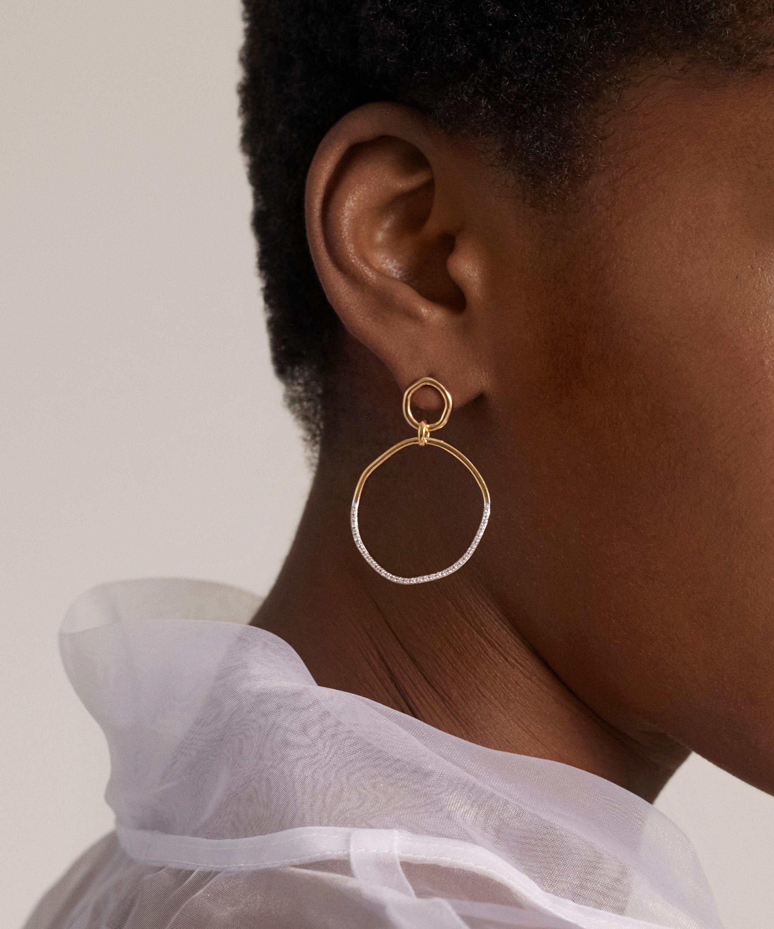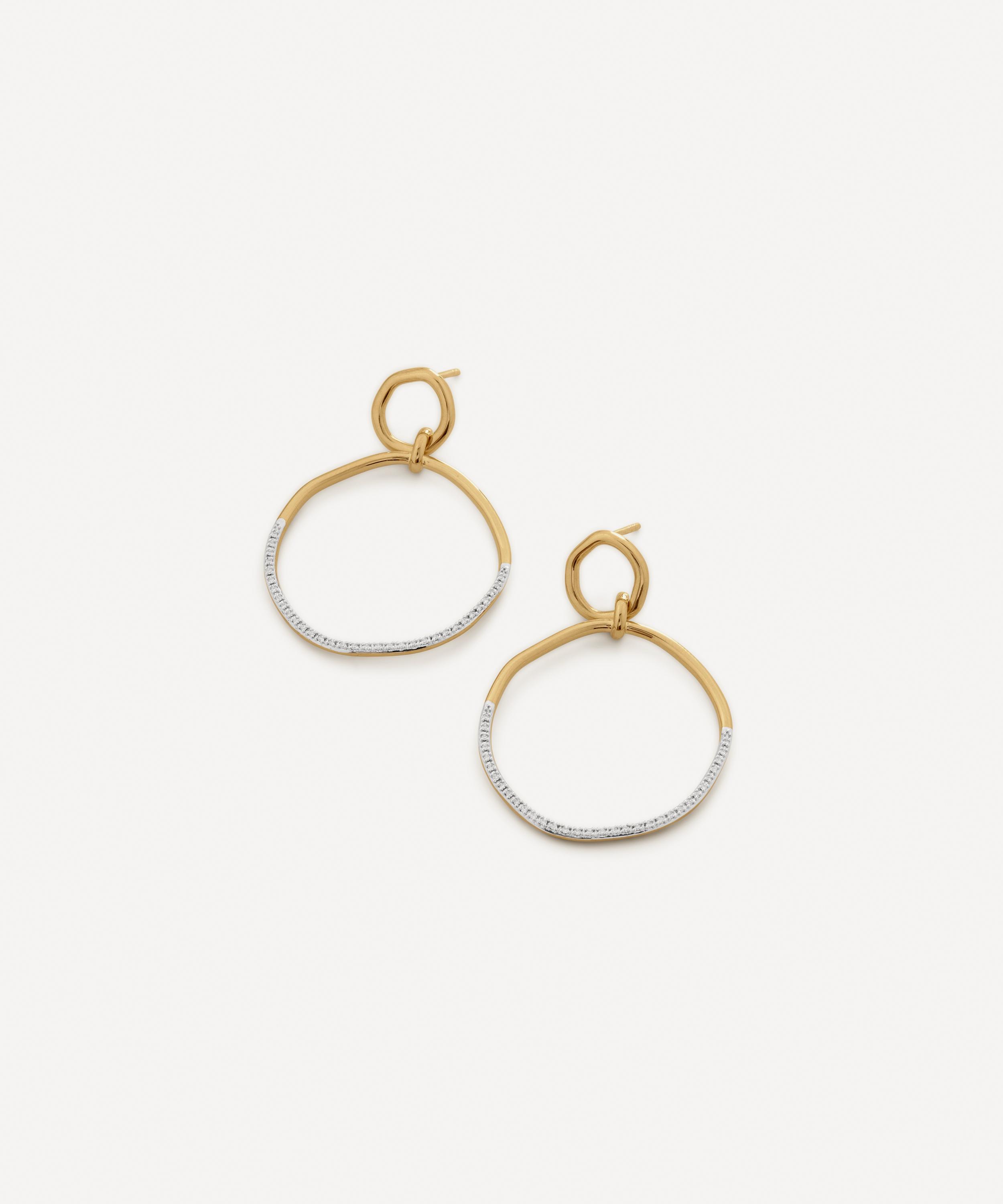 Give your jewellery collection a sparkling update with the Riva Diamond Ripple cocktail hoop earrings from Monica Vinader. Each earring features two, organic-shaped hoops, inspired by ripples of water, adorned with a handset diamond pave’ covering the bottom half.