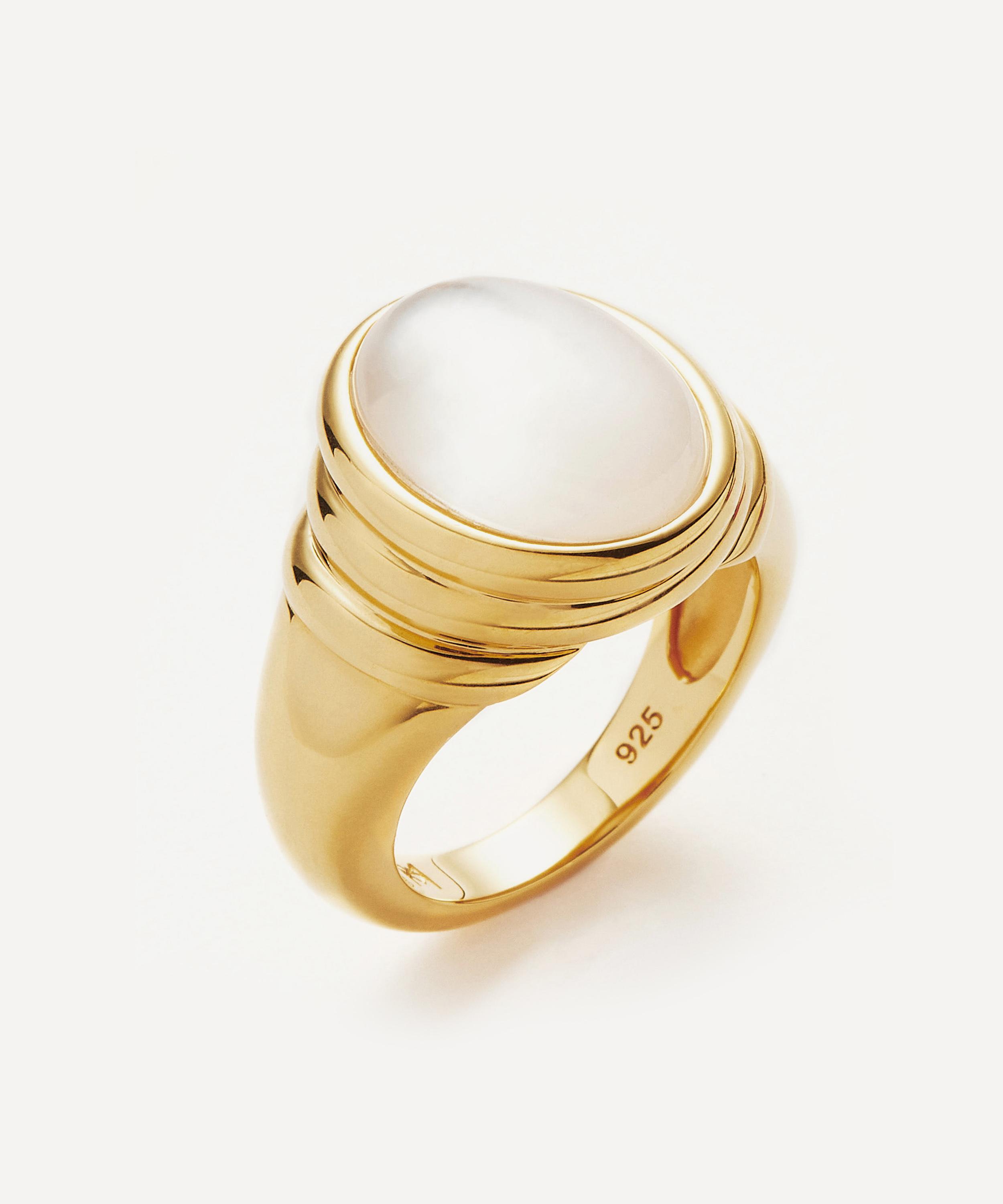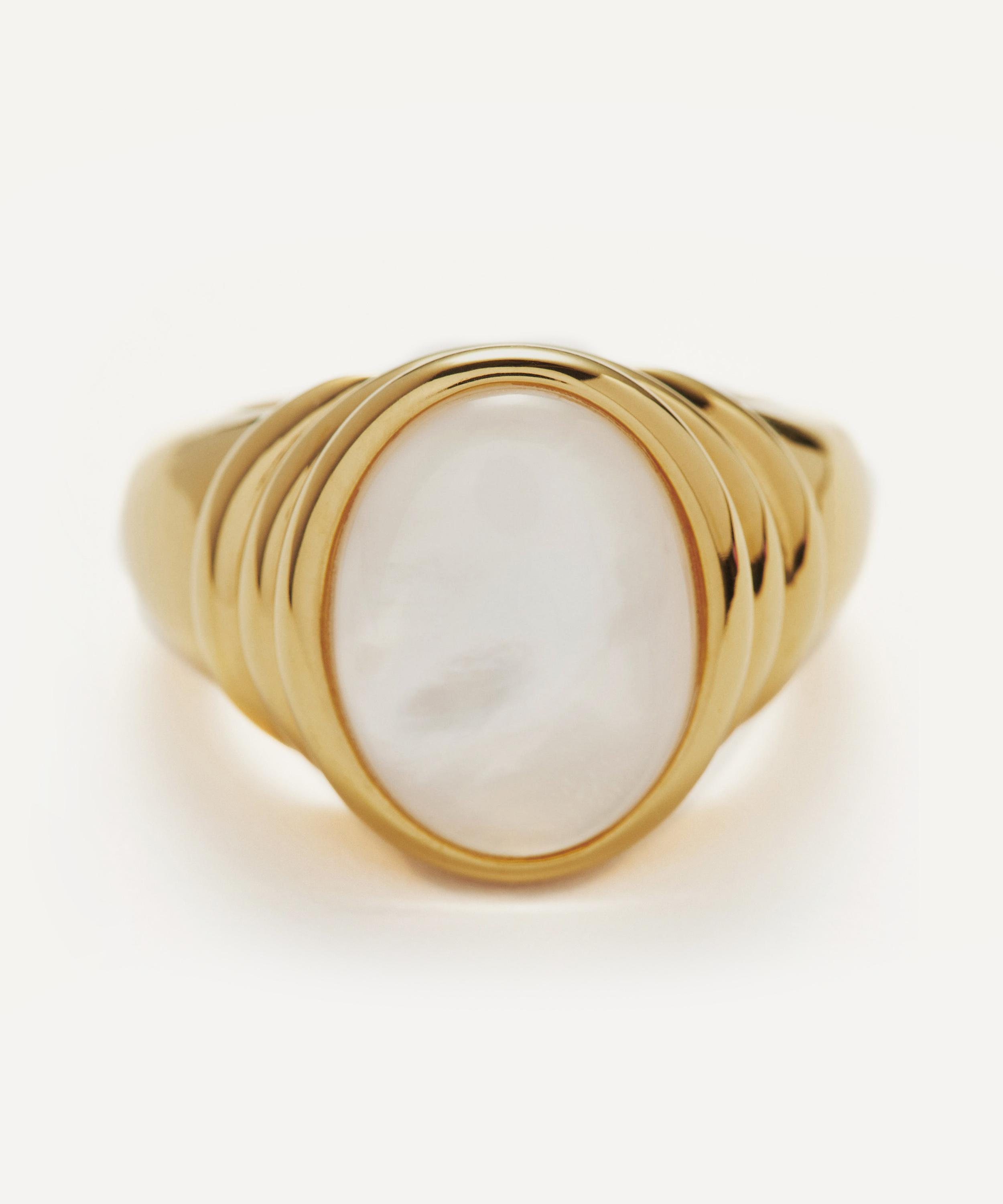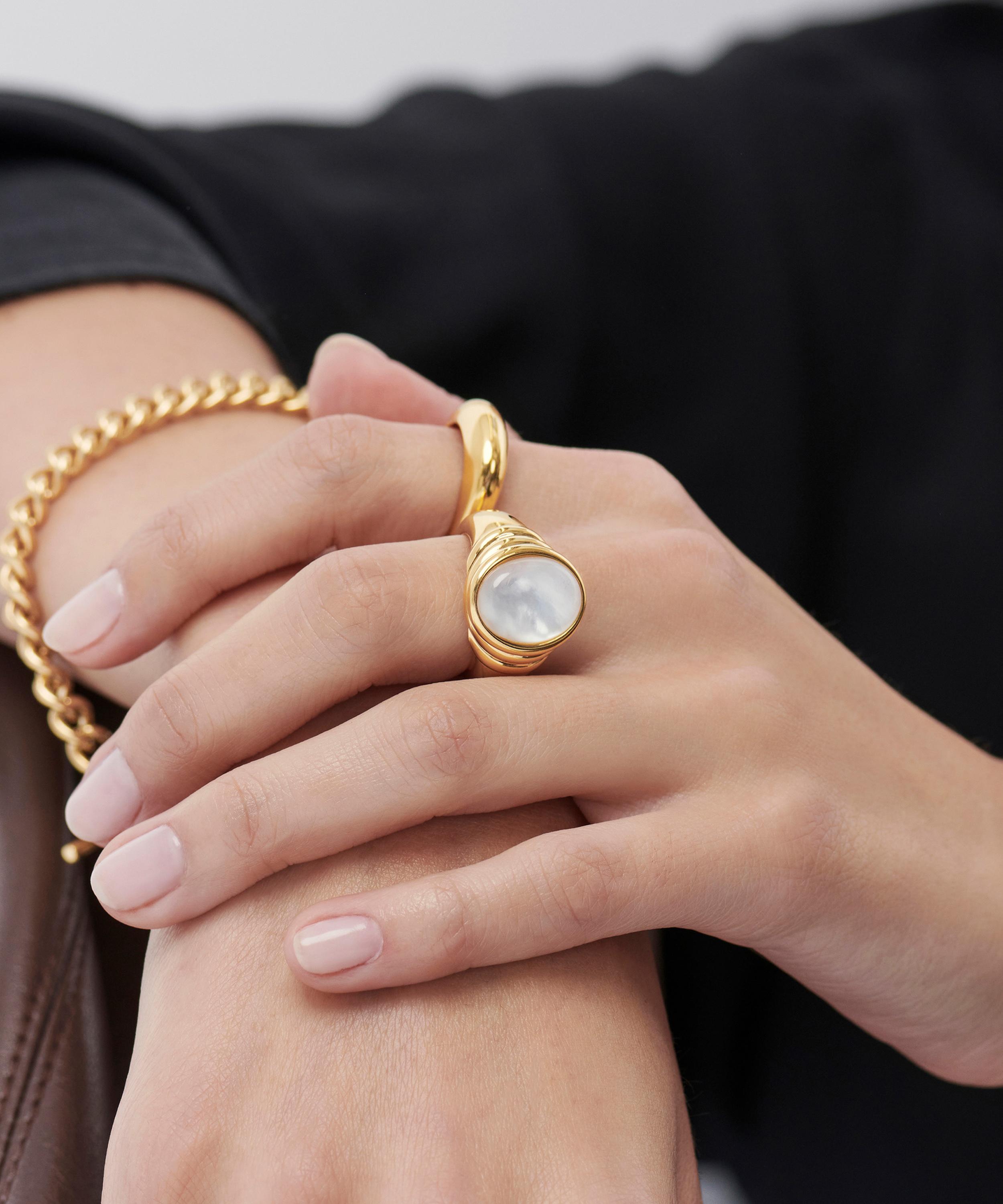 The Savi Ridge gemstone ring is part of the Savi x Missoma collection, featuring domed rings, gemstone bracelets and pendant necklaces made in collaboration with creative SAVISLOOK. Inspired by organic forms, this ring is crafted from recycled silver plated in 18ct gold vermeil. The ring features a dome-like shape with a raised mother of pearl oval doublet stone and crystal quartz top layer. The chunky band is embellished with triple ridge detailing, lending this piece a unique design, perfect for when you want to make a statement.