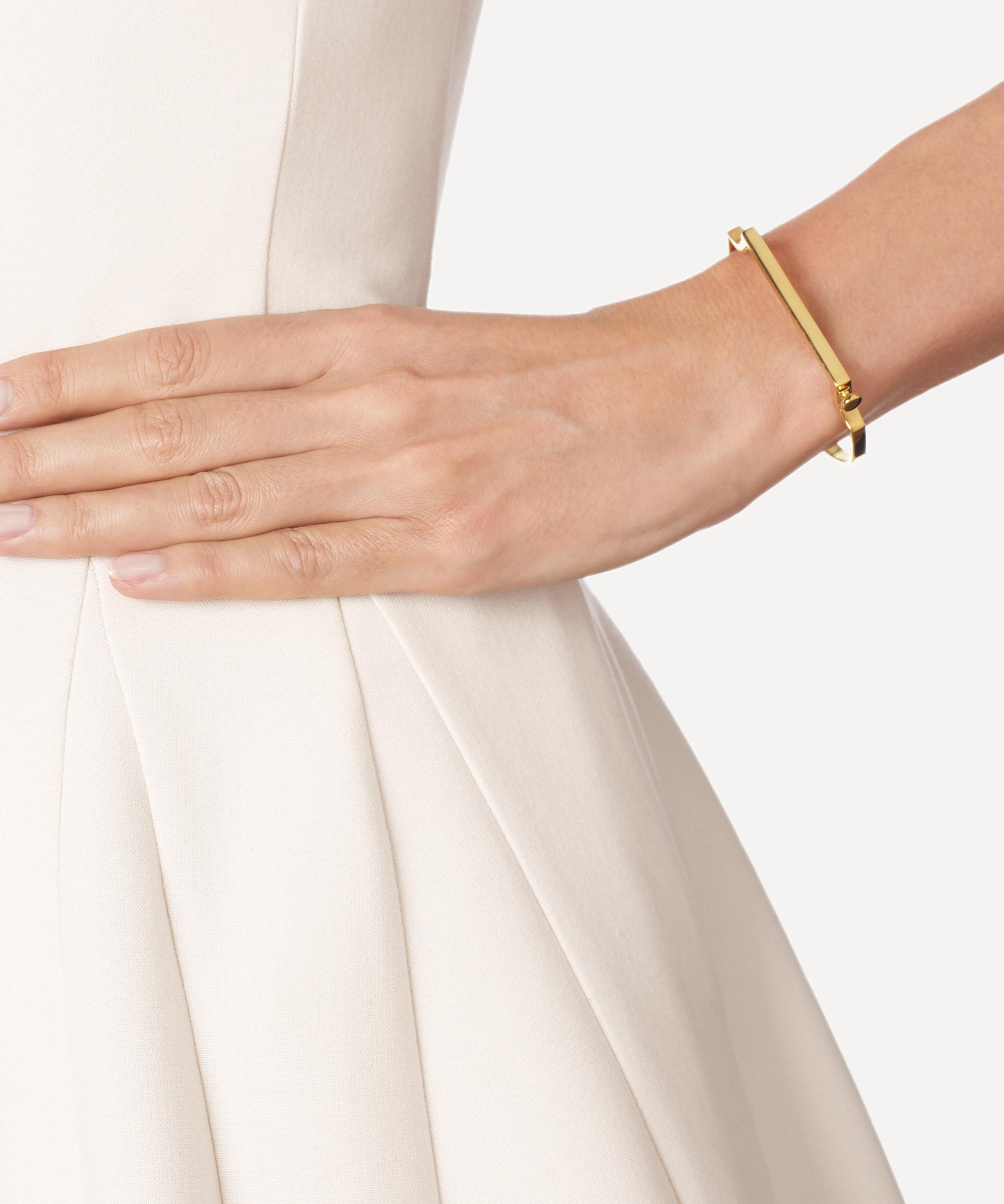 Combining strong clean lines with flowing curves, every piece from the Signature collection is imbued with modernity and femininity. This thin bangle is beautifully simple whether worn alone or stacked with others from the collection. It slips on and off with ease while maintaining a snug fit thanks to the hinged bar feature and snap fastening. The slender bar is also suitable for engraving, making it the perfect gift for a friend or loved one.