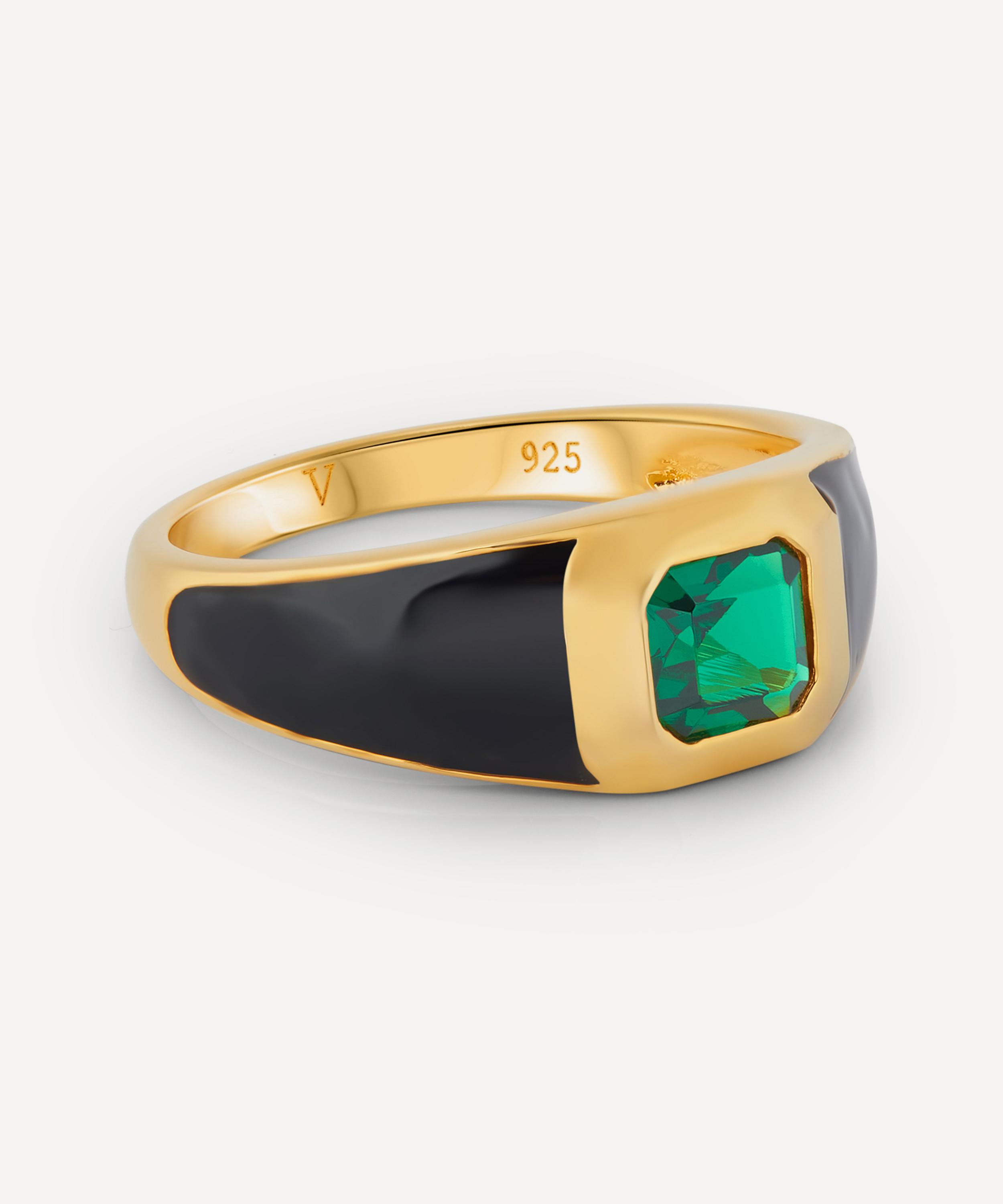 Designed to stand the test of time, the Sophie signet ring from V by Laura Vann is perfect for a touch of everyday elegance. Crafted from sterling silver plated in 18ct gold vermeil, this Art Deco-inspired piece features a domed silhouette and gypsy stone setting accented by black enamel and an emerald green cubic zirconia at the centre.