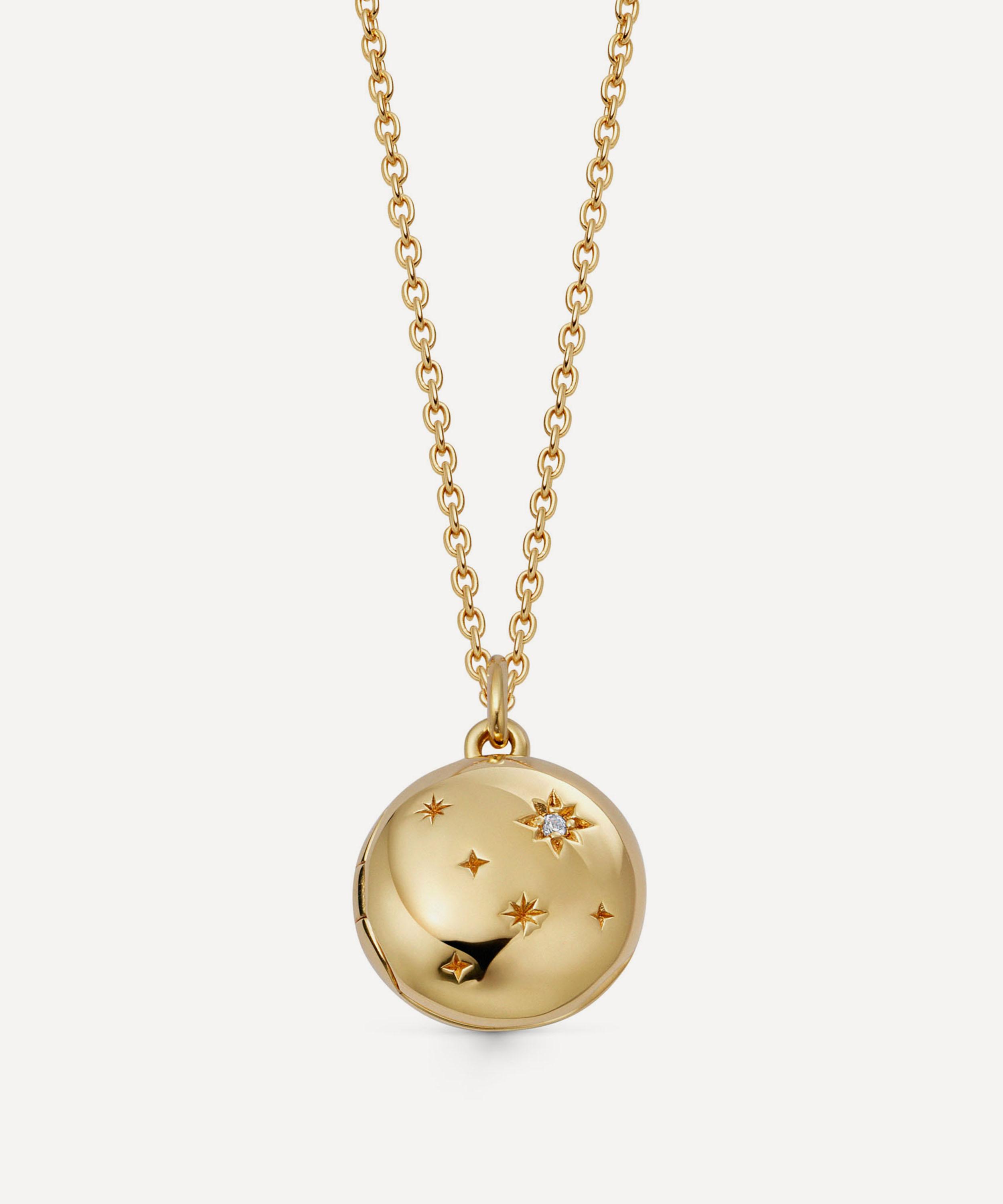 Crafted from sterling silver plated in 18ct gold vermeil, it features a fine trace chain and round locket, beautifully embellished with engraved stars and a single white sapphire. The locket opens to reveal two 8mm slots, offering the option to add two special photographs. Boasting a meaningful piece that you can treasure for years to come, or gift to a loved one, it can be styled as solo piece or layered with classic chains and additional pendant necklaces to build a curated stack.