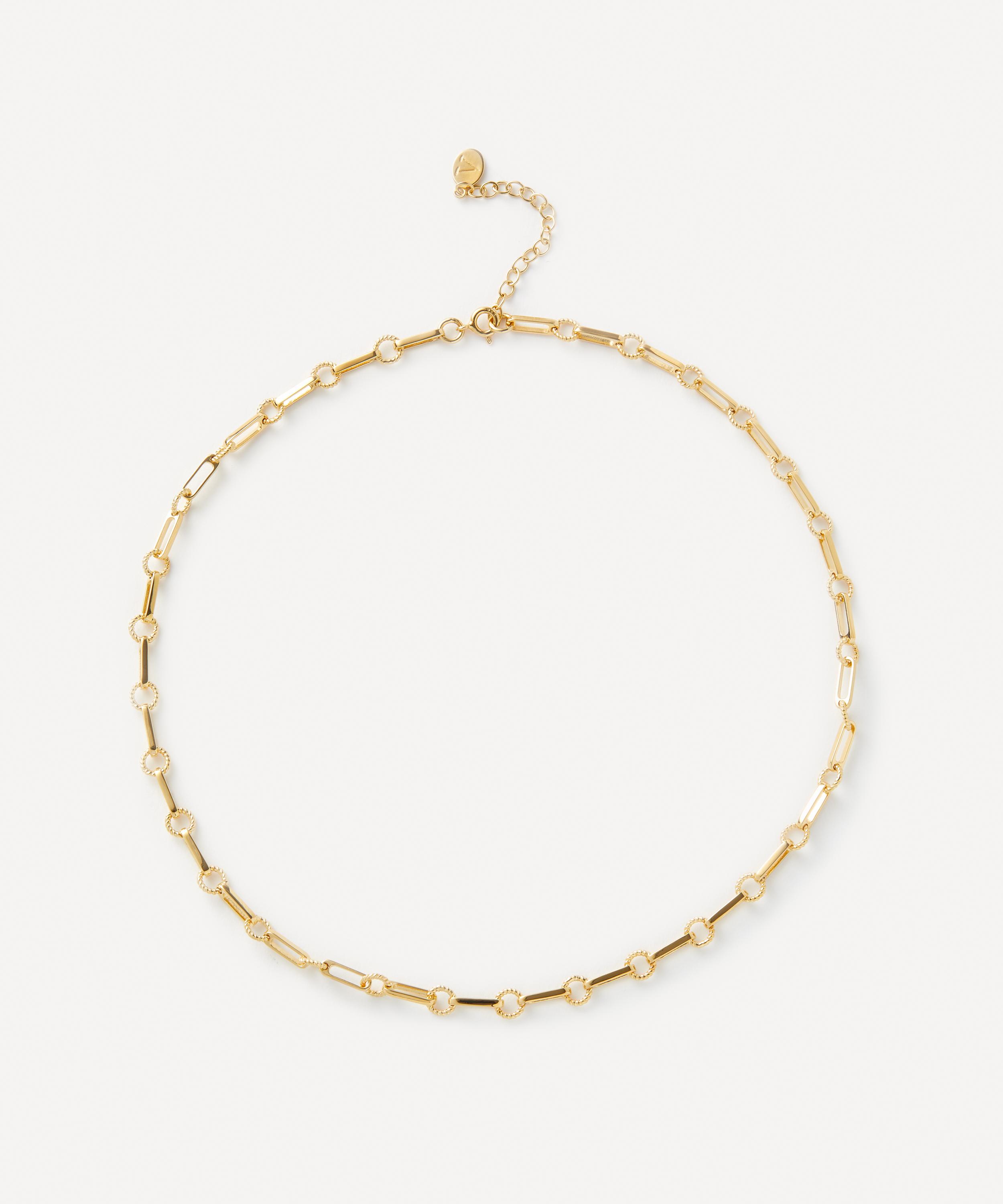 Timeless and versatile, this chain necklace from V by Laura Vann is perfect for a touch of everyday elegance. Crafted from sterling silver plated in 18ct gold vermeil, it features a unique, vintage-inspired design where intricately twisted rings juxtapose against polished oblong links. Wear it by itself, layer with other necklaces, or customise it with the brand’s gemstone charms.