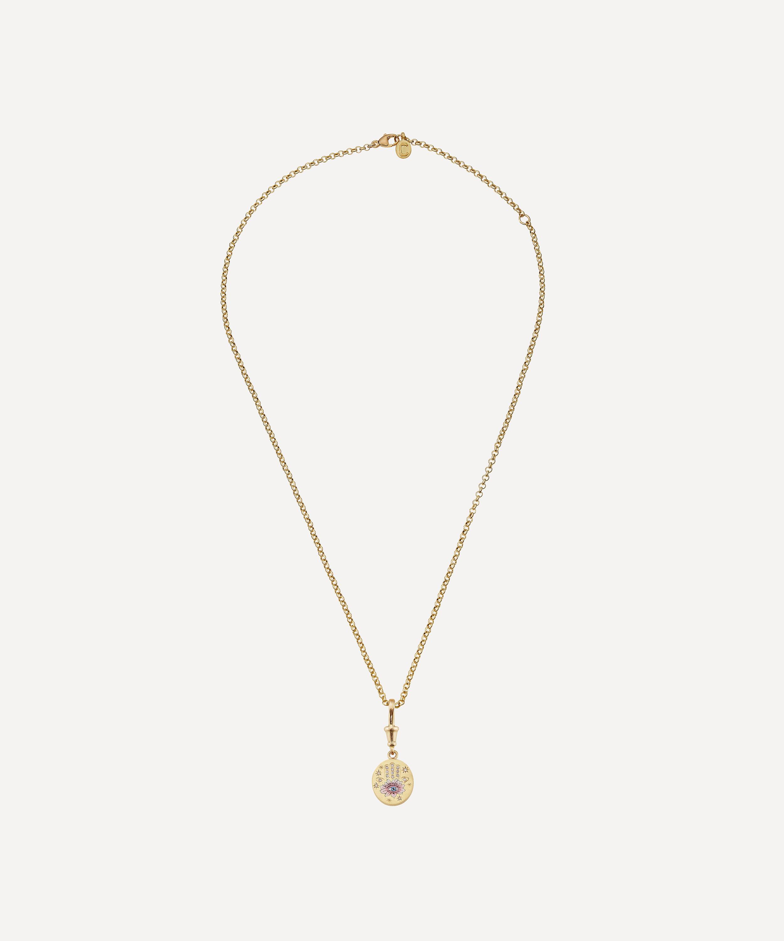 Handcrafted from frosted 18 carat gold, it features an oval-shaped medallion, hand-enamelled in delicate pastels with a blue eye gazing out from a pink-tinged lotus flower. The miniature scene is intricately detailed with an engraved, diamond studded palm, finished with diamond set stars and an engraved candle motif on the back. A wearable work of art, it's perfect for gifting or adding to your own jewellery line-up - style it solo or mix and match with other favourites.