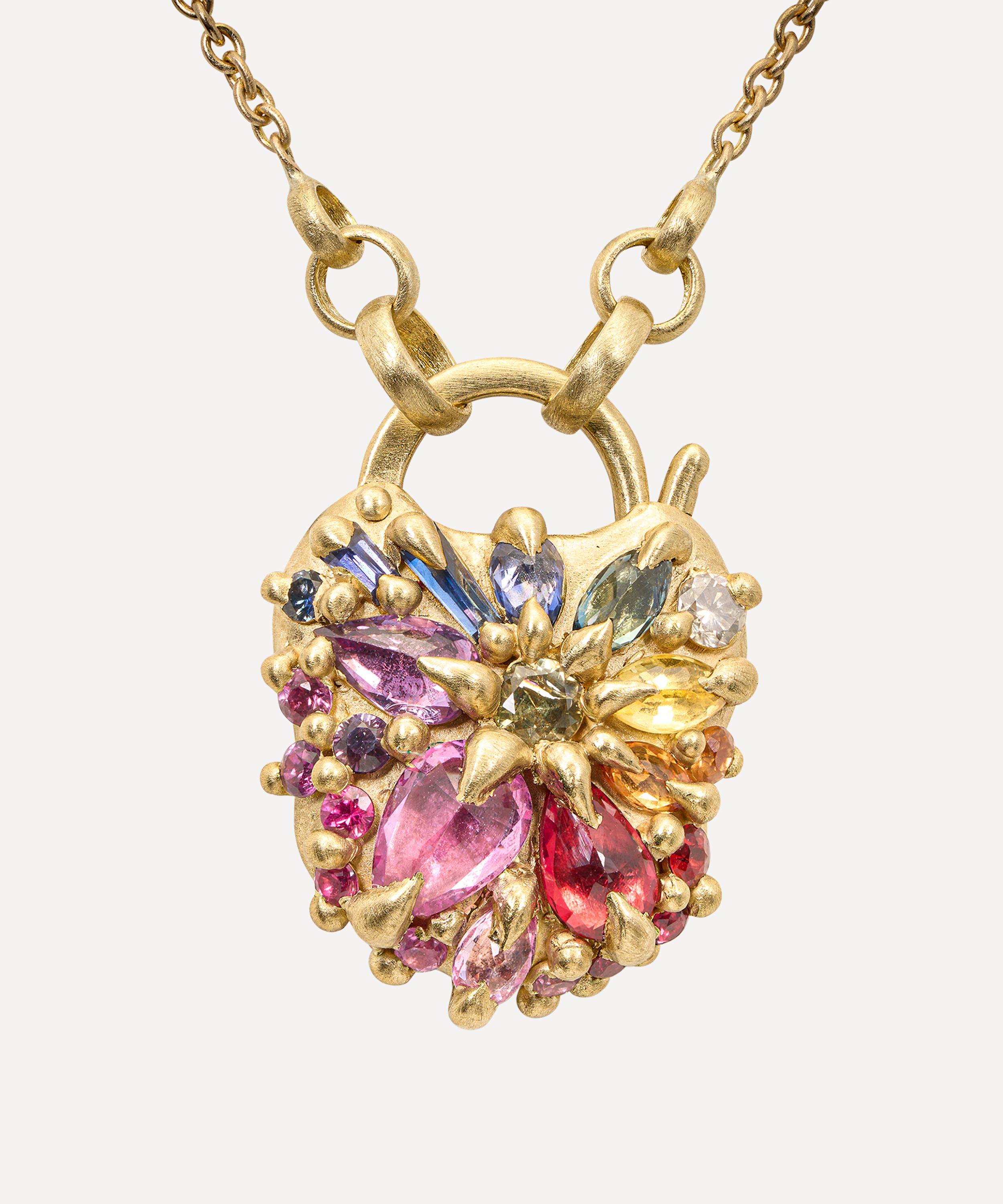 Epitomising the British designer's tough-luxe aesthetic, this eye-catching pendant necklace by Polly Wales brings a dazzling touch of colour to everyday outfits. Rendered in solid 18ct gold, it features a heart-shaped padlock pendant cast with vibrant rainbow sapphires in a bouquet of cuts. Complete with a cable chain with handmade graduated rolo links, style it with a selection of your favourite necklaces and other pieces from the brand for a multi-hued jewellery curation.