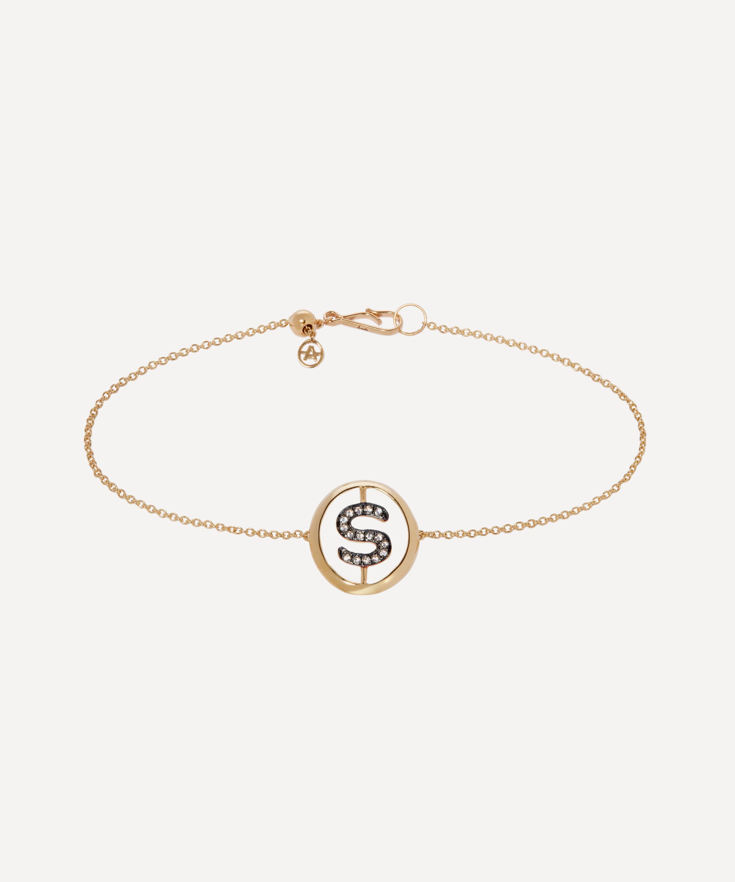 Annoushka offers its signature sophisticated take on alphabet jewellery with the gold Initial bracelet – a simple fine gold chain set with a 22-diamond letter fixed inside a polished gold oval.