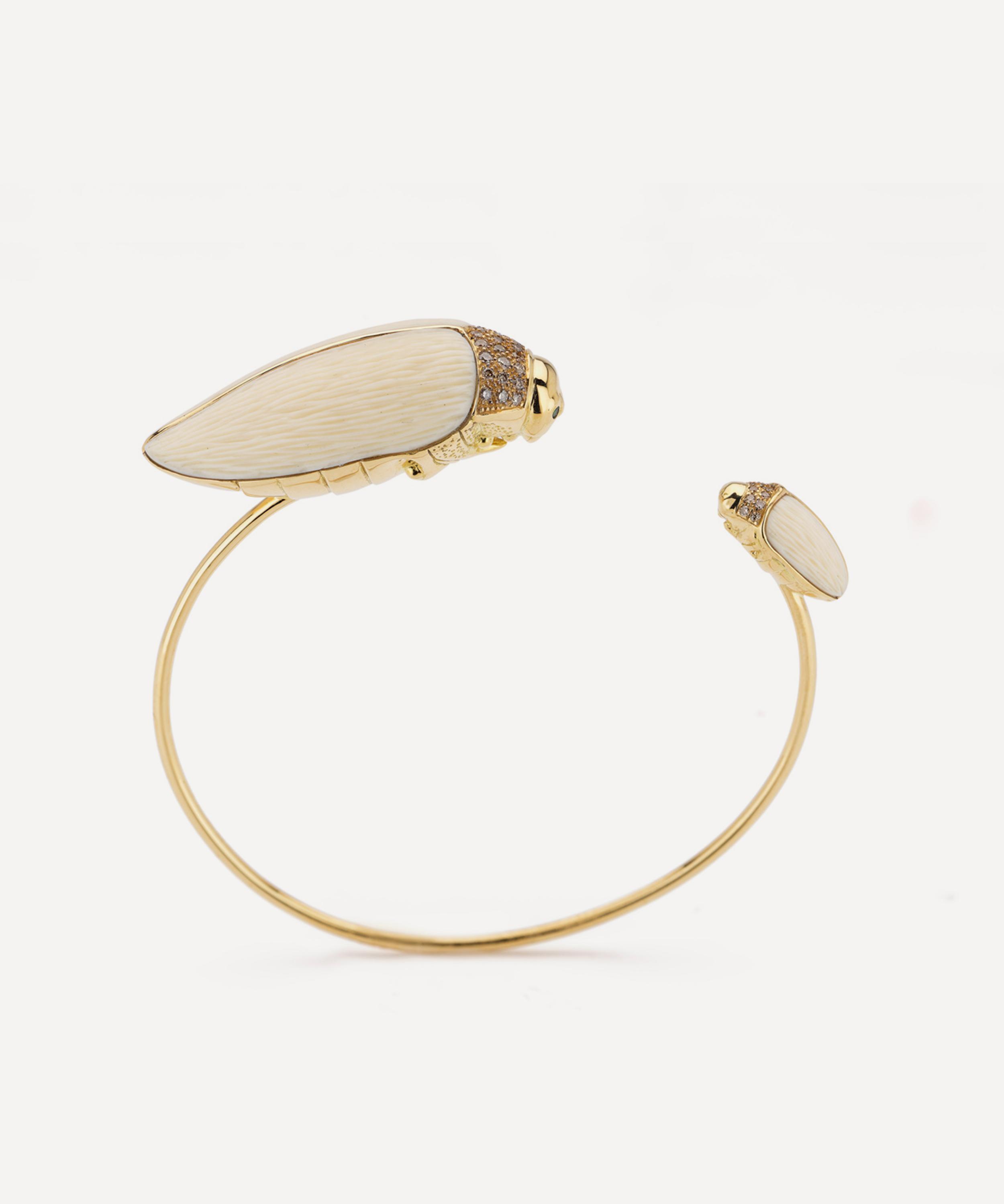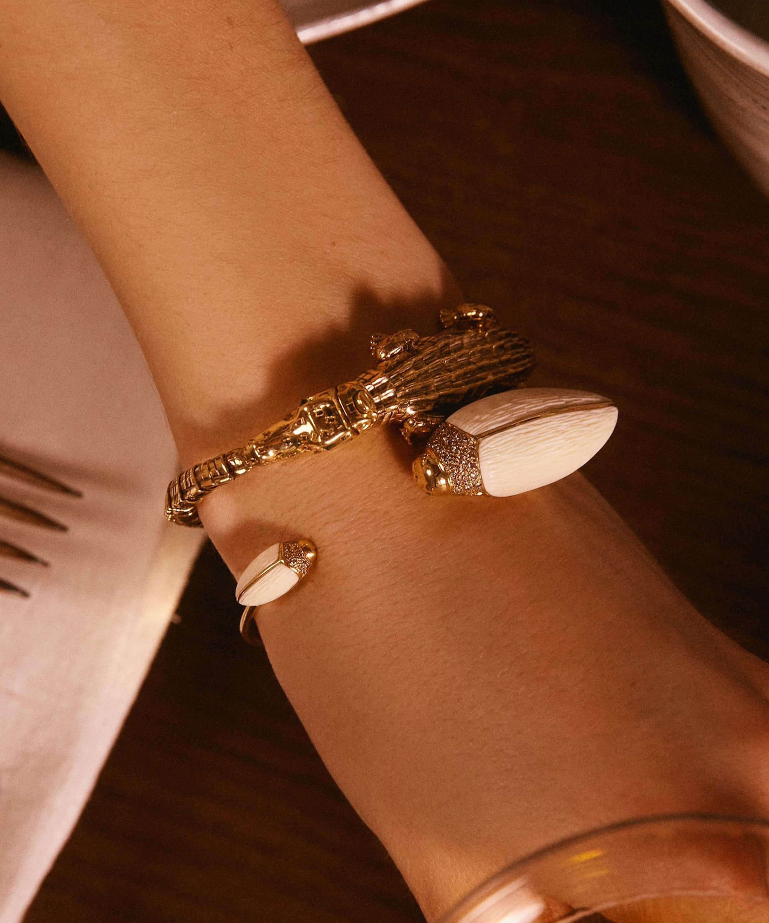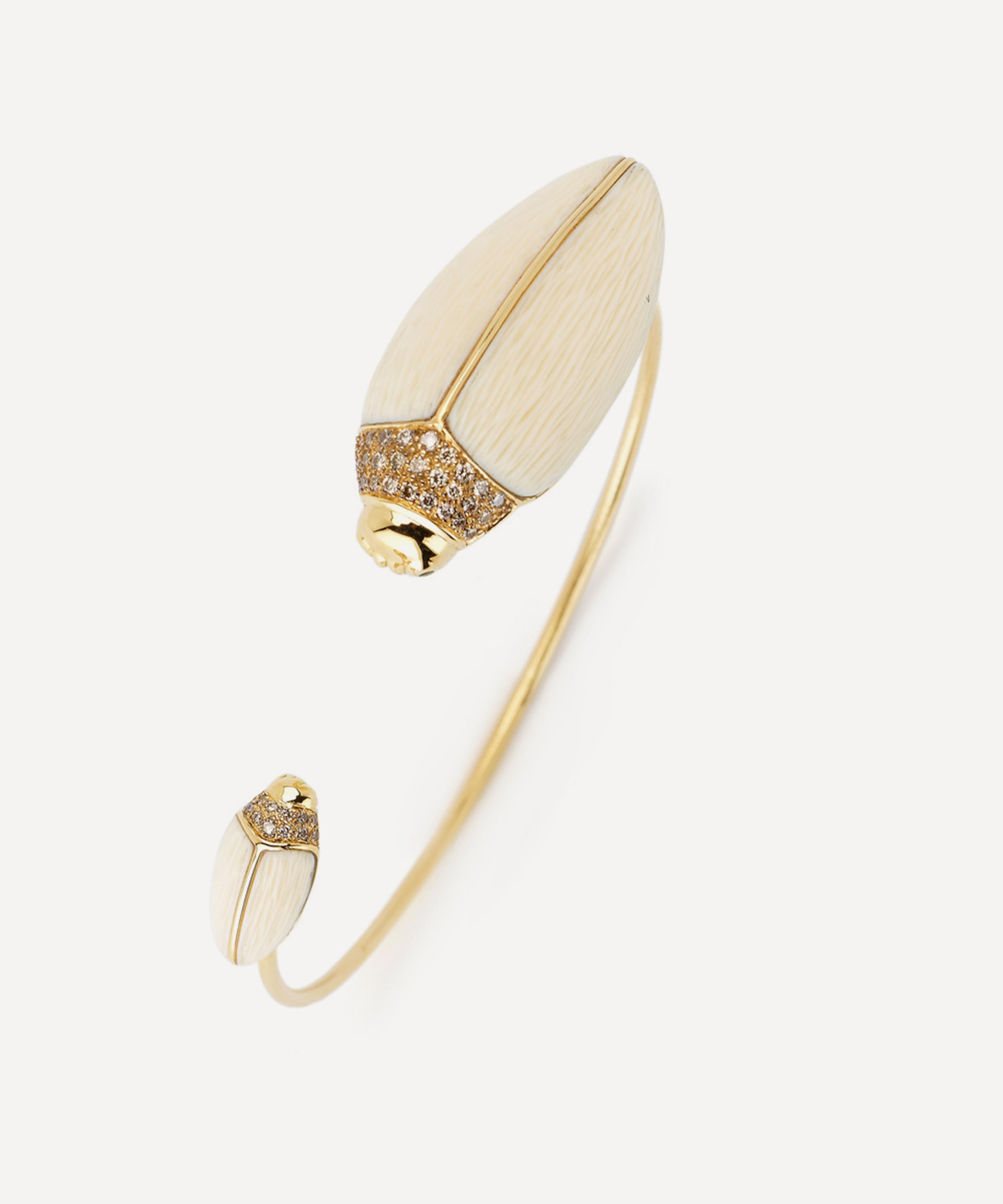 Inspired by the auspicious and powerful symbols in Egyptian mythology, this piece captures the multifaceted scarab beetle, brought to life in carved mammoth tusk with an 18ct gold overlay. Elegantly framing the wrist with its open-ended design, the scarab’s sculptural body is glinting with a constellation of brown diamonds, whilst on the opposite end, the bangle is capped with a streamlined piece of mammoth tusk, echoing the scarab and completing the piece with a symmetrical grace. Whether styled in a curated stack, or as a statement piece, wear it as a symbol of your own evolution – untamed, unapologetic, and entirely unique.