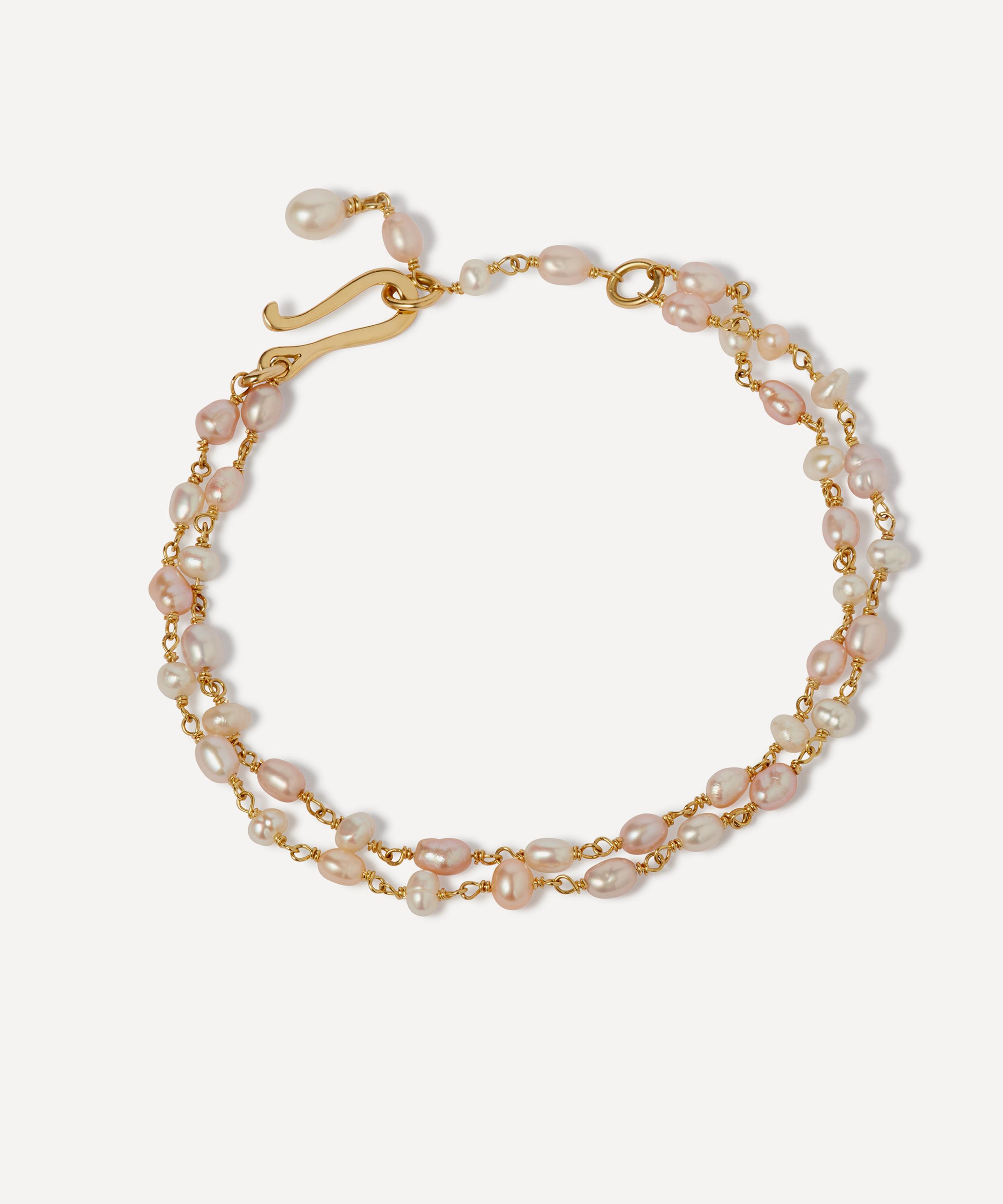 Build your own elevating stack with this elegant bracelet from Annoushka. Crafted from 18ct gold, it features delicate, double-layered link chain hand-threaded with freshwater seeds pearls in pastel shades of peach, pink, and creamy white. Wear it as a solo piece for a minimalistic approach or pair it with other bracelets.