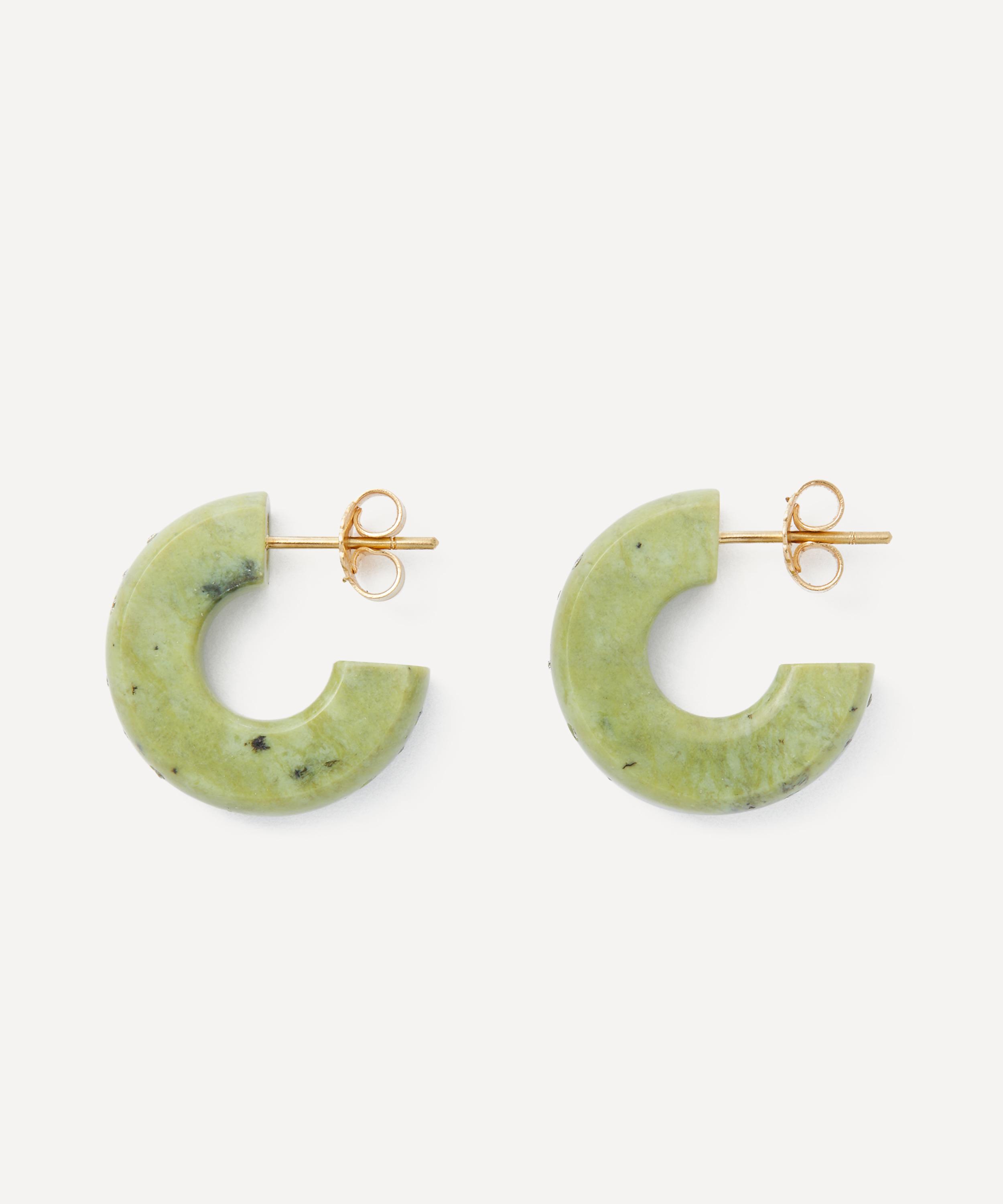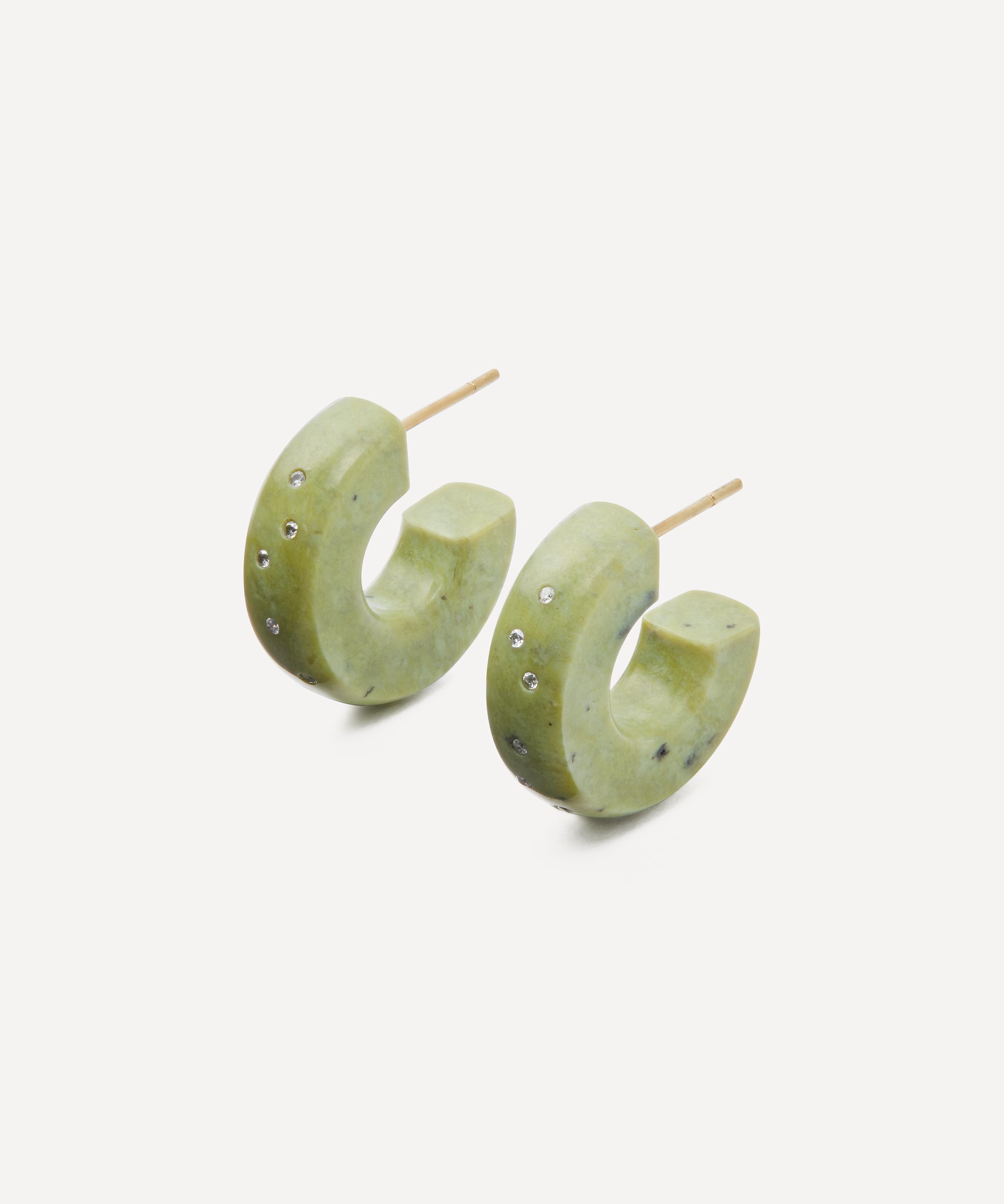 Transform your look with Jacqueline Cullen’s bold and seductive huggie hoop earrings. Inspired by the dramatic forces of nature, each earring features a half hoop made from solid serpentine, embellished with a scattering of sparkling diamonds. Complete with frosted 18ct gold post backings, style these beautiful earrings solo, or pair them with other hoops and studs for a layered effect.