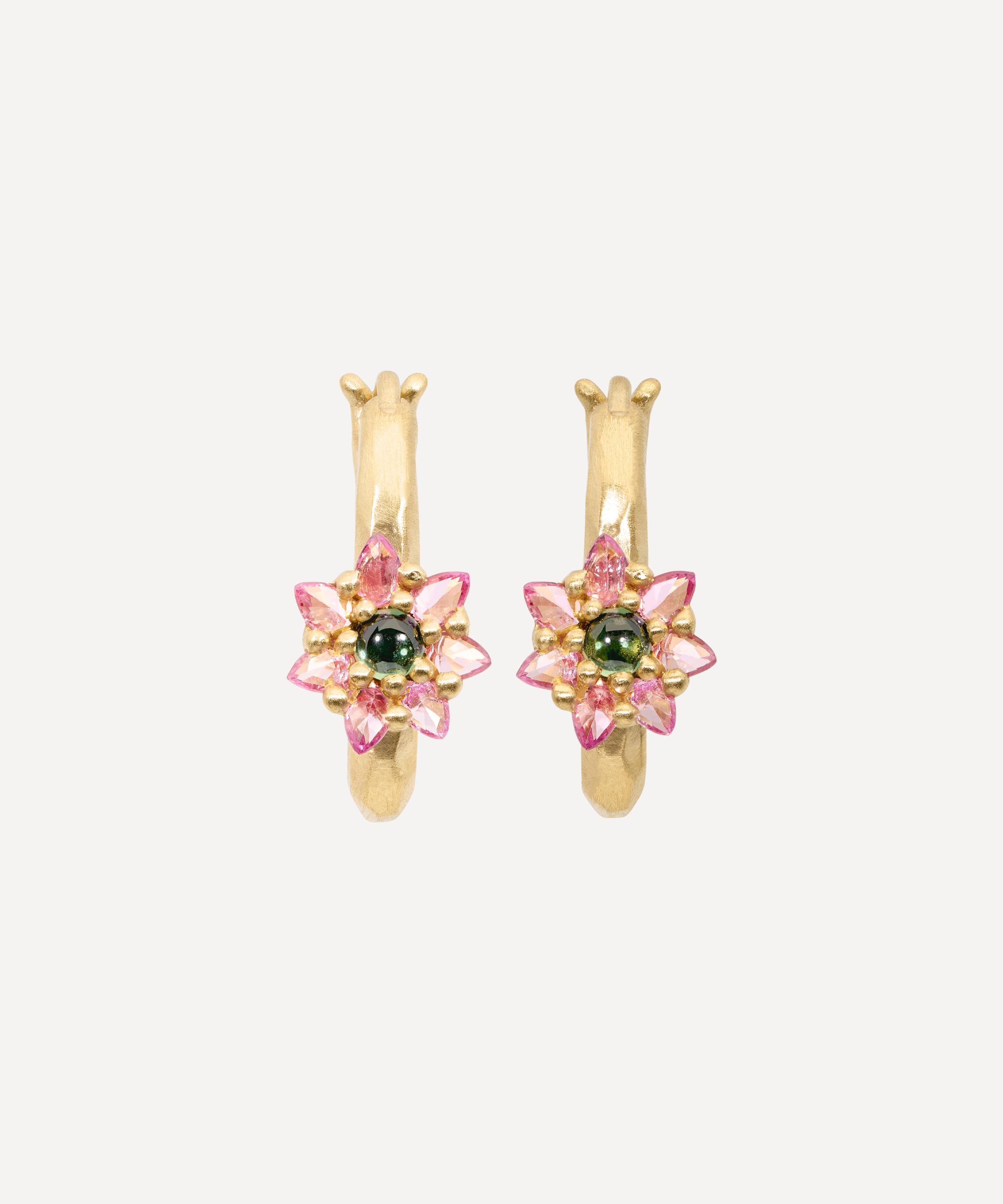 Epitomising the British designer's signature tough-luxe aesthetic, these hoop earrings by Polly Wales add a fun touch to your edit. Crafted from 18ct gold, each earring features an oval-shaped silhouette, adorned with round and marquise cut sapphires in green and pink, arranged in a daisy cluster. Try pairing them with other pieces from the brand for a kaleidoscopic jewellery curation.