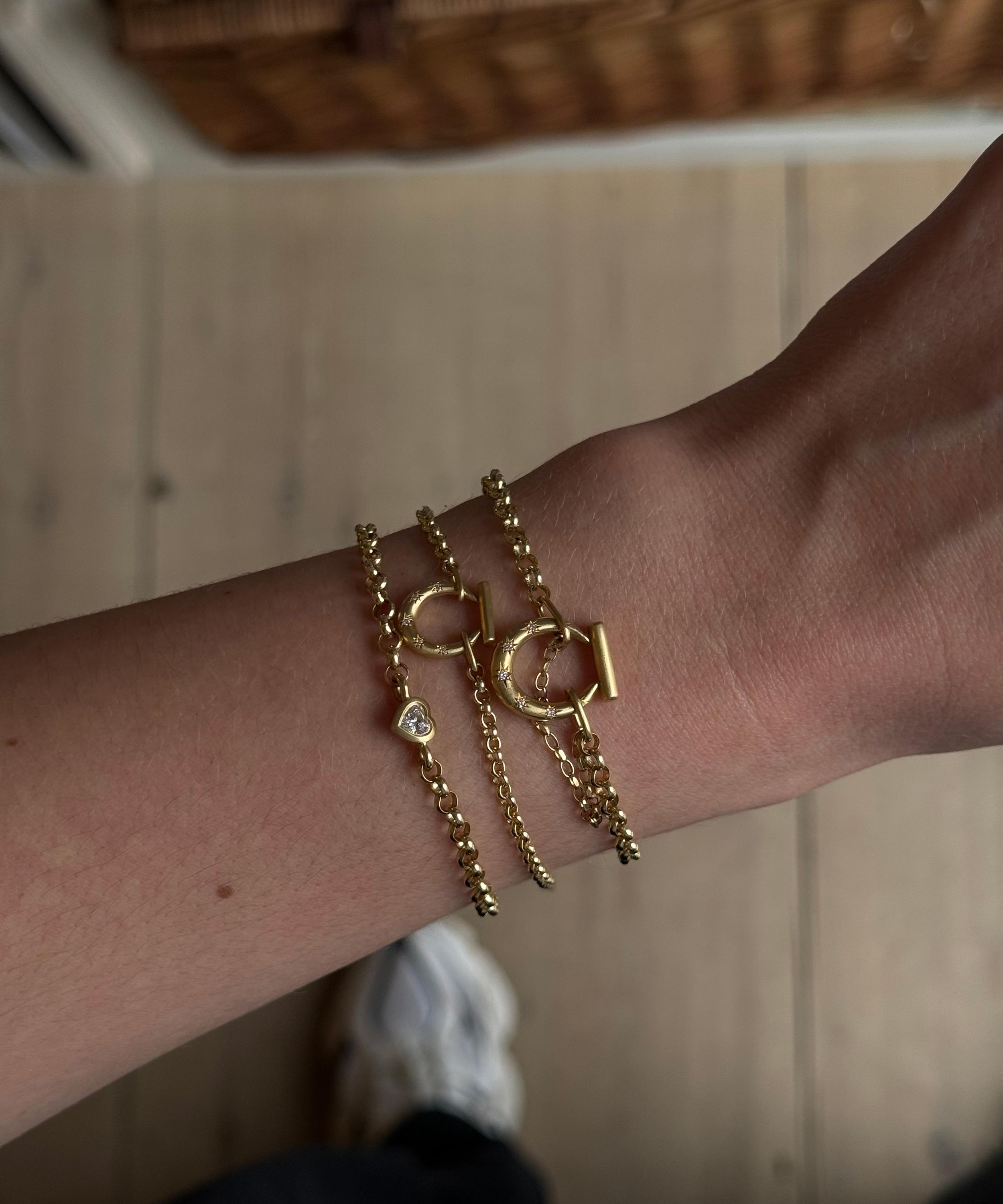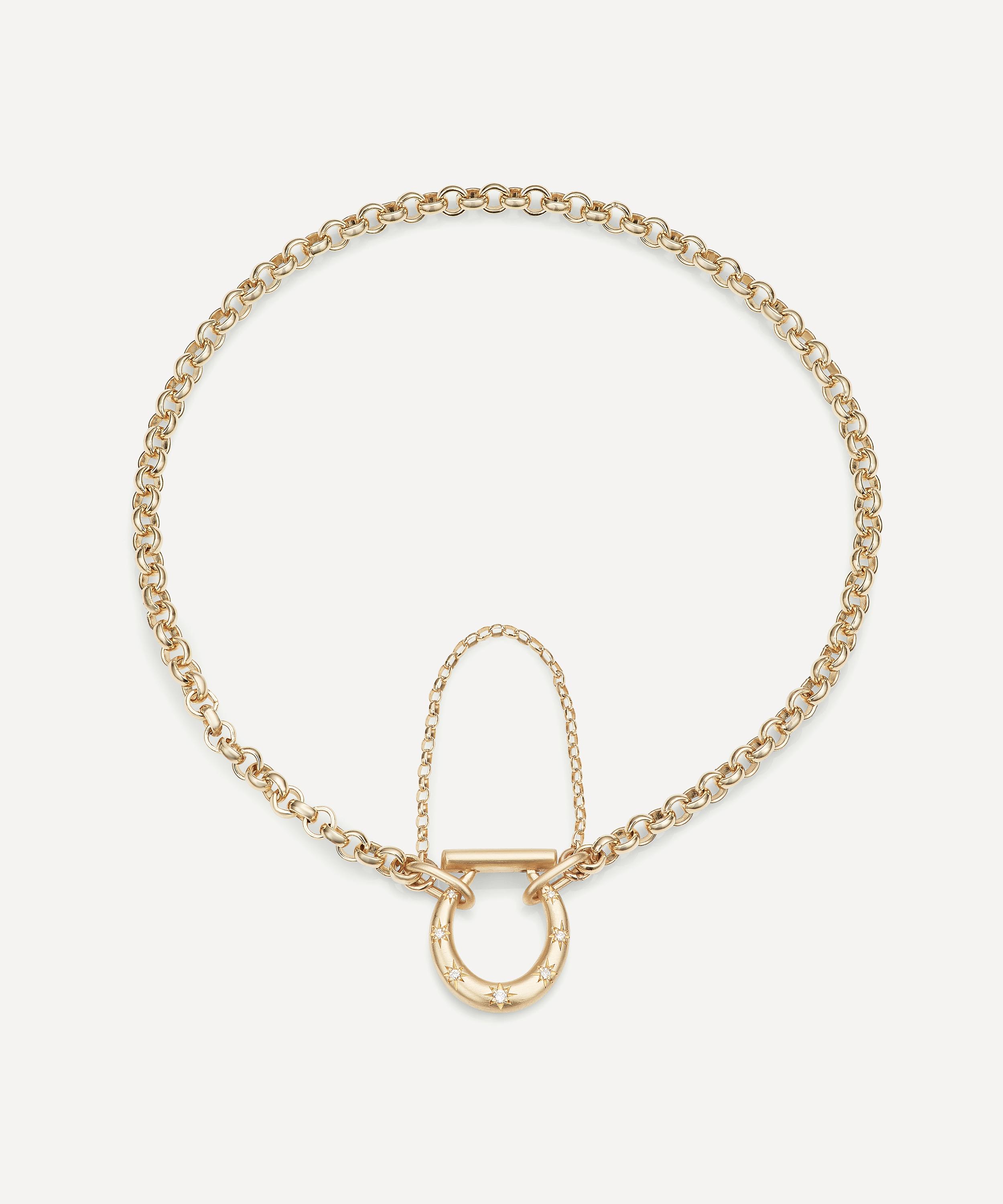 Handcrafted from frosted 18 carat gold, this elegant piece boasts a heavy chain design, complete with a horseshoe-shaped clip closure, a mythical symbol of luck and protection steeped in centuries of history – complete with seven sparkling, brilliant cut diamonds, a nod to an age-old Irish proverb.