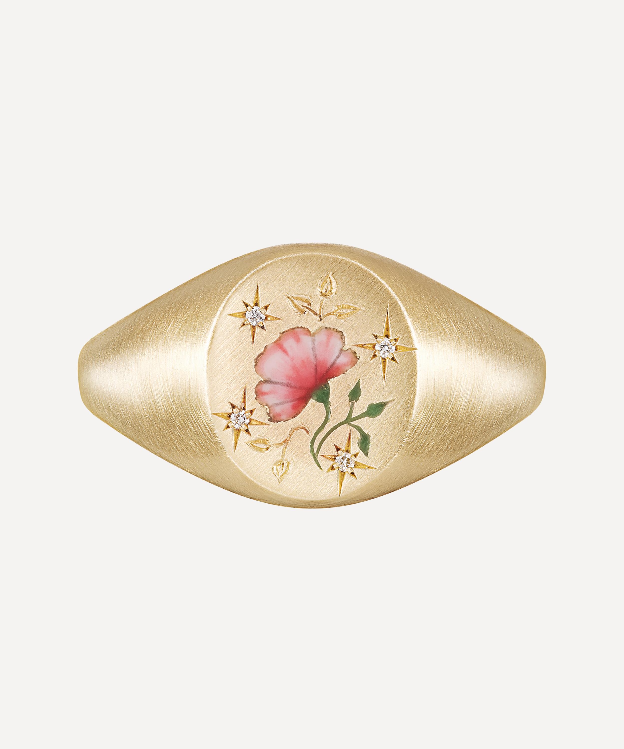 Handmade in London from frosted 18 carat gold, this signet ring features an oval-shaped face with a hand-painted enamel rose. The delicately drawn flower is brought to life with finely engraved leaves and four star-set white diamonds around the edge. A wearable work of art, it's perfect for gifting or adding to your own jewellery line-up - style it solo or mix and match with other favourites.