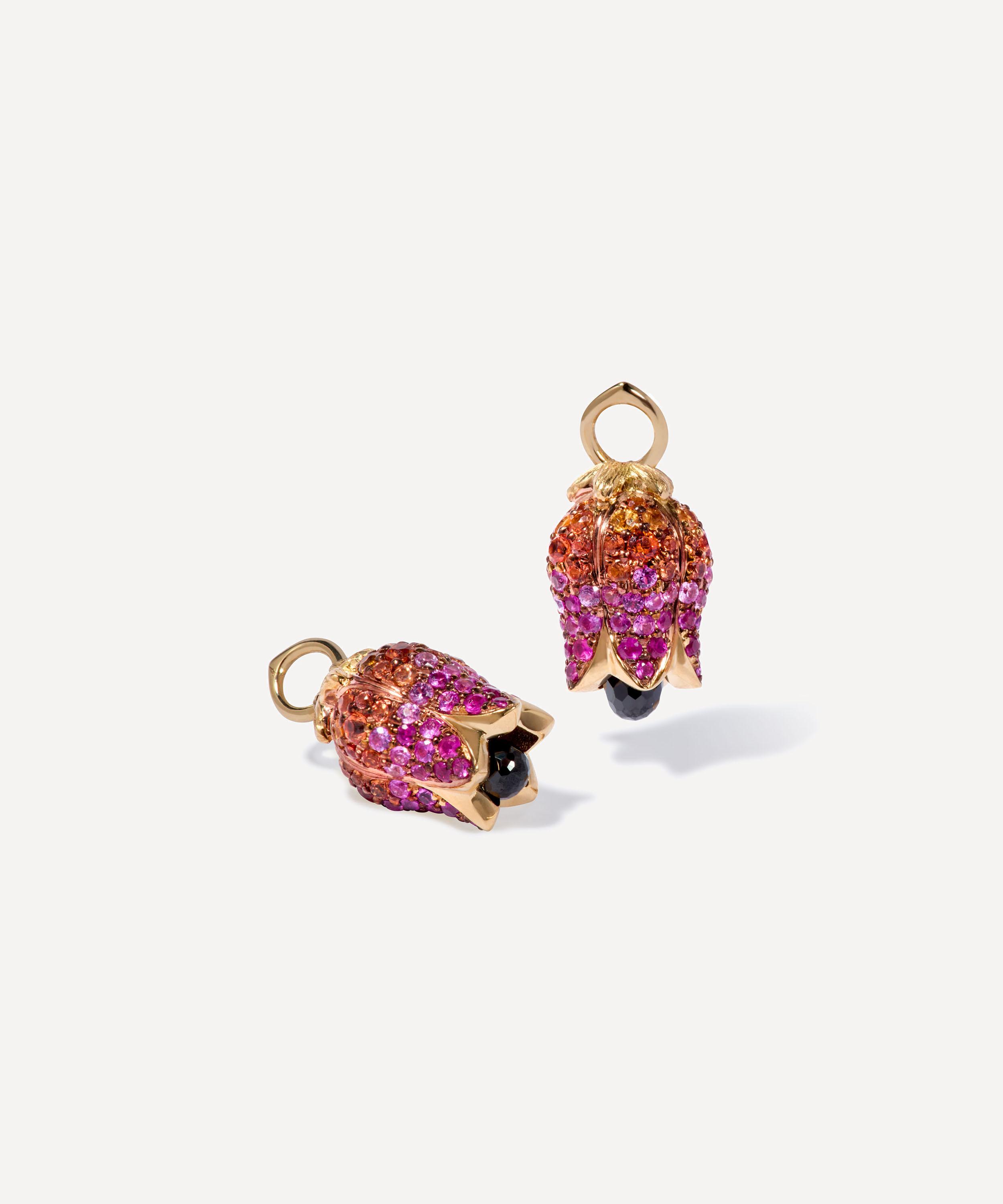 Inspired by Annoushka's love for nature, each delicate earring drop is crafted by hand from 18ct gold with orange and pink sapphires to form a delicate tulip, finished with a tiny briolette spinel emerging from the downward bloom for a subtly swaying shimmer. Attach them to a pair of classic gold or diamond-encrusted hoops for an instantly elevated look.