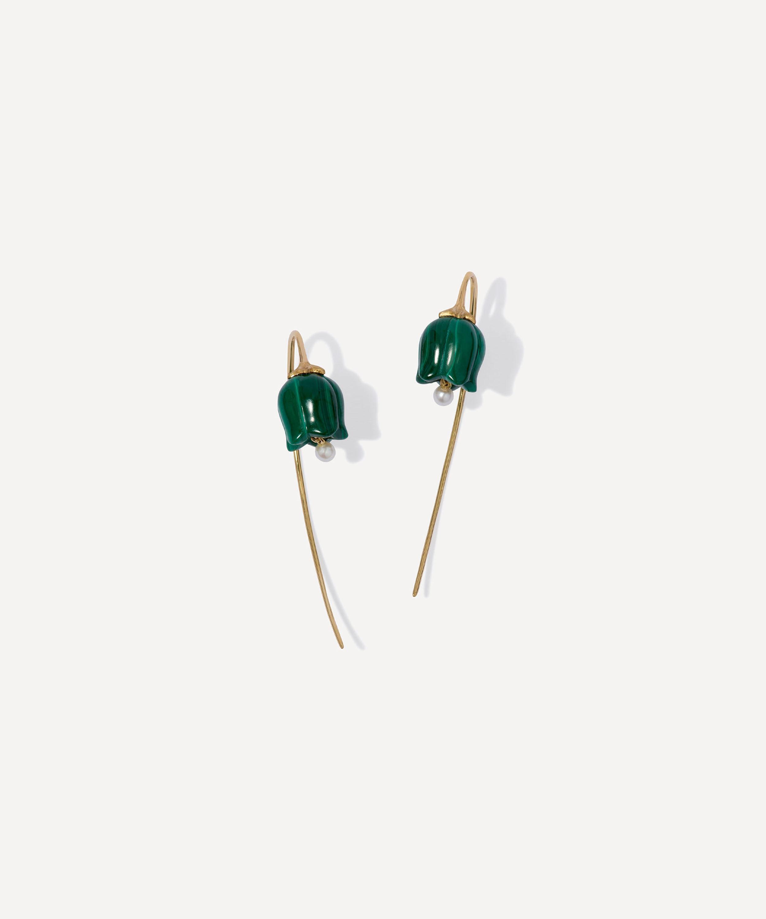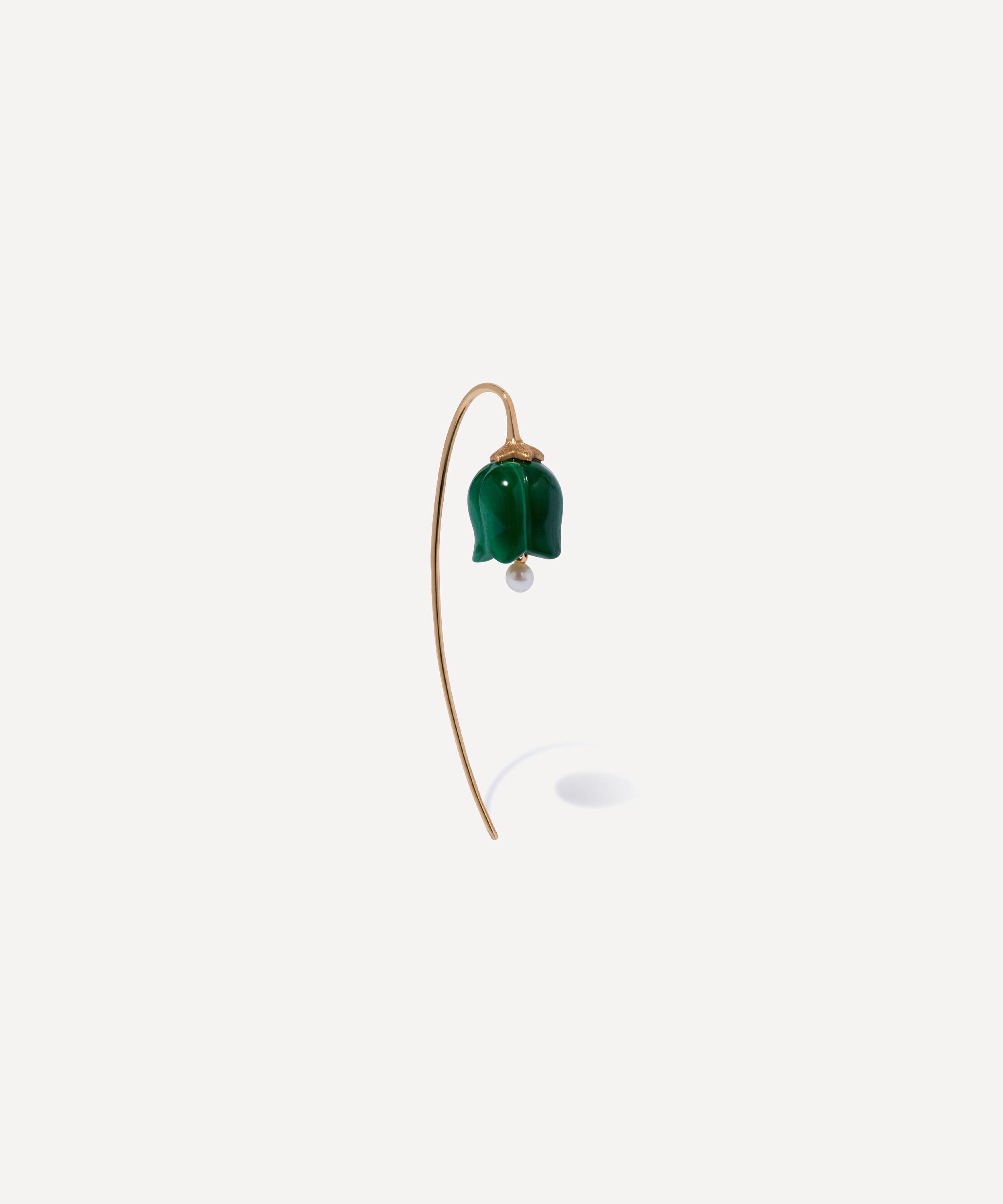 Inspired by the elegance of a blooming tulip, this intricately handcrafted pair feature sculptural petals in green malachite, beautifully enhanced by a tiny freshwater pearl emerging from the downward bloom for a subtly swaying shimmer. Complete with sleek French hooks in 18ct gold, they can be styled solo or paired with a selection of hoops and studs.