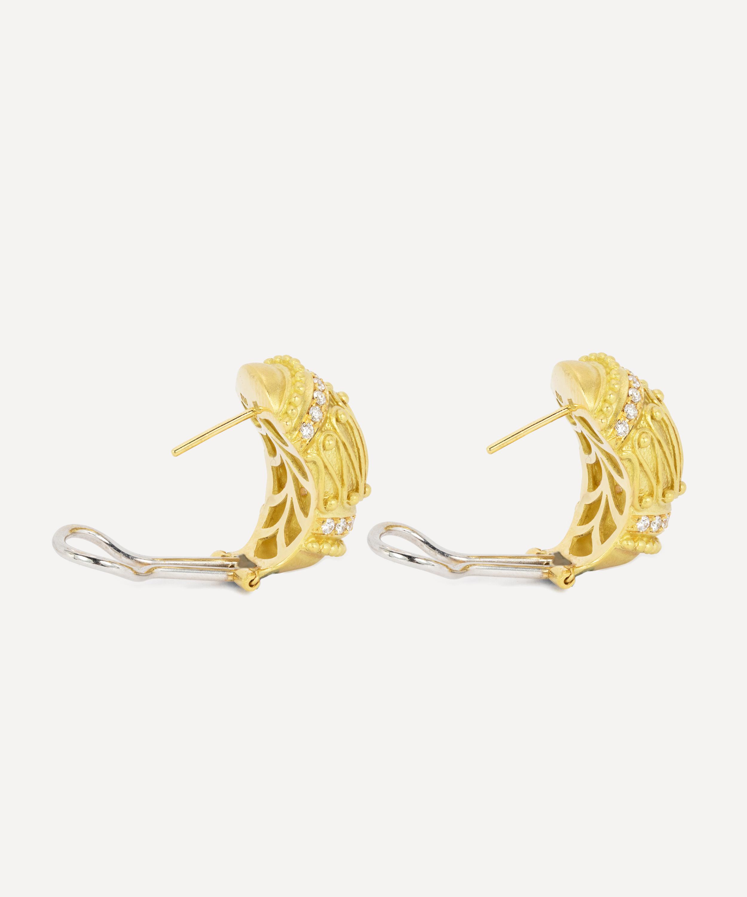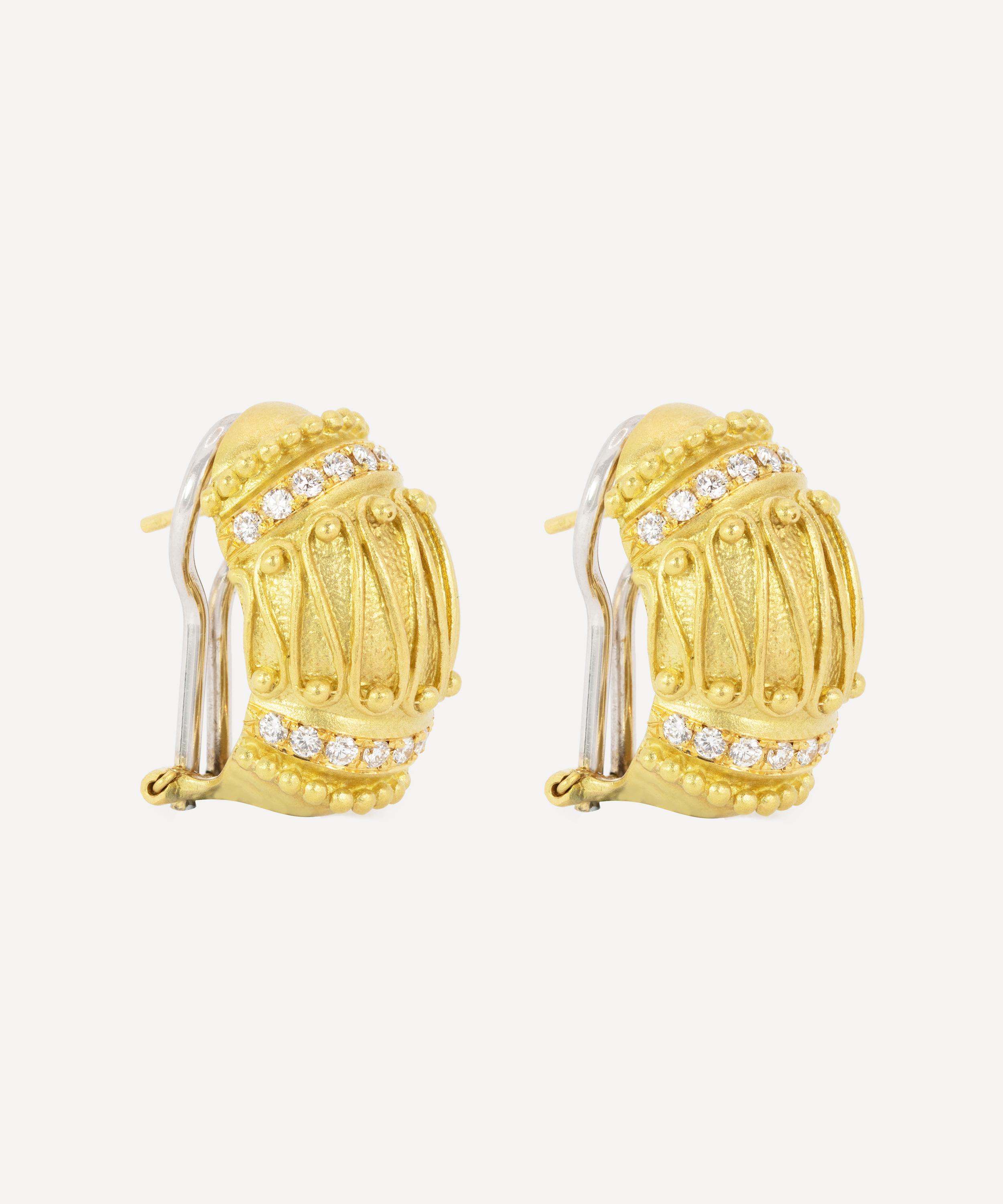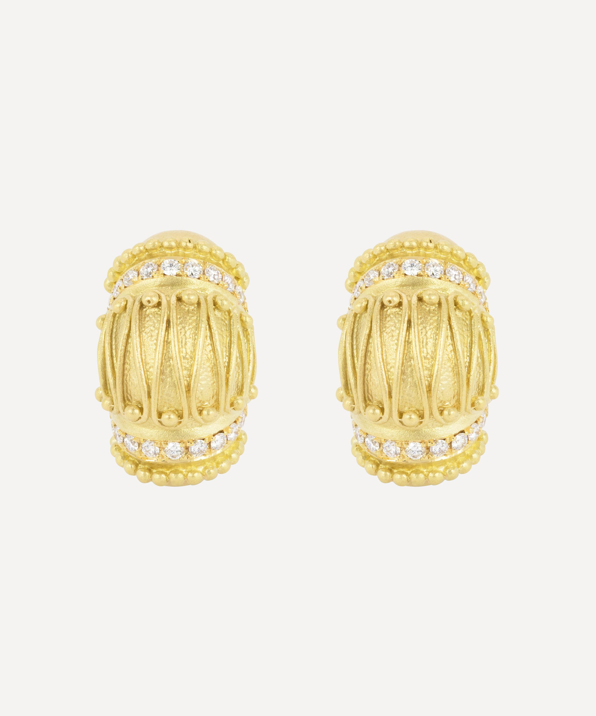 Switch out your everyday pair with these vintage diamond hoop earrings from antique purveyor Kojis. Crafted from 18ct gold, each earing features a half hoop with Etruscan style detailing. The top and bottom of the earrings is finished with a decorated edge of small gold balls, under which sits a line of round brilliant cut diamonds.