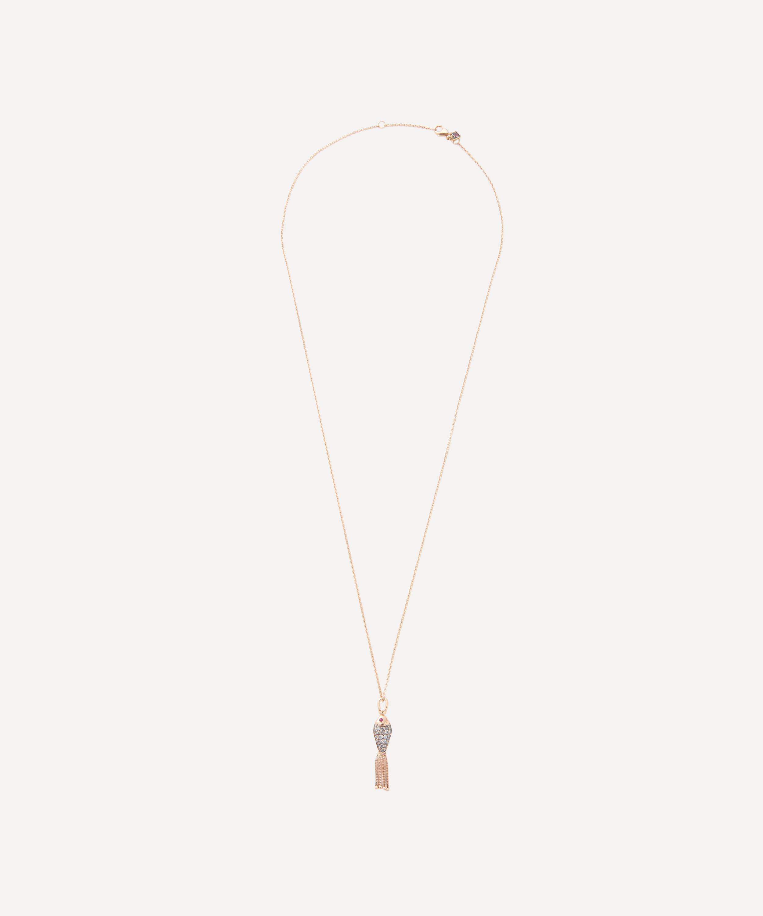 Spring for Selim Mouzannar’s Fish For Love pendant necklace to add a playfully elevating accent to everyday looks or occasion wear. Crafted from 18ct rose gold, it features a fine cable chain and charming fish pendant adorned with chain fringes and a reversible design of diamonds and mint-green enamel scales. Complete with two ruby set eyes, it can be worn solo or layered to create an eye-catching curation of jewels.