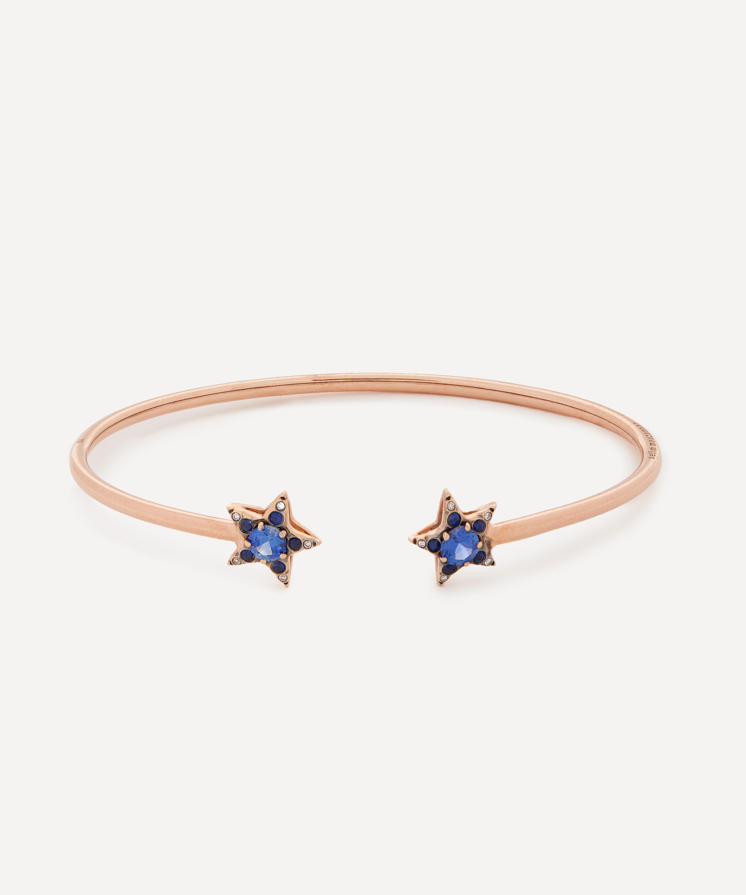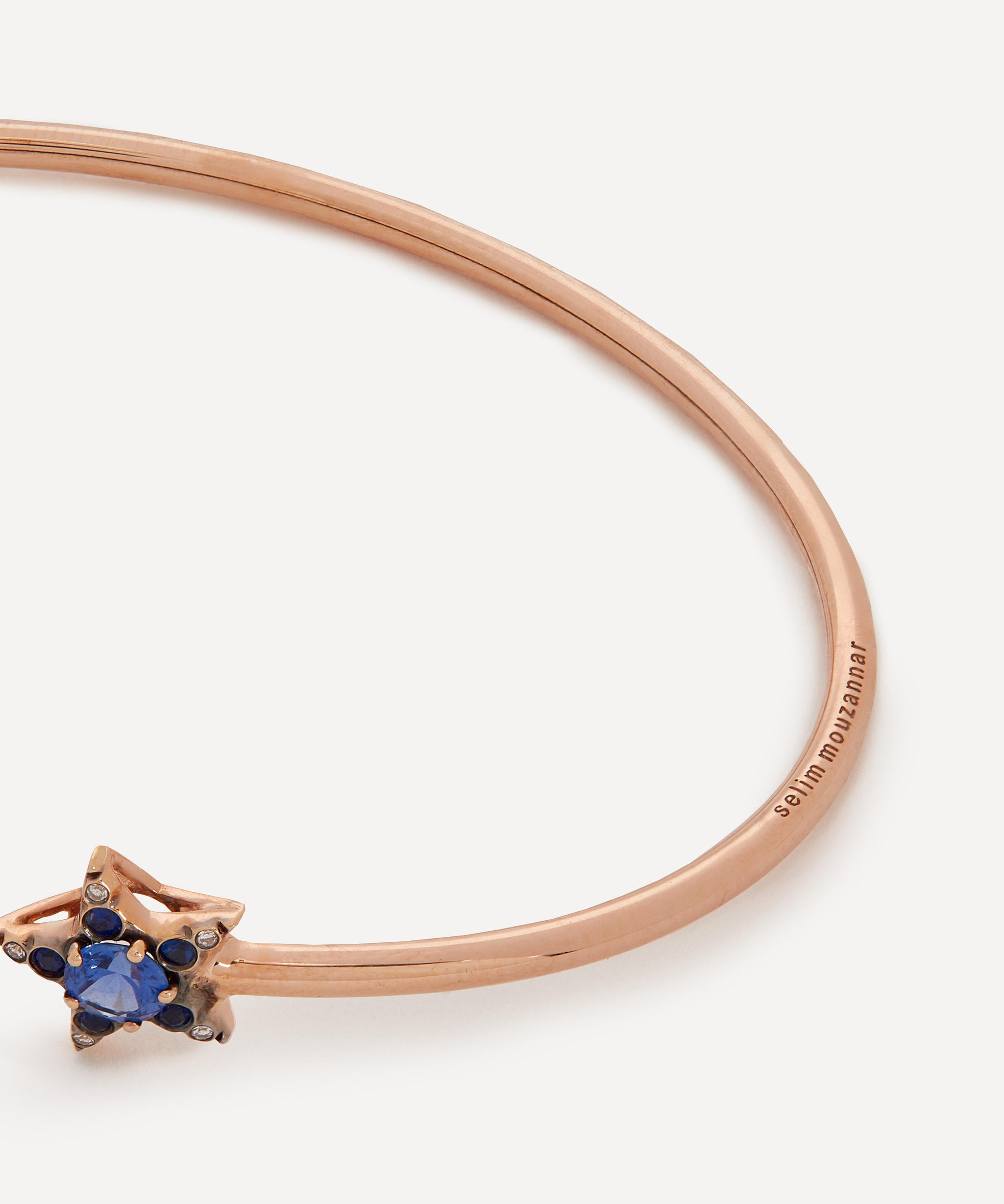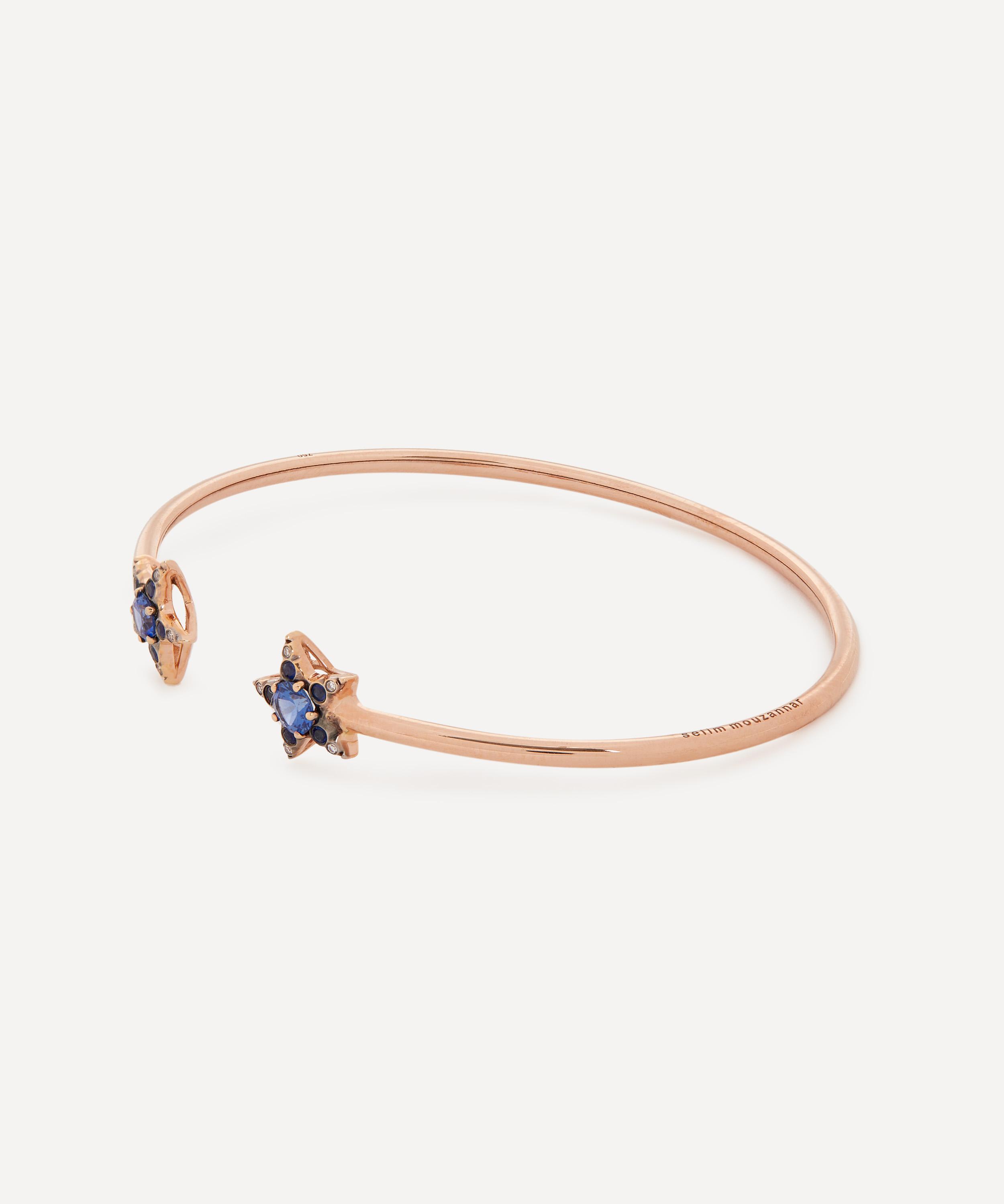 A sparkling symbol of success and self-confidence, this cuff bracelet is part of Selim Mouzannar's Istanbul collection. Drawing on the ancient history of the vibrant Turkish city, the Istanbul collection recreates the myriad of stars that shone down on the Ottoman Empire. Handcrafted from 18 carat rose gold, this bracelet features a slim cuff and two five-point stars at either end, adorned with a blue sapphires and sparkling diamonds.