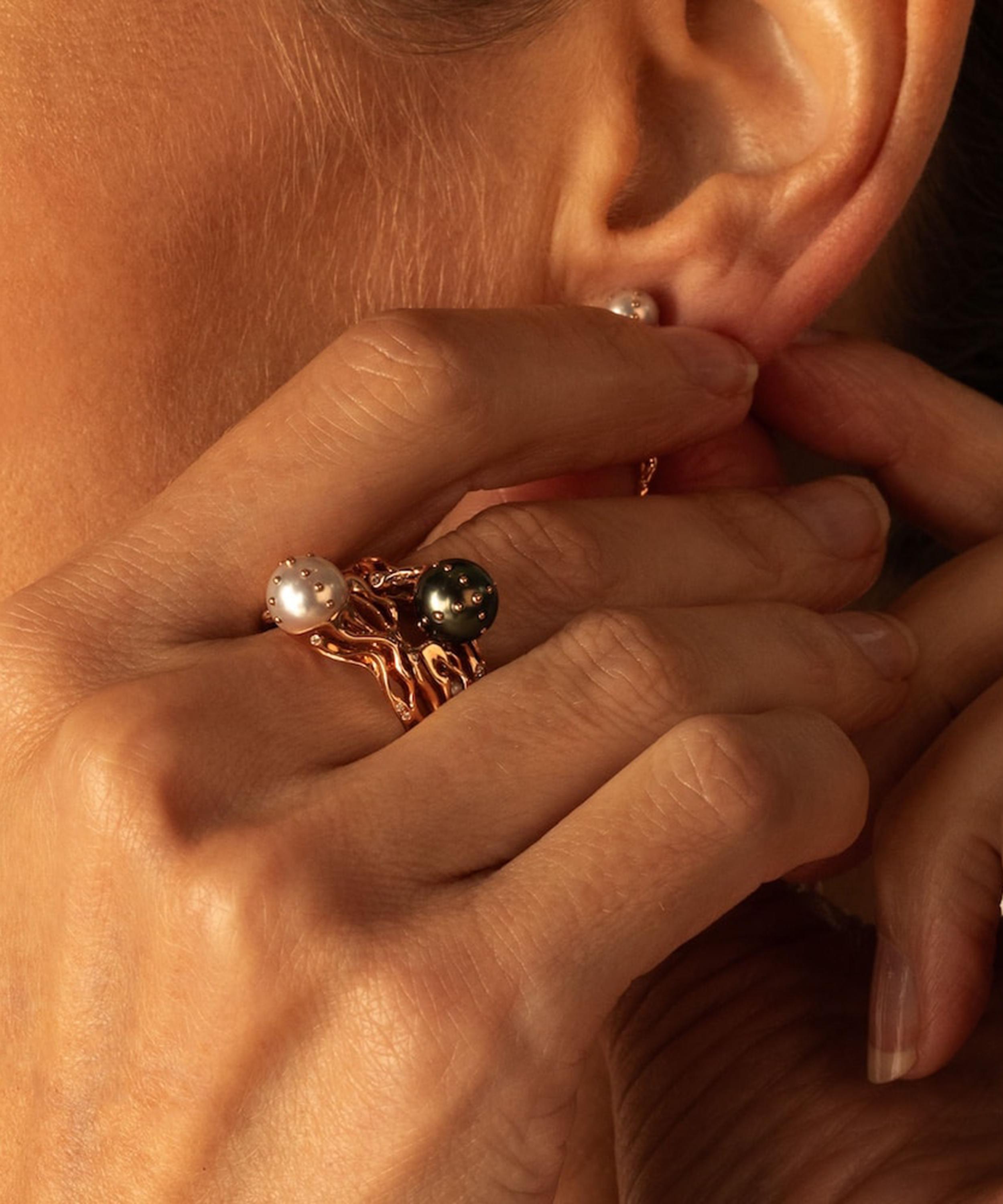 Inspired by the mysteries of the ocean and its secrets hidden beneath the waves, this piece captures the fluid grace of a jellyfish’s tentacles encased in 18ct rose gold. Featuring an otherworldly dance of movement and mystery, its organic silhouette is set with a luminous white pearl and glittering diamonds embedded in the shank, reminiscent of the sun’s shimmering rays dancing upon the water’s surface. Whether styled in a curated ring stack, or as a statement piece, wear it as a symbol of your own evolution – untamed, unapologetic, and entirely unique.