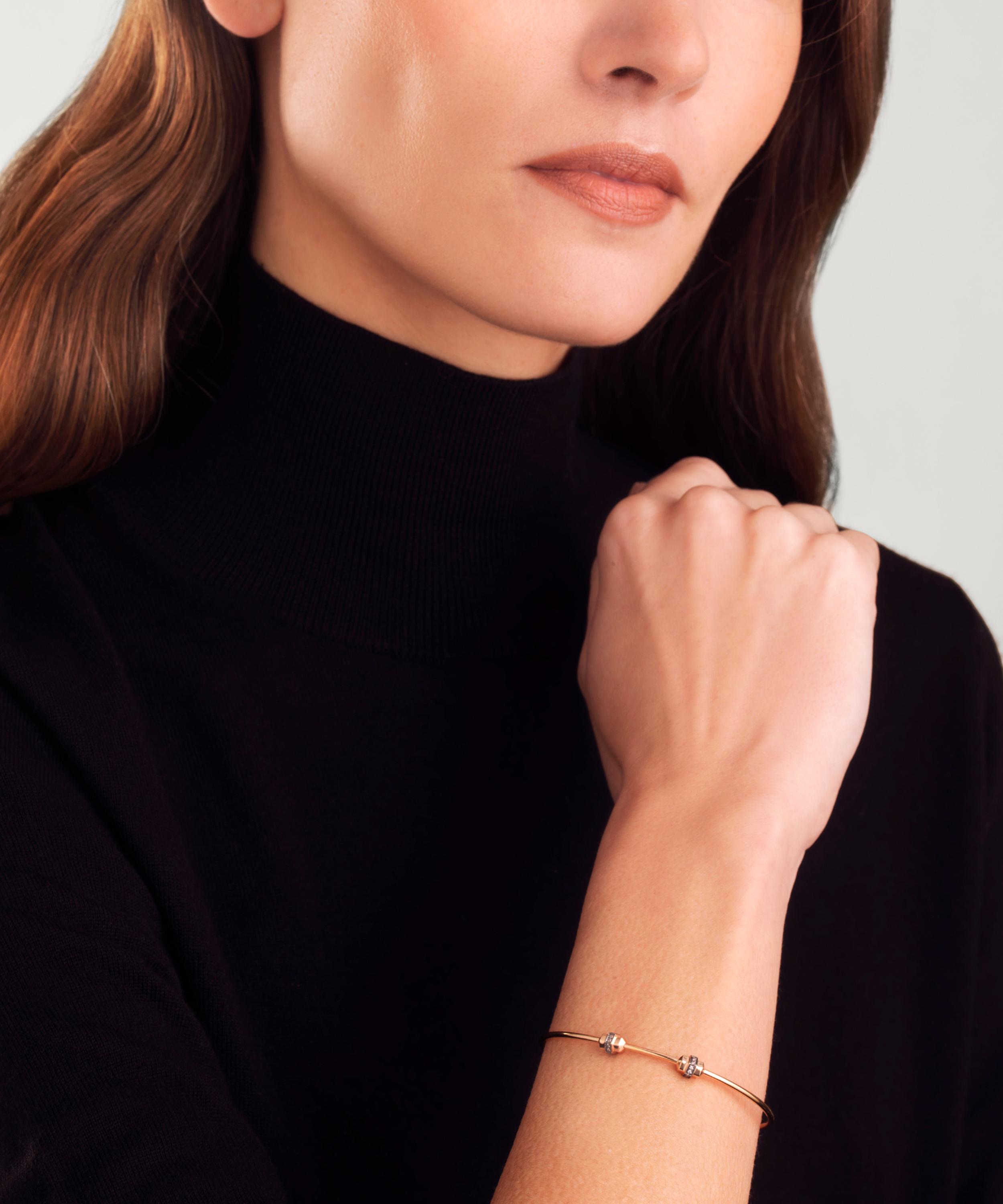 This understated 18 carat rose gold bangle is a perfectly polished piece featuring a unique screw nut clasp encrusted with 0.12 carats of glittering white sapphires. Designed to showcase your favourite charms, the clasp allows for a whole host of adornments to be threaded onto this classic slim cuff, which also styles beautifully as a solo statement piece - perfect for everyday.