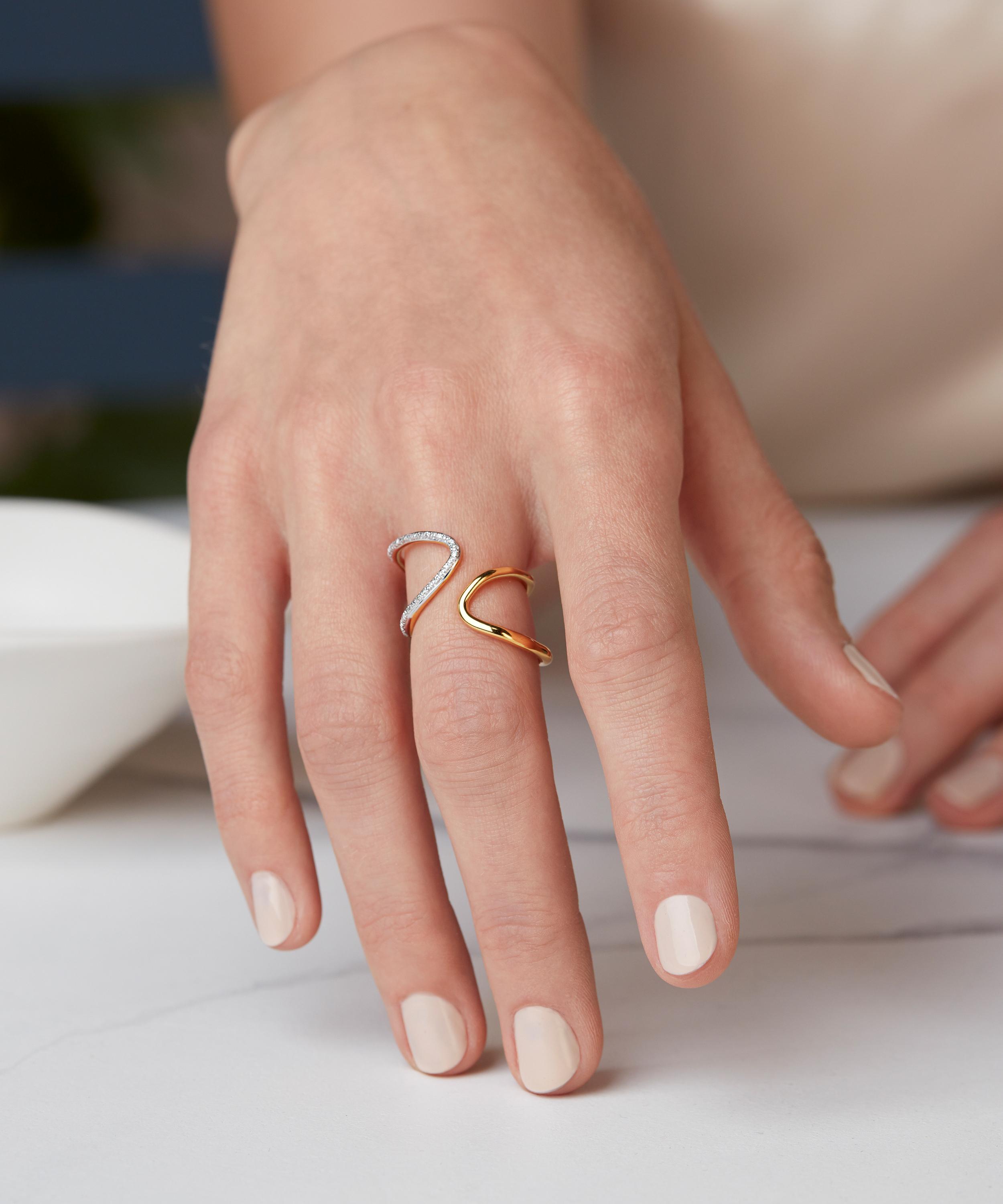 A sculptural reinterpretation of Riva's distinctive wave shape, this ring has an open wrap design with two curved tips at the front - one with a plain, polished finish and the other with a glittering white diamond pavé. Perfect for both day and night dressing, style it solo to shine a spotlight on the unique design, or mix and match with other diamond-encrusted Riva styles for a carefully curated evening look.