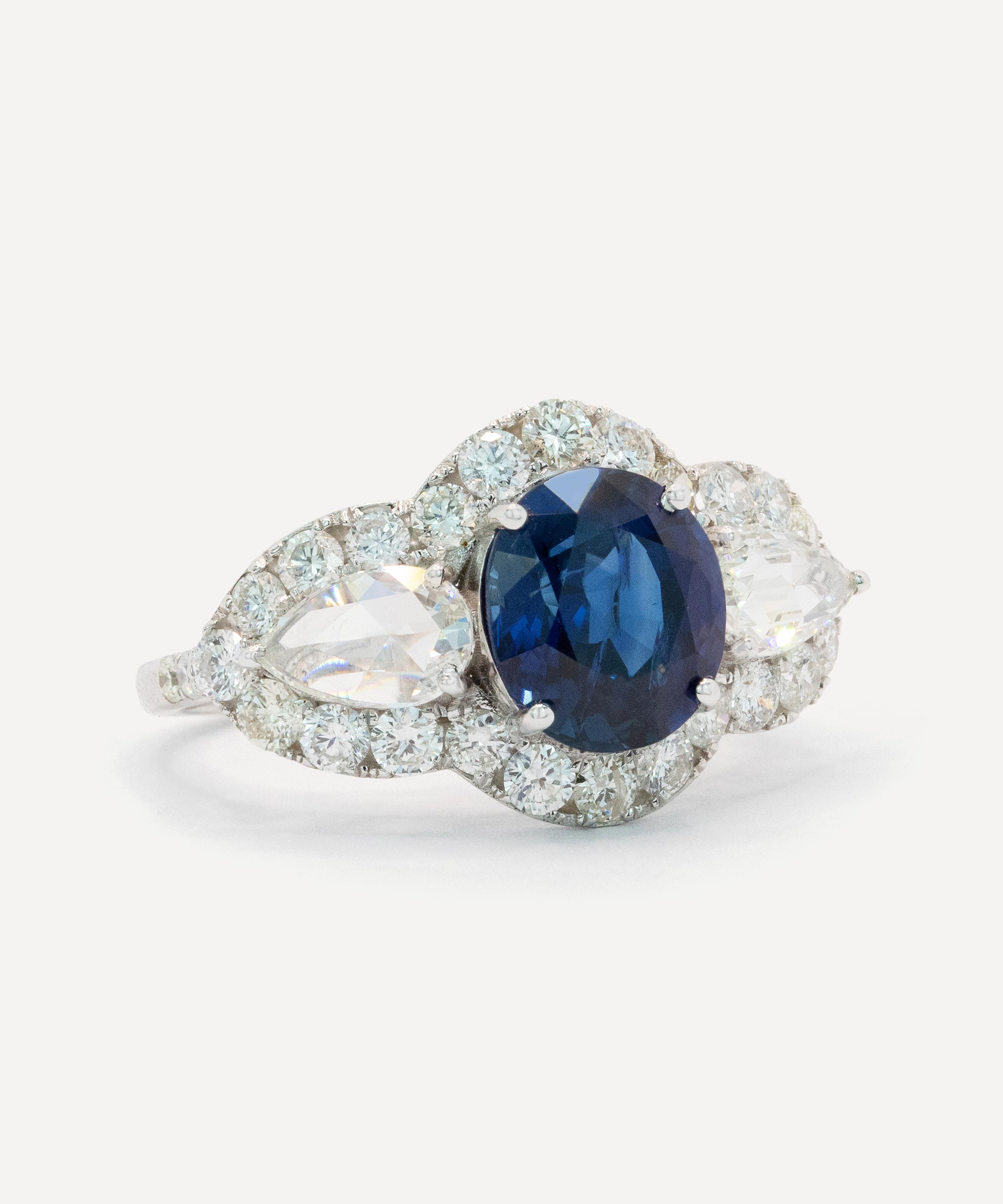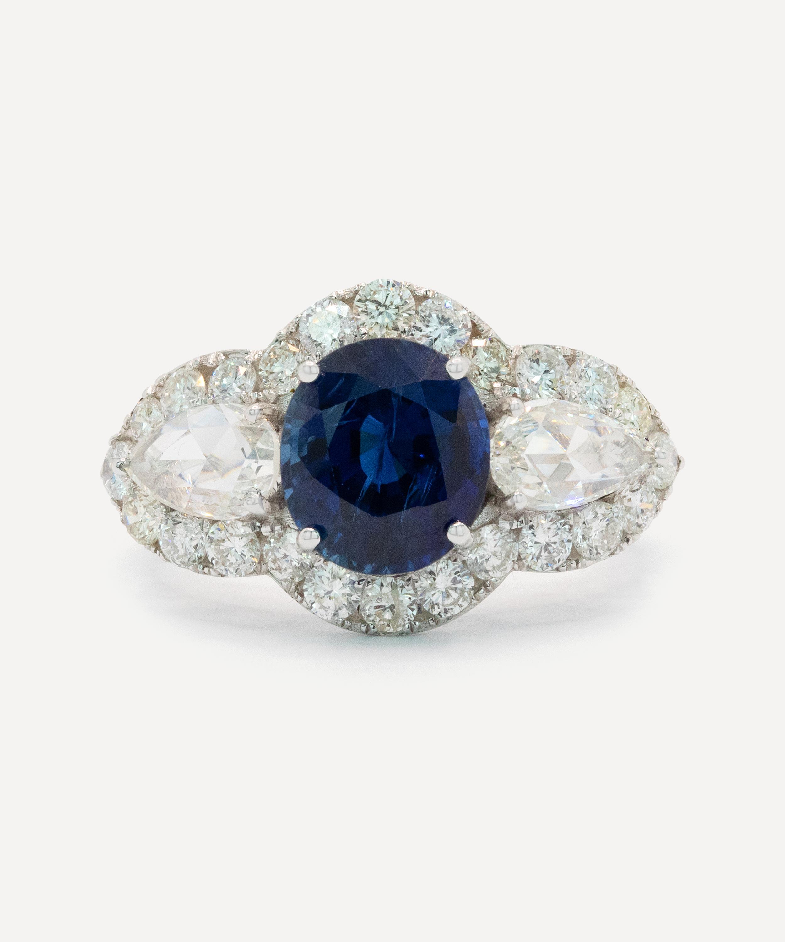 Add lustre and glam to your ring stack with this show-stopping, one-of-a-kind ring from antique purveyor Kojis. Crafted from 18ct white gold, it centres around a blue sapphire, set between two rose-pear cut diamonds. The three central stones are surrounded by a cluster of round brilliant cut diamonds, leading to diamond set shoulders and a polished band.