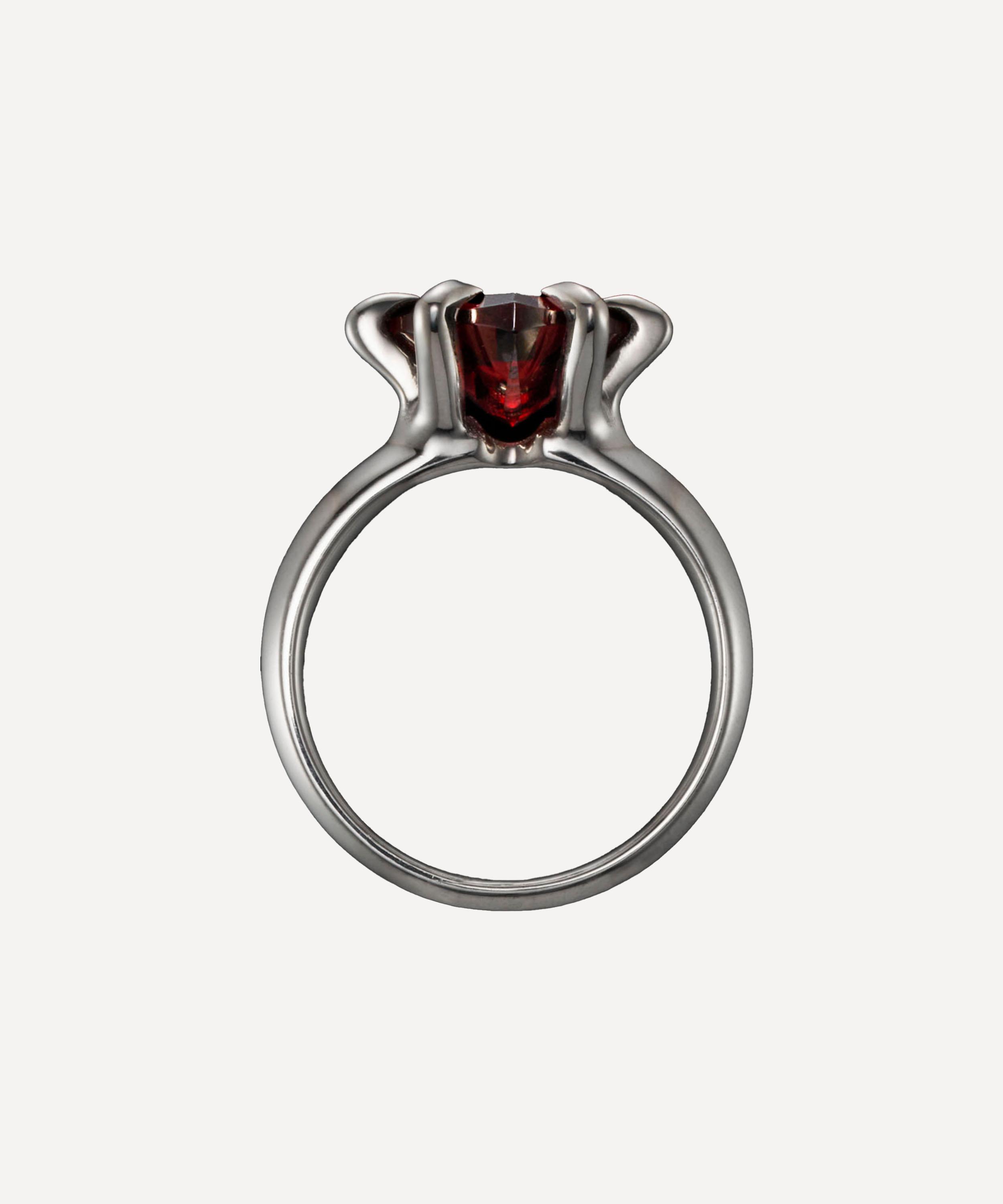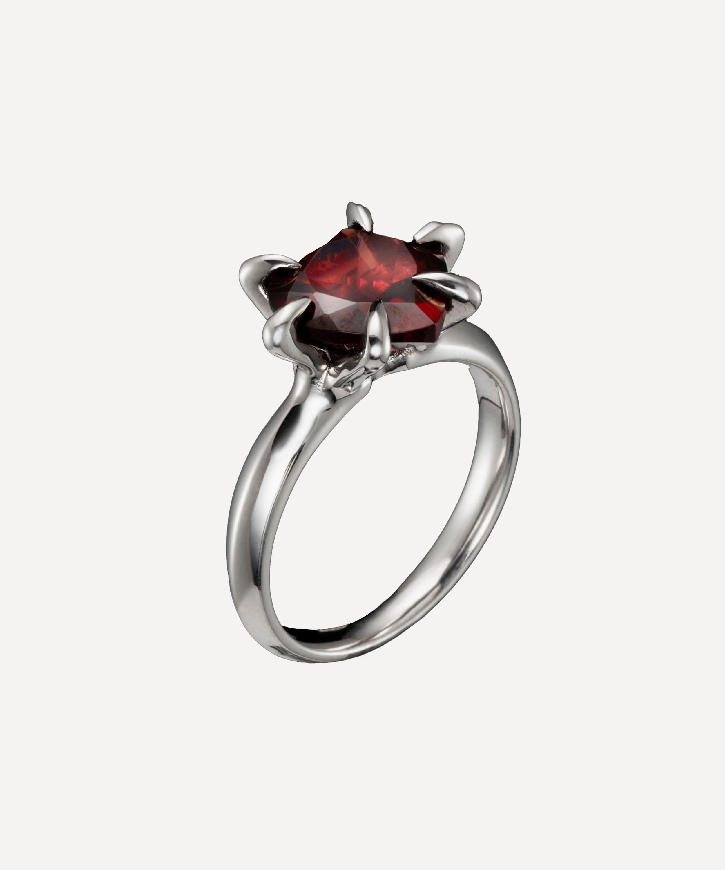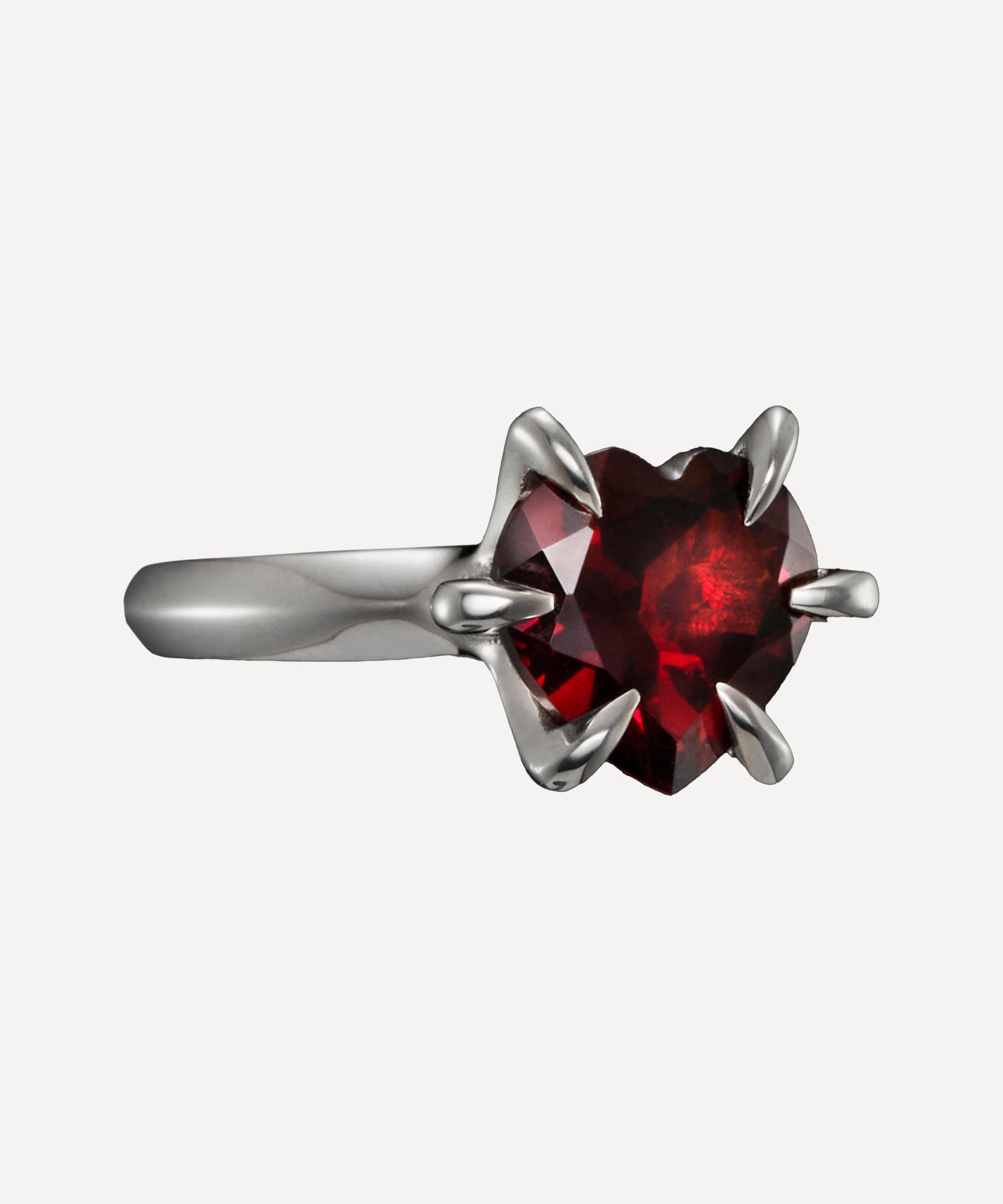 Breathe new life into your jewellery box with the Captured Heart ring from Maria Nilsdotter. Exuding endearing beauty with gothic undertones, it centres around a claw set red garnet heart on a slim band in 18ct white gold – boasting a reinterpretation of the classic engagement ring. Perfect for both occasion wear and elevated everyday looks, style it solo, incorporate it into a stack, or pair it with matching pieces from the brand.